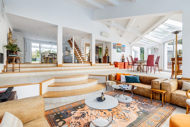 Accessible from the kitchen, two other bedrooms, one of which has a private bathroom, are located near the technical room, bringing a practical touch to this part of the house. A mezzanine, converted into an office, overlooks the vast reception room, creating a cozy and warm space, a true intimate observatory of the entire place. Finally, an elegant staircase starting from the living room leads to the fifth bedroom which also benefits from its own bathroom and toilet, offering each member of the family or guests a comfortable and independent living space.