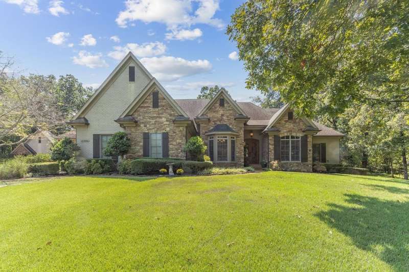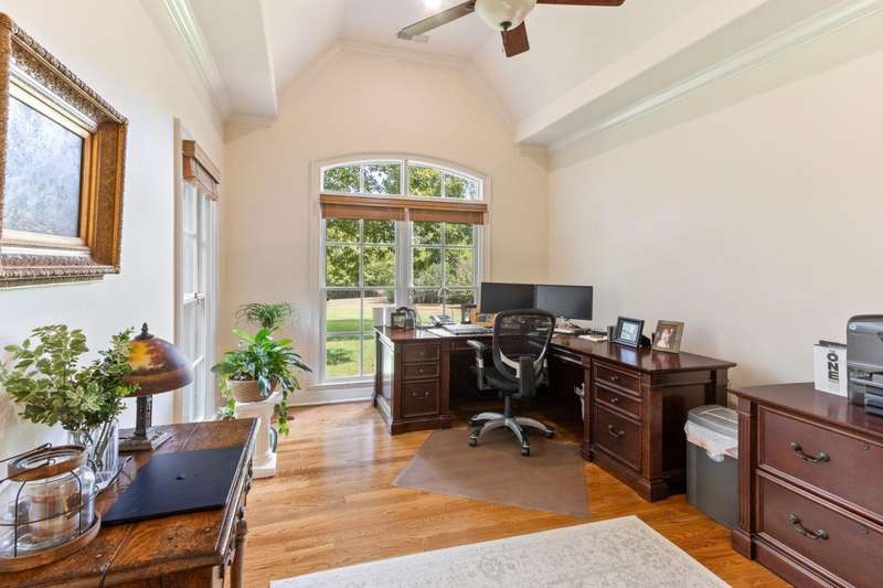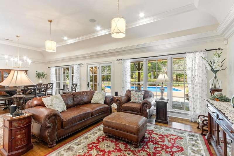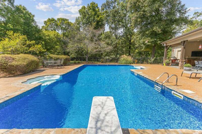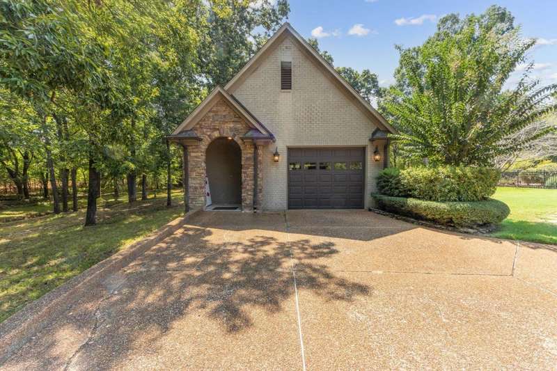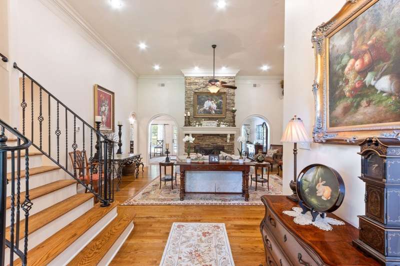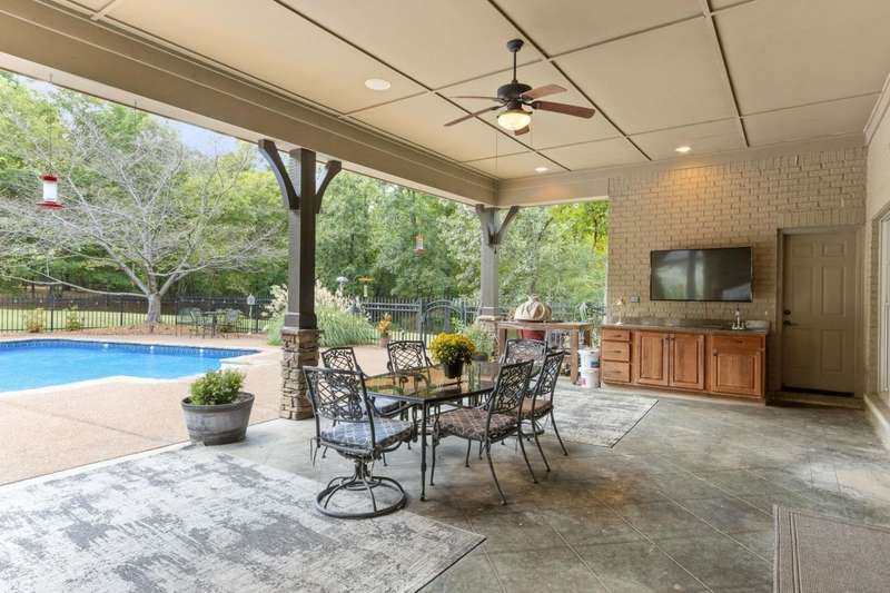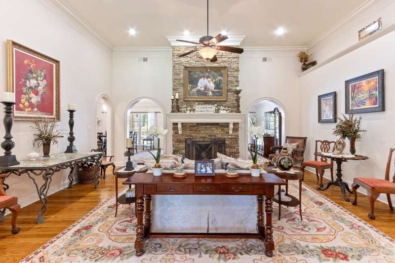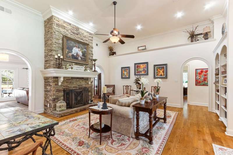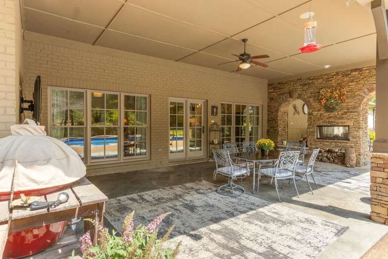 Custom designed and quality constructed by Hunter Ryan, this home impresses throughout it's thoughtful interior & outdoor spaces. Offering a perfect floor plan with 4 bedrooms & 3.5 baths down, and an oversized 5th bedroom (or bonus) w/full bath up, the capacious entertainment spaces in between offer light-filled rooms, tall, smooth ceilings, custom heavy moldings, a freshly painted interior, beautiful new lighting, stone fireplaces & a kitchen that delights! The covered rear porch offers a double sided fireplace, an outdoor kitchen, a heated/cooled 1/2 bath, with views of the glistening pool, fountain, and lush mature landscaping. There are 2 double side-load garages + a detached insulated drive-thru garage w/half bath & water heater that can be finished to expandable space, or enjoyed by the man of the house. Temp controlled storage in main garage & expansive walk-in attic/storage. Nestled on 4+ acres surrounded by nature, with deer and hummingbirds visiting daily. A MUST SEE!!!
