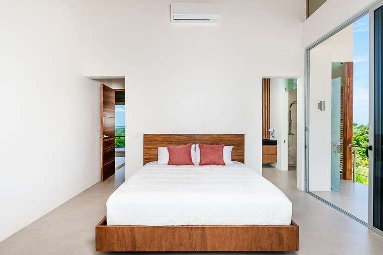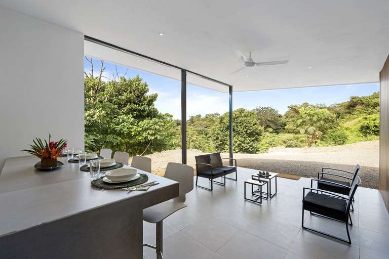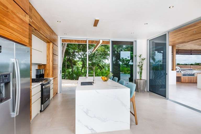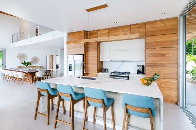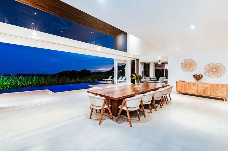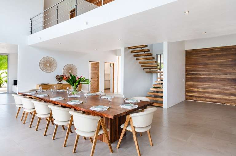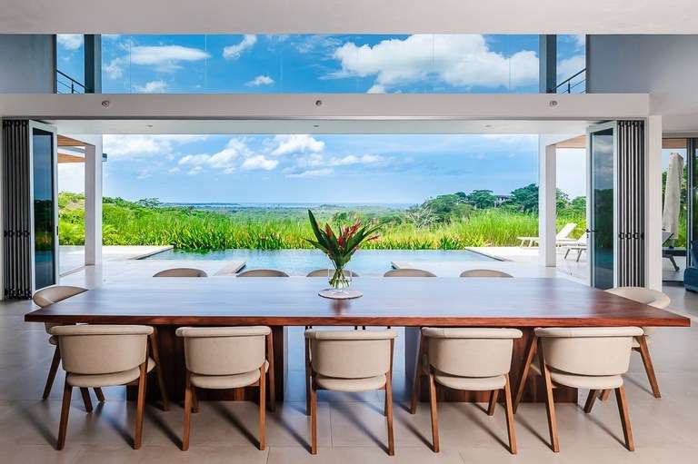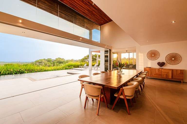 The dining room acts as the heart of the home and is a showstopper. It features a custom made Guanacaste wood dining table that seats 10, impressive accordion- style doors that open to provide 10 meters of prime, open space with ocean views; and floor-to-ceiling windows that stretch two stories high. From this dramatic center of the home, it is hard to tell with the sky ends and ocean begins.