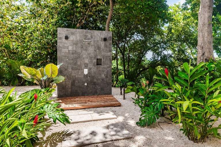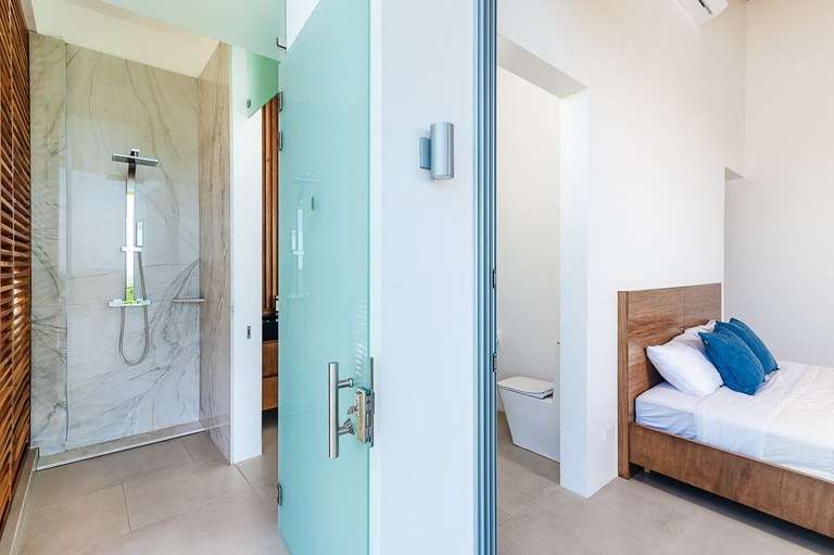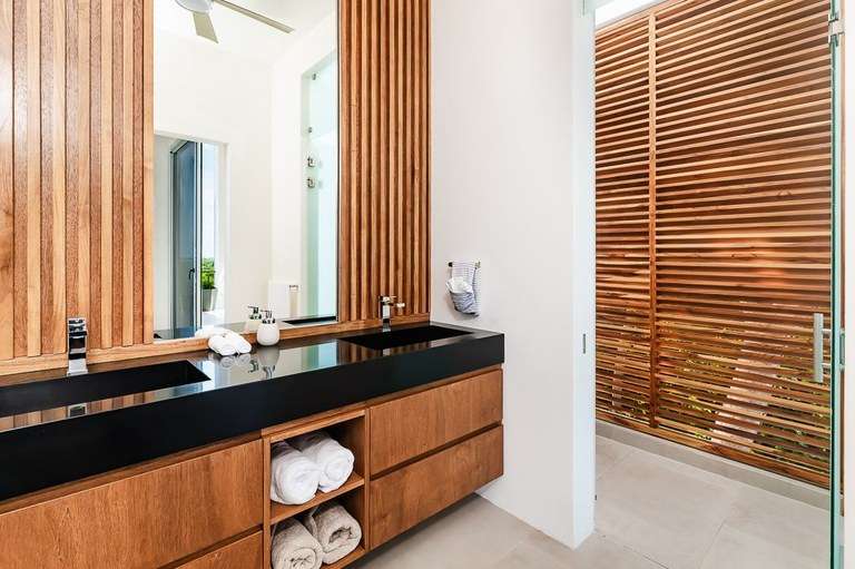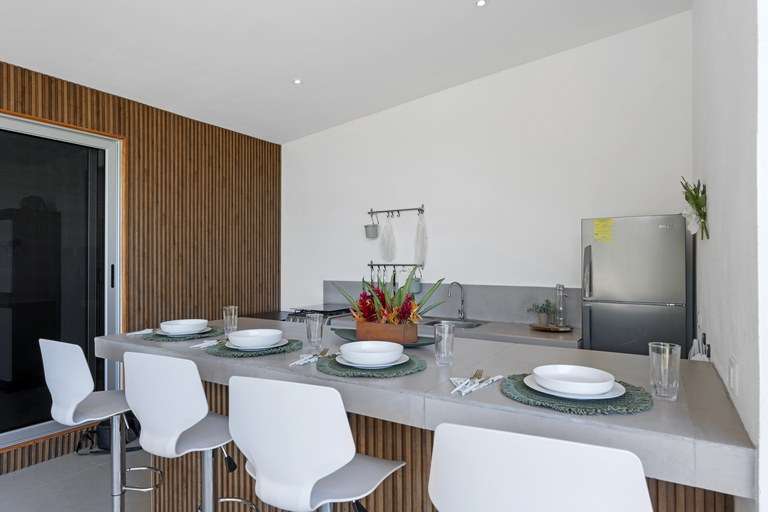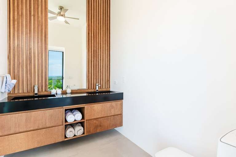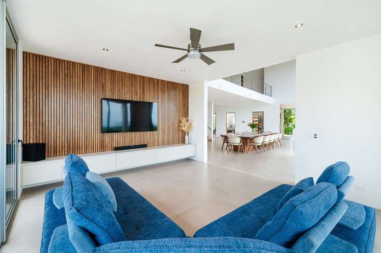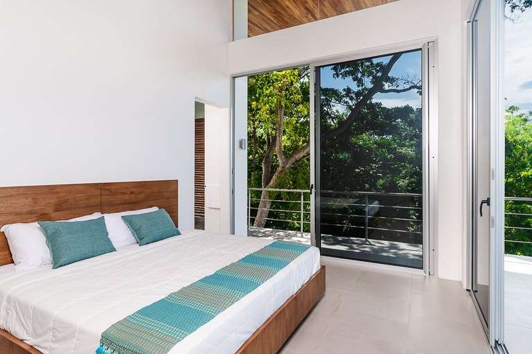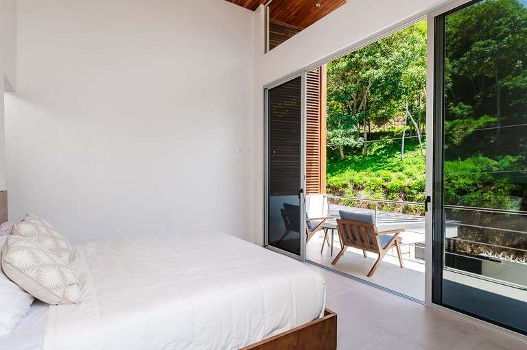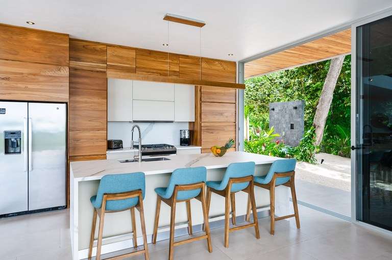 The dining room acts as the heart of the home and is a showstopper. It features a custom made Guanacaste wood dining table that seats 10, impressive accordion- style doors that open to provide 10 meters of prime, open space with ocean views; and floor-to-ceiling windows that stretch two stories high. From this dramatic center of the home, it is hard to tell with the sky ends and ocean begins.