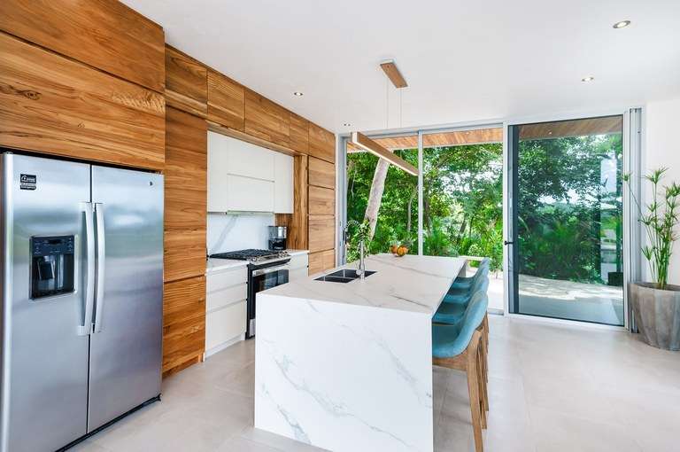 The kitchen is a chef's dream and consists of stainless steel appliances, a beautiful island with quartz waterfall edges that doubles as a four-person breakfast bar, and striking, hardware free TEAK cabinets, resulting in a clean and sophisticated look.