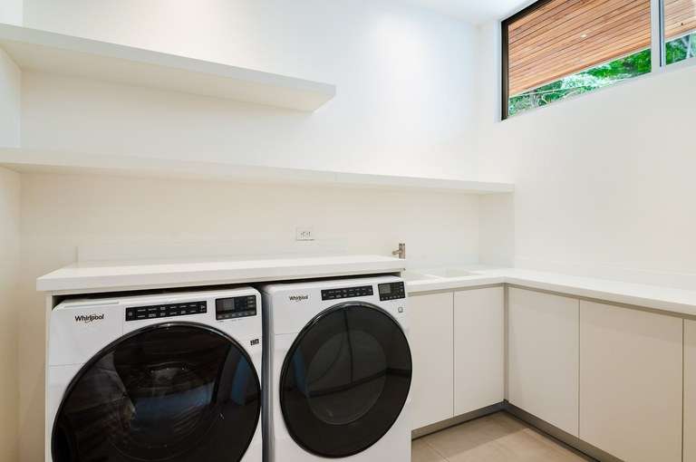 This home also has dueling principle bedrooms, each of which have custom made hardwood furniture, en-suite baths with high-end finishes, and sliding glass doors leading out to a private balcony with amazing ocean views. There are five bedrooms in total, along with a great 'flex' space that has a murphy bed, perfect for a 6 th bedroom, a home office, art studio, or workout space.
