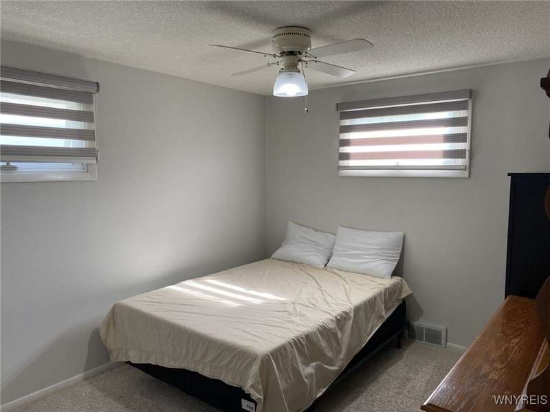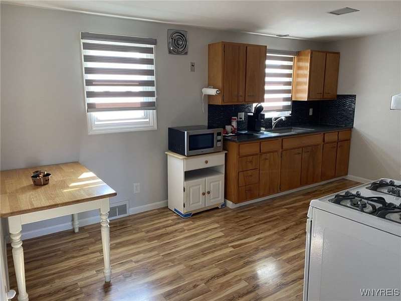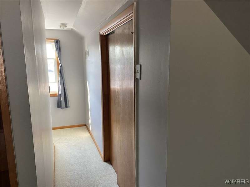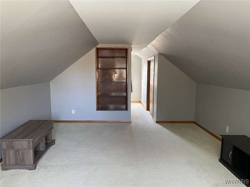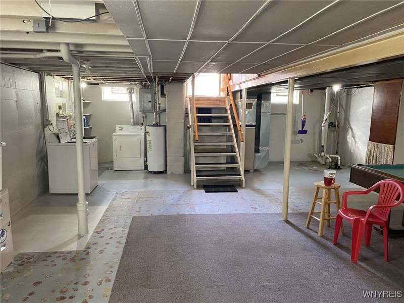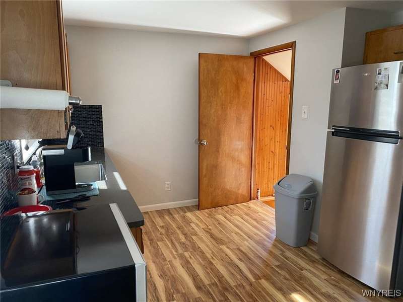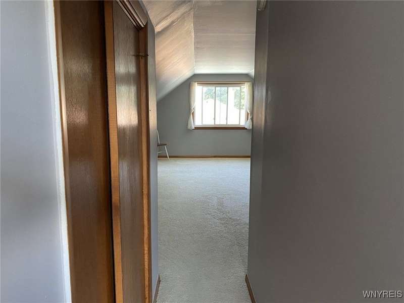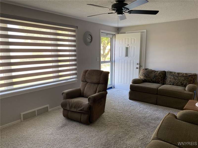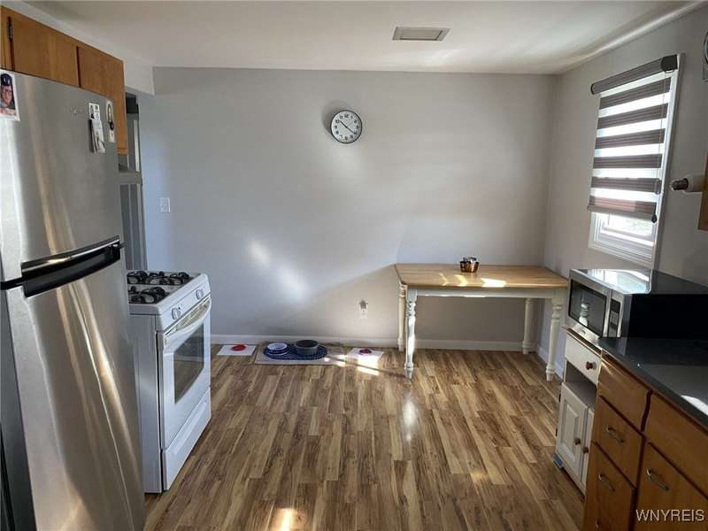 Pampered inside and out! This spacious MAINTENANCE FREE 3 BR, 1 Bath Cape style home offers move in condition. Custom blinds, updated flooring, and oversized 2 car garage -ONE SIDE FOR CAR - THE OTHER SIDE FOR STORAGE. Kitchen stove and refrigerator and basement dryer all included in as is condition on the day of closing. 2nd Floor SPACIOUS 3rd Bedroom. Full basement with laundry - POOL TABLE STAYS!!! Convenient location only mintures to thruway and stores and restaurants. YOU SNOOZE YOU LOSE!