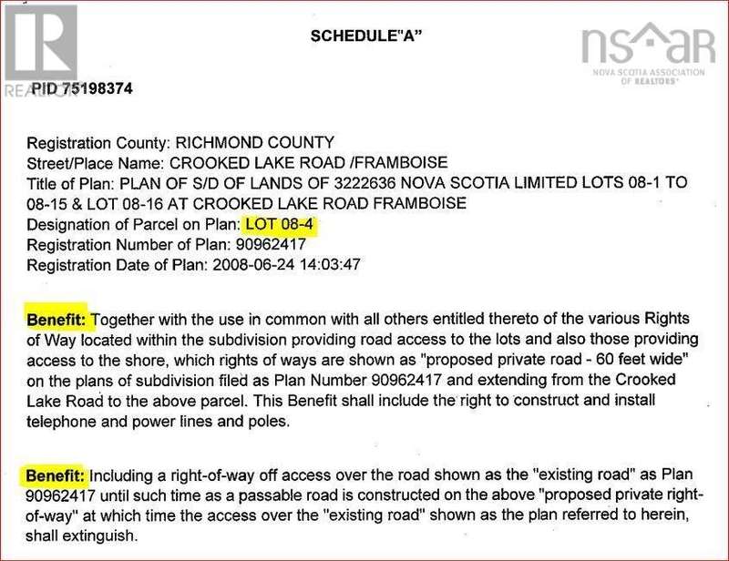 Discover the ultimate private retreat on 5 acres of pristine land, boasting 1350 feet of shoreline on a freshwater lake at the end of Cemetery Rd, Crooked Lake. Perfect for fishing, ATV adventures, and any nature enthusiast, this secluded property offers an off-grid lifestyle, as electricity is not nearby. Just minutes away, explore Morrison (Framboise) Beach, one of Cape Breton's hidden gems of sandy shores at the end of Crooked Lake Rd. It's Beautiful!! Alternatively, paddle from your property to the Framboise River, where you can journey miles upstream, around lakes, or even cross into the ocean. The land is registered, and NS Environment comments the lot is suitable for on-site sewage (permit required). *Shown in Listing Pictures* Current Benefit Right-Of-Way Deeded Access for "existing road", please see listing pictures for more information. For full listing details with drone footage go to Realtor.ca MLS#202421000 Latitude/Longitude (copy paste into browser to see on maps >) 45.702490°, -60.341591° (id:2494)