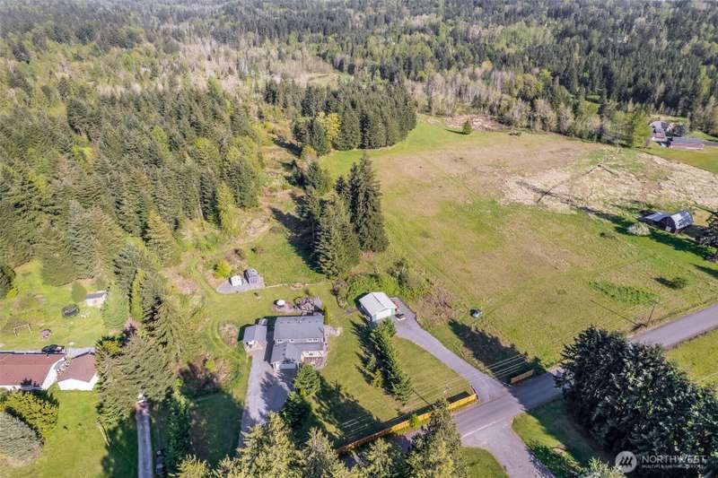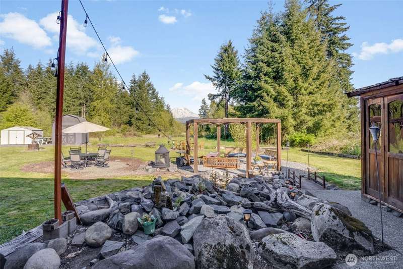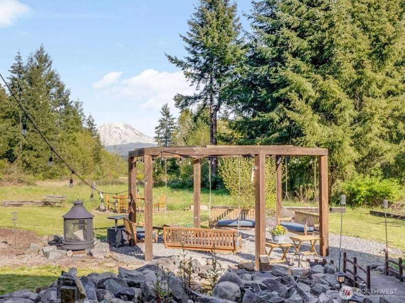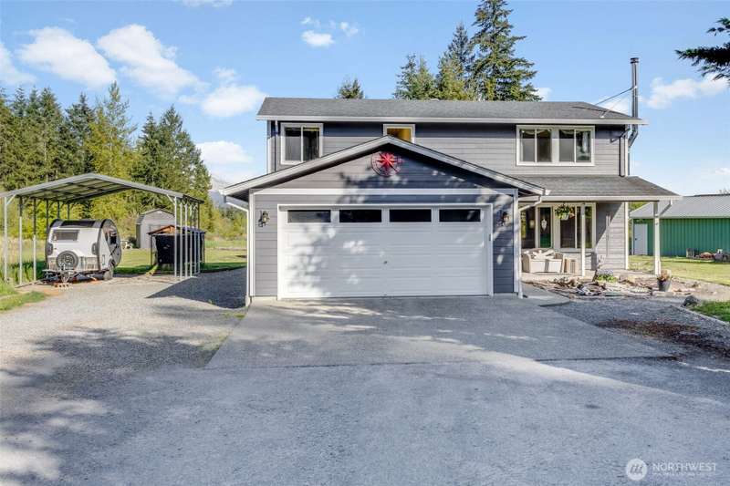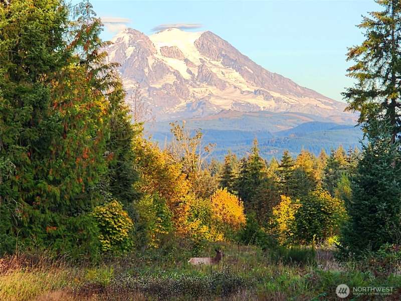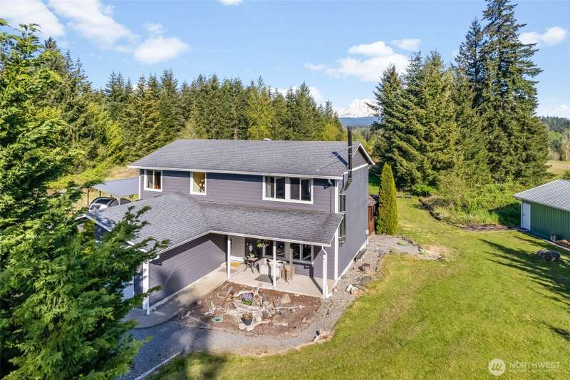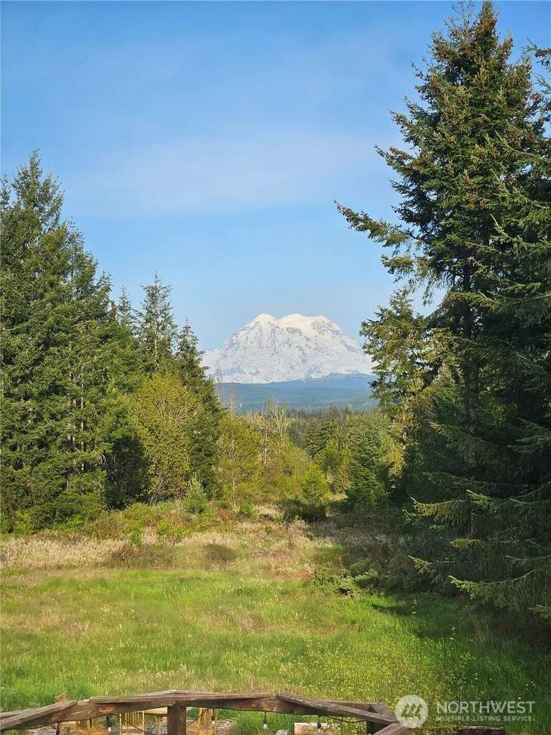 Beautiful Mt. Rainier view & nearly 10 acres of adventure await you! Use your space as you see fit. Relax & unwind, camp & explore in your backyard, entertain by the firepit, hang out under the stars, and you may even spot some wildlife. You may also want to research the possibility for an DADU. This home offers comfort & updates including new flooring downstairs & in the primary bedroom, fresh carpet on stairs & hallway, new water heater (2024) & wired for a generator. Outside find Hardie Plank siding, newer exterior paint, extra 2-car detached shop/garage, RV carport, sheds, dog kennel, new front fencing, swings & firepit area, a water feature, & more. No HOA & tons of room for all your stuff. Come claim your slice of paradise!