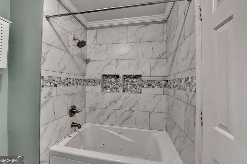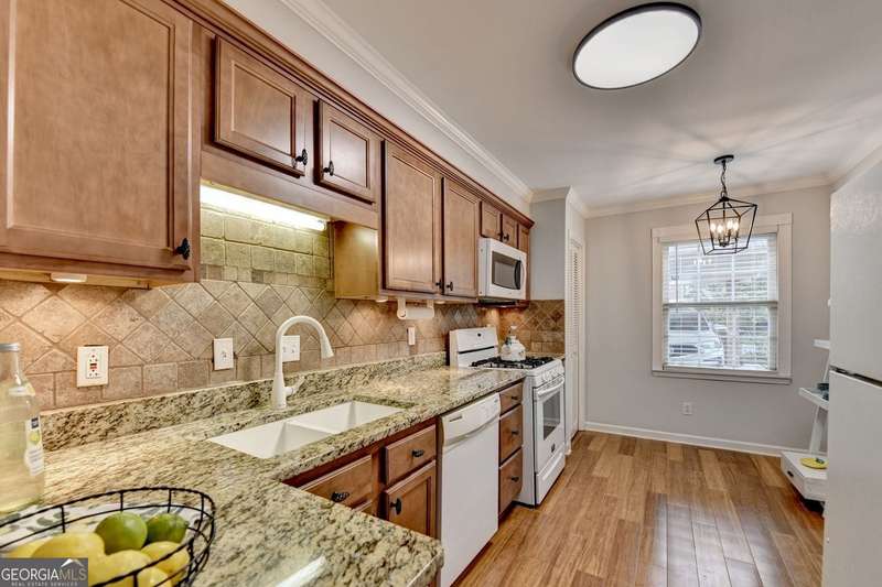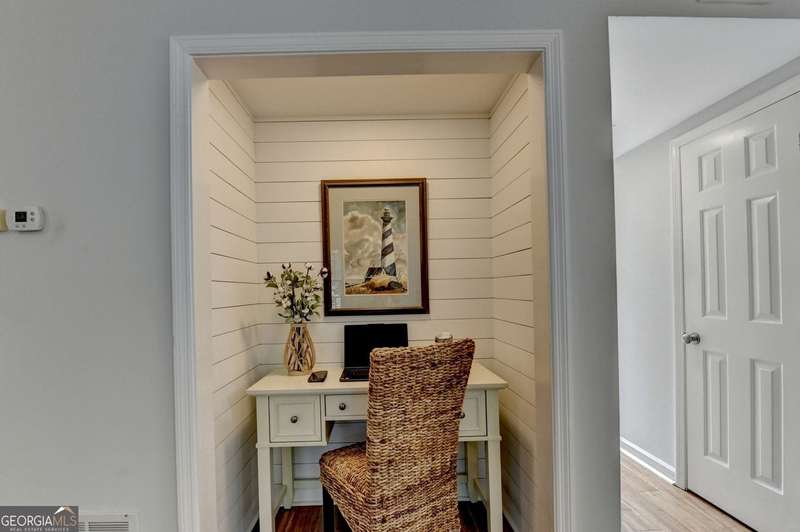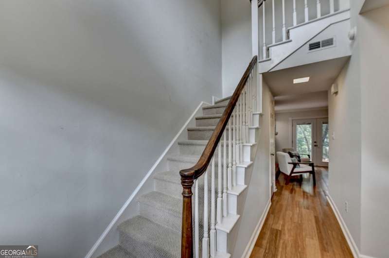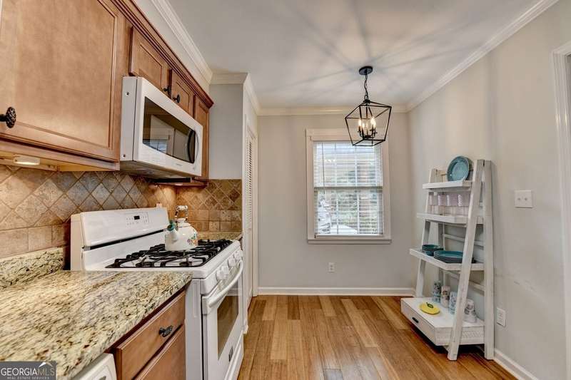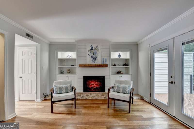Charming Townhome in Cinnamon Cove - Steps from Lake Lanier! Welcome to this beautifully updated 2-bedroom, 1.5-bath townhome in the highly sought-after Cinnamon Cove Community, perfectly located near Lake Lanier! As you enter the home, you'll be greeted by a light-filled double foyer with a new contemporary chandelier and beautiful bamboo flooring throughout the main level. The updated kitchen features granite countertops, a modern backsplash, new lighting, and a cozy eat-in breakfast nook. The first-floor powder room is located adjacent to the laundry room featuring an included washer and dryer. The main living and dining area showcases stylish shiplap walls surrounding a lovely fireplace with built-ins on each side, a charming small office nook, and beautiful double French doors leading to the newly stained back deck-perfect for indoor/outdoor relaxing or entertaining. Upstairs, you'll find two carpeted bedrooms and a remodeled primary bath offering fresh finishes, a jetted tub, and a spa-like feel. The home also includes a convenient stand-up crawl space for extra storage and a beautiful owner-maintained front garden -ideal for enjoying evenings outdoors. The Homeowner's Association maintains the lawn and all exterior upkeep on your home making this a truly low-maintenance laid-back community. The cozy Cinnamon Cove Community includes a pool and clubhouse, tennis courts, a dog park, and private access to Lake Lanier. Enjoy the serenity of lakeside living while being just minutes from shopping, restaurants, and I-985.