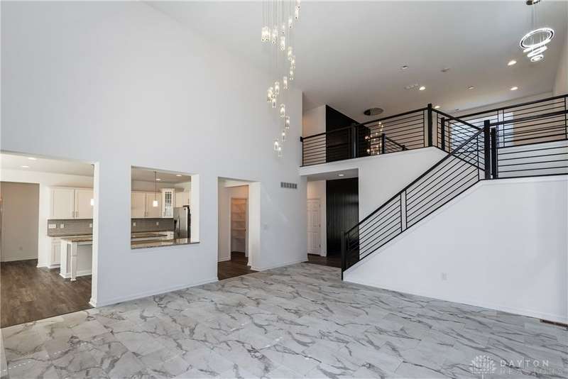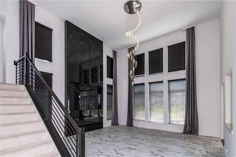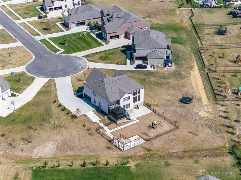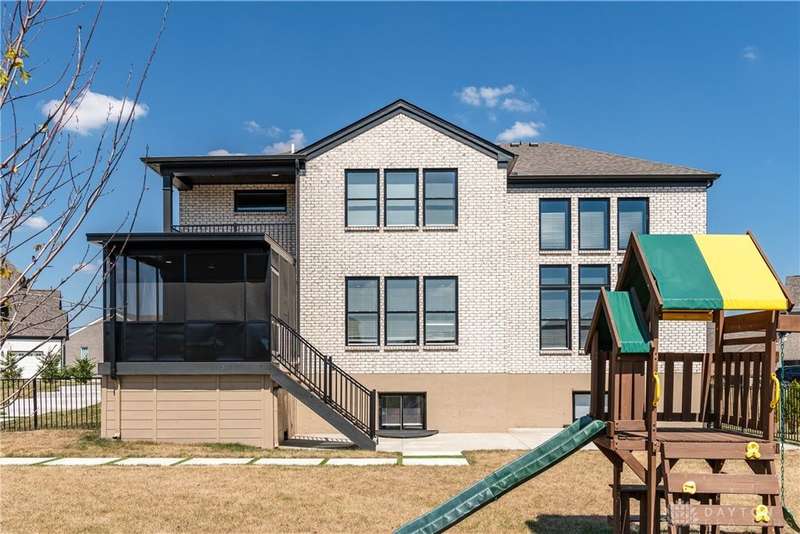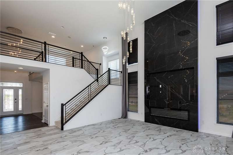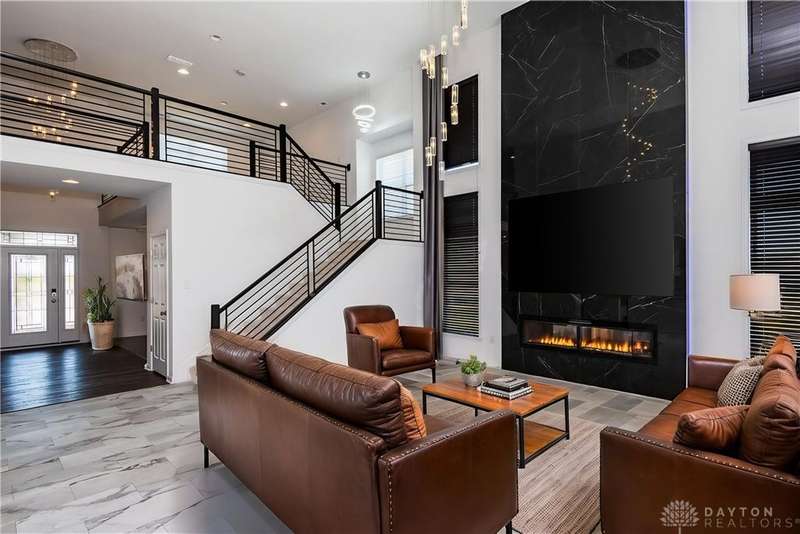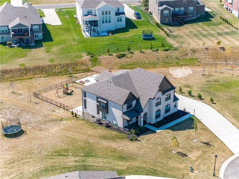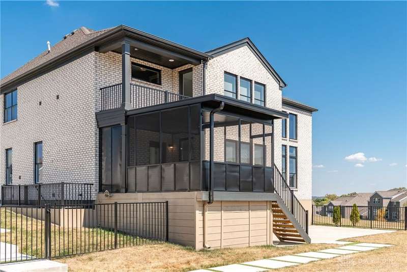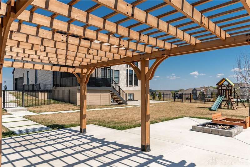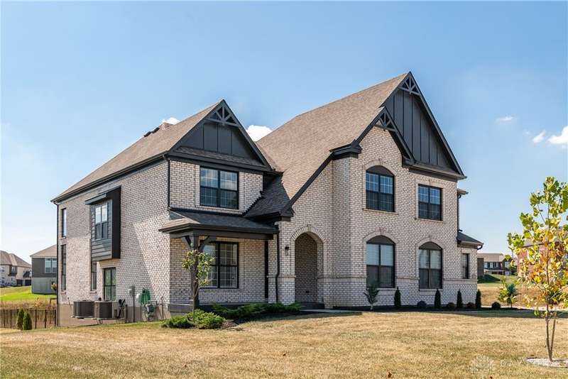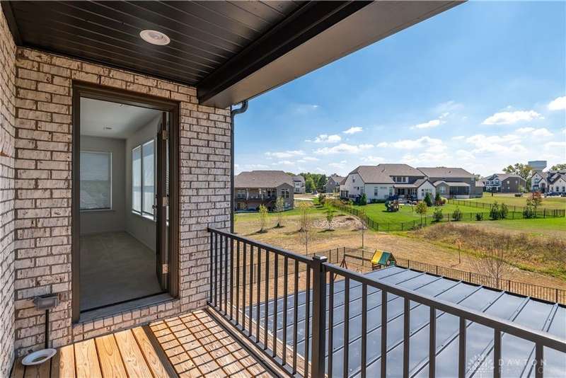 Welcome to a masterpiece of modern design, perfectly positioned on a private cul-de-sac in the premier Woodgrove subdivision. This exceptional MI Homes build from 2022 commands attention with its stunning full-brick exterior, featuring unique light-colored brick beautifully contrasted by sophisticated dark accents for incredible curb appeal. Inside, discover a sanctuary of light and space where an open floor plan is elevated by soaring high ceilings and an entire wall of large windows. The heart of the home is the magnificent great room, showcasing a custom-built tile entertainment wall with a mesmerizing color-changing electric fireplace and integrated accent lighting. The gourmet kitchen is a chef's dream, equipped with a built-in double wall oven, a countertop electric stove, a massive island perfect for gathering, and ample storage. The luxurious primary suite is a true retreat, complete with a private balcony, two spacious walk-in closets, and a spa-like ensuite with elegant double vanities and a beautifully tiled Roman shower. An elegant upstairs loft overlooks the living area below, providing a perfect flexible space for a play area, home office, or reading nook. The incredible, fully finished walkout basement dramatically expands your living space, offering a huge recreation area, a convenient wet bar, a versatile bonus room ideal for a guest bedroom or home office, and direct access to the backyard. Outside, your private oasis awaits, featuring a covered porch with storage, a stylish pergola, and a ready-to-use firepit area on a fenced lot, with property lines that extend generously beyond the fence for added space and potential. With top-rated Springboro schools just a mile away, this home seamlessly blends luxury, location, and lifestyle into an unparalleled offering.