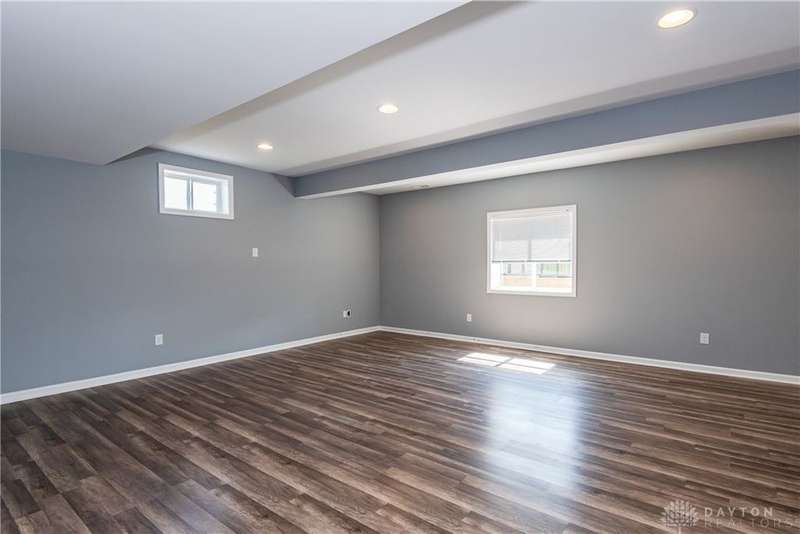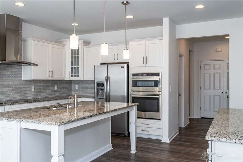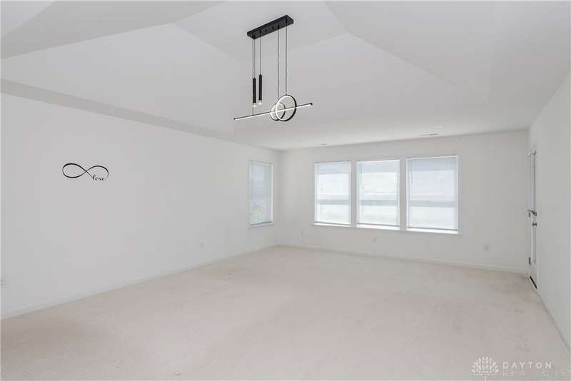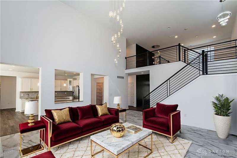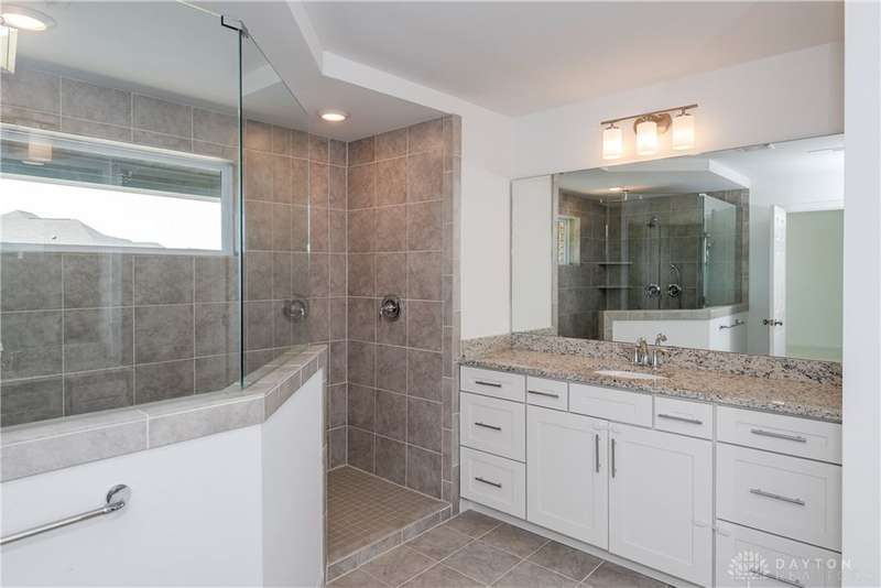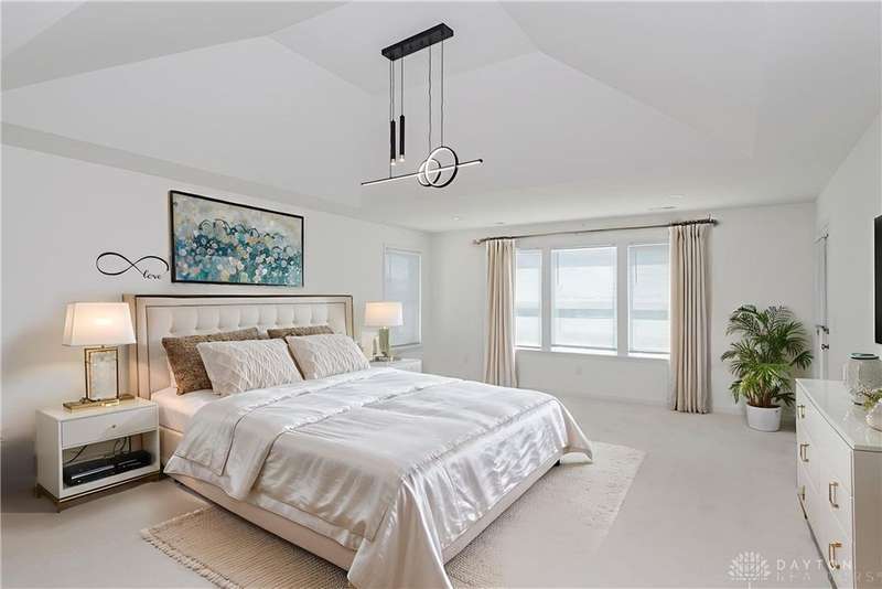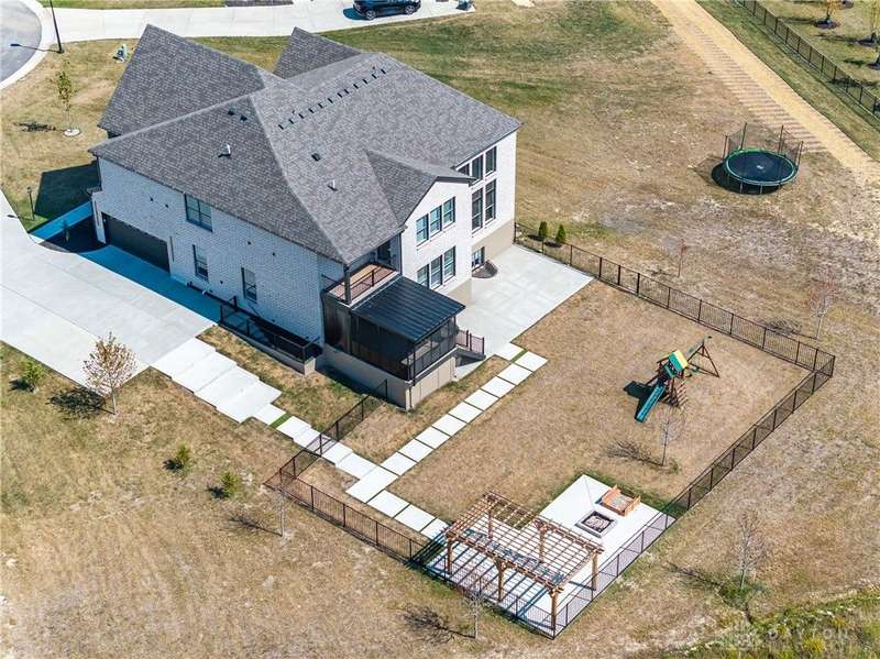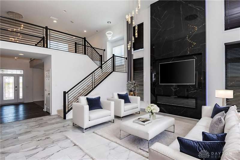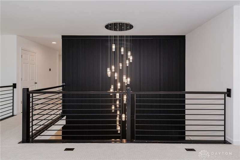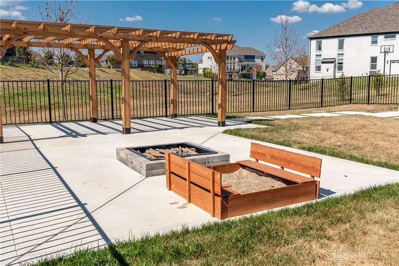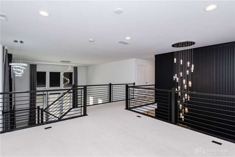 Welcome to a masterpiece of modern design, perfectly positioned on a private cul-de-sac in the premier Woodgrove subdivision. This exceptional MI Homes build from 2022 commands attention with its stunning full-brick exterior, featuring unique light-colored brick beautifully contrasted by sophisticated dark accents for incredible curb appeal. Inside, discover a sanctuary of light and space where an open floor plan is elevated by soaring high ceilings and an entire wall of large windows. The heart of the home is the magnificent great room, showcasing a custom-built tile entertainment wall with a mesmerizing color-changing electric fireplace and integrated accent lighting. The gourmet kitchen is a chef's dream, equipped with a built-in double wall oven, a countertop electric stove, a massive island perfect for gathering, and ample storage. The luxurious primary suite is a true retreat, complete with a private balcony, two spacious walk-in closets, and a spa-like ensuite with elegant double vanities and a beautifully tiled Roman shower. An elegant upstairs loft overlooks the living area below, providing a perfect flexible space for a play area, home office, or reading nook. The incredible, fully finished walkout basement dramatically expands your living space, offering a huge recreation area, a convenient wet bar, a versatile bonus room ideal for a guest bedroom or home office, and direct access to the backyard. Outside, your private oasis awaits, featuring a covered porch with storage, a stylish pergola, and a ready-to-use firepit area on a fenced lot, with property lines that extend generously beyond the fence for added space and potential. With top-rated Springboro schools just a mile away, this home seamlessly blends luxury, location, and lifestyle into an unparalleled offering.