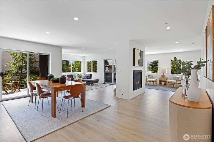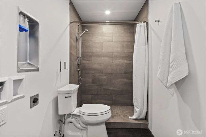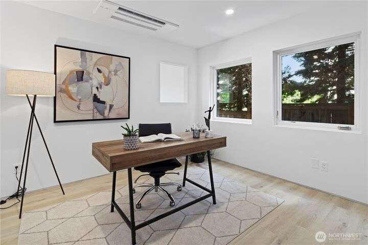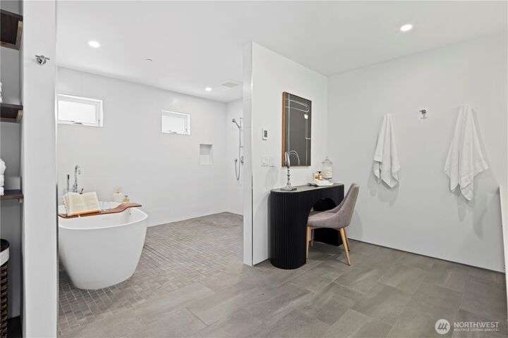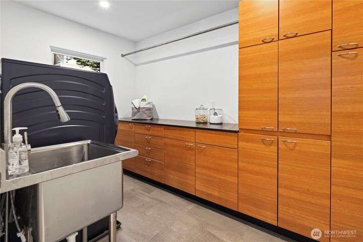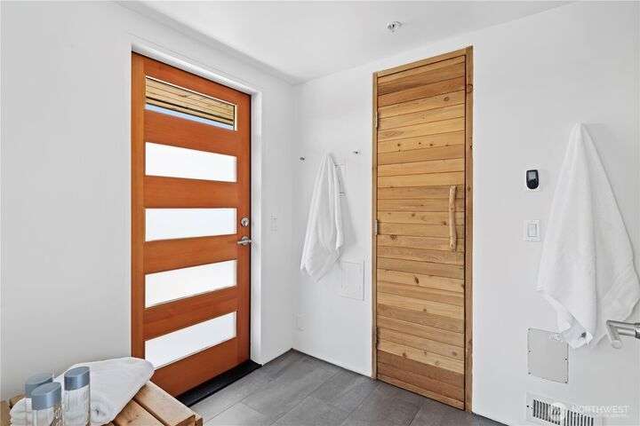 This unique, luxury 4 story home has views of Lake Washington, Olympic Mountains and Seattle skyline from all floors accessible from a four stop elevator. Situated creekside on a large 17099 sf wooded lot, 1 block to Lake Washington, close to cross kirkland trail, parks, downtown kirkland and I405/520. This contemporary home was thoughtfully designed by an architect for her own family. Their priorities were to create a warm, inviting space with dramatic natural light for living, entertaining, and to grow old in. It features a generous primary bedroom suite, four car garage, ADA access, a large home gym, 4 stop elevator, 1500 sf decks, and a rooftop indoor/outdoor family room with kitchette and sauna and ready for 8x13ft swimspa.