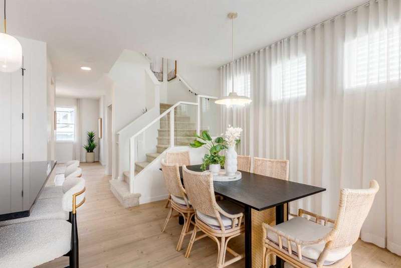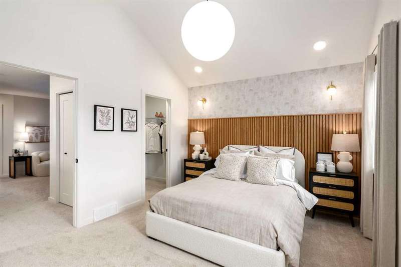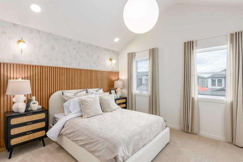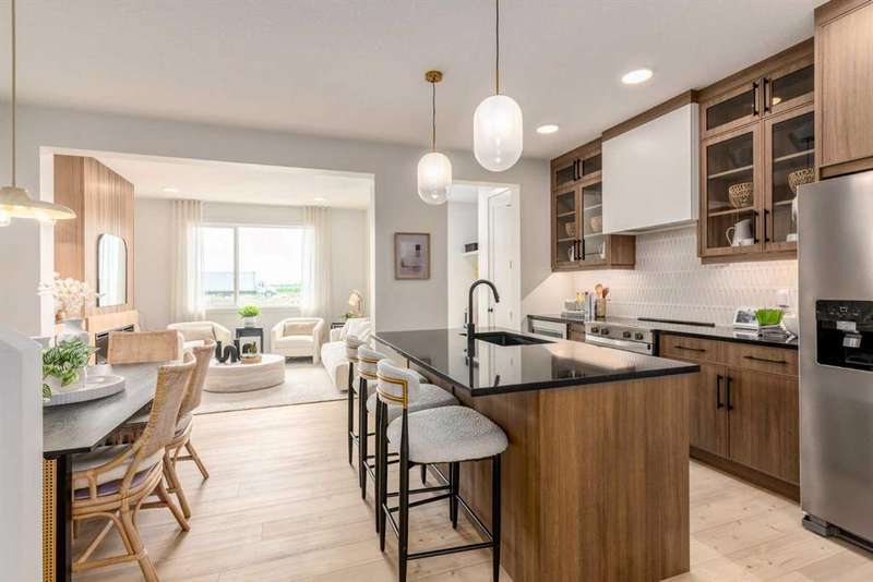 A MAIN FLOOR BEDROOM WITH A FULL BATH means grandparents or overnight guests don’t have to climb stairs. A SIDE ENTRY to the basement means future development is already set up. A 200 AMP PANEL means electric cars, workshops, and whatever else the next decade throws at you. THIS ISN’T JUST 1,723 SQUARE FEET — IT’S A HOME WIRED FOR EVERYDAY EASE NOW, AND READY FOR MORE LATER. Inside, the main floor keeps the rhythm practical but polished. Nine-foot ceilings stretch the sightlines while luxury vinyl plank flooring anchors the space in warm wood-tones. The kitchen layers style onto function: oxford grey cabinets, extended to 48", meet a smoky backsplash in a stacked subway layout, while QUARTZ COUNTERS stay as durable as they are calm. A SILGRANIT UNDERMOUNT SINK, built-in microwave, and 400 CFM CHIMNEY HOOD FAN ensure the details perform as well as they photograph. Groceries land directly in the pantry; dinner carries seamlessly to the dining area and living room, where a 50" ELECTRIC FIREPLACE feature wall sets the tone. The main floor bedroom lives just off the front of the home, with its own 3-piece cheater ensuite — perfect for aging parents, guests, or a tucked-away office if that’s what the season calls for. Upstairs, three more bedrooms flank a CENTRAL BONUS ROOM that truly works like a second living room. The master bedroom raises its ceiling height for an airy feel, paired with a walk-in closet and ensuite tiled in soft tones. Laundry lands upstairs too, so weekend chores don’t turn into stair marathons. Beneath it all, a full basement waits — 9' FOUNDATION WALLS, bathroom rough-ins, bar/kitchen sink rough-in, second laundry rough-in, and a SEPARATE SIDE ENTRY already in place. Think income potential, multigenerational ease, or simply future flexibility. Out back, a 20' x 20' CONCRETE PARKING PAD is garage-ready, and the yard comes sodded in front so you can get straight to weekend plans instead of topsoil. Life in Sora means you’re tucked just off Stoney Trail SE, with quick connections in every direction. Parks and pathways stitch through the community, playgrounds are already in, and a growing list of amenities is planned to scale with the neighbourhood. It’s an early-entry opportunity in Calgary’s southeast — a place where you can grow into both the home and the community. Ready for a quick possession? Book a showing at 270 Sora Way SE and see how well this home balances today’s comfort with tomorrow’s potential. • PLEASE NOTE: Photos are of a finished Showhome of the same model – fit and finish may differ on finished spec home. Interior selections and floorplans shown in photos.
