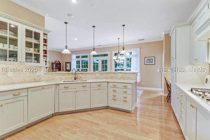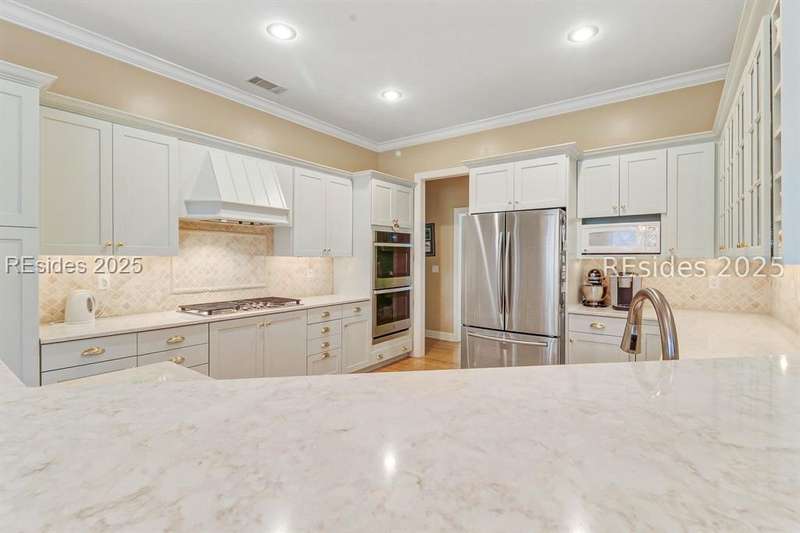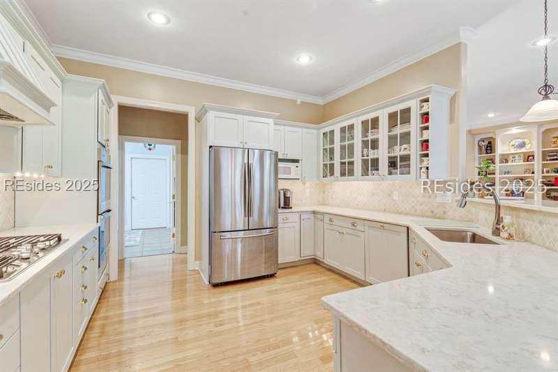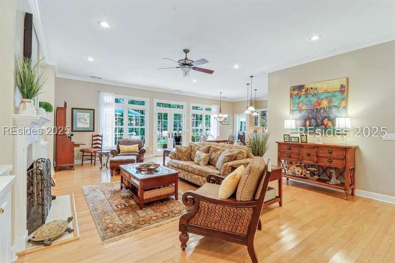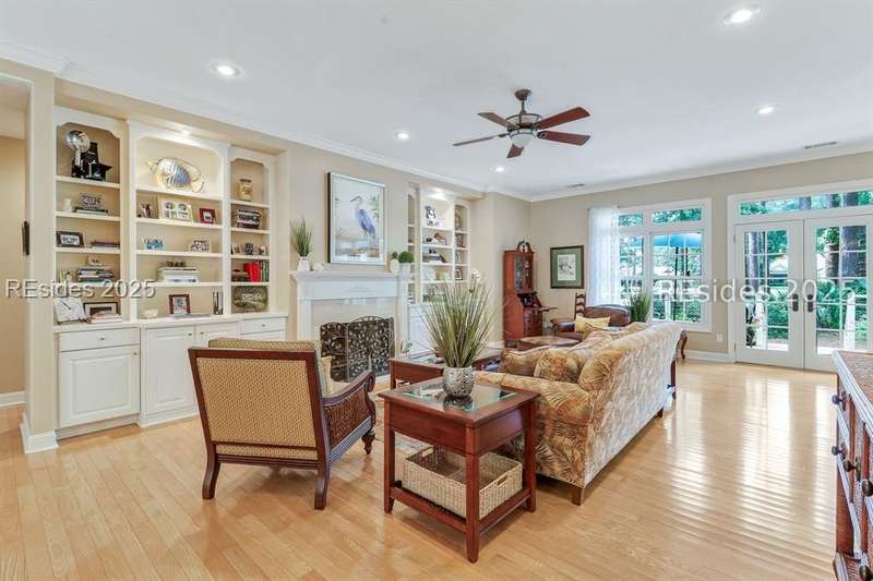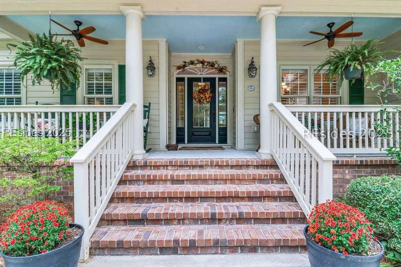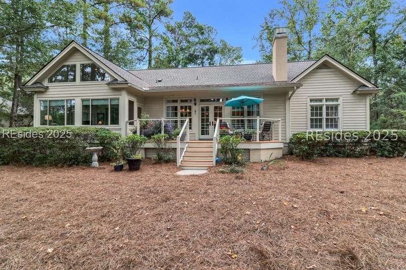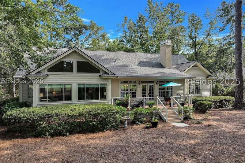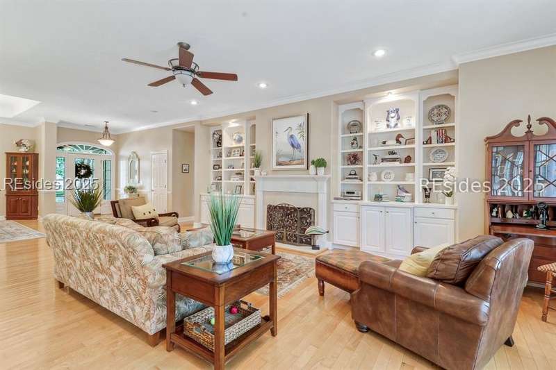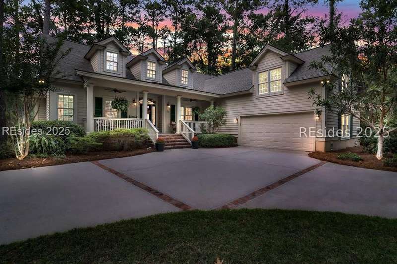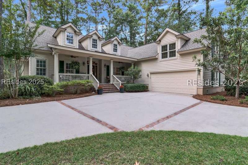 Charming, spacious, superbly maintained/updated, custom built residence with sweeping golf views (#3 South Course) on quiet cul de sac street in private, amenity rich Moss Creek. Interior features include volume/vaulted/tray, smooth ceilings, wood flooring, built-ins/millwork/cabinetry by master craftsmen, bullnose corners, walls of windows (including transom windows) to view, quartz counters, high-end stainless-steel appliances, max cabinet/counter space, plantation shutters, marble hearth/surround gas fireplace, recessed/pendant/under cabinet lighting, raised vanities, etc. Very livable floor plan offers Kitchen (w/4 seat breakfast bar & built-in work station) open to Great room, large Carolina room, formal/casual Dining, oversize Bonus Room, Powder room, ample Laundry room, walk-in Pantry, excellent BR separation including well-appointed primary suite (dual walk-in closets), 2 guest BRs and Bath + must have 2.5+ car garage with workshop & storage areas. Exterior features include attractive/durable Hardie board siding, brick steps to covered front porch, dormer windows, expansive rear Trex deck with cabled railings, carriage lighting, energy savings spray foam insulation under 1st floor, specimen trees, mature plantings/lawn & irrigation system, etc. All with excellent curb appeal & preferred, central locale offering easy access to gated entry and all community amenities.