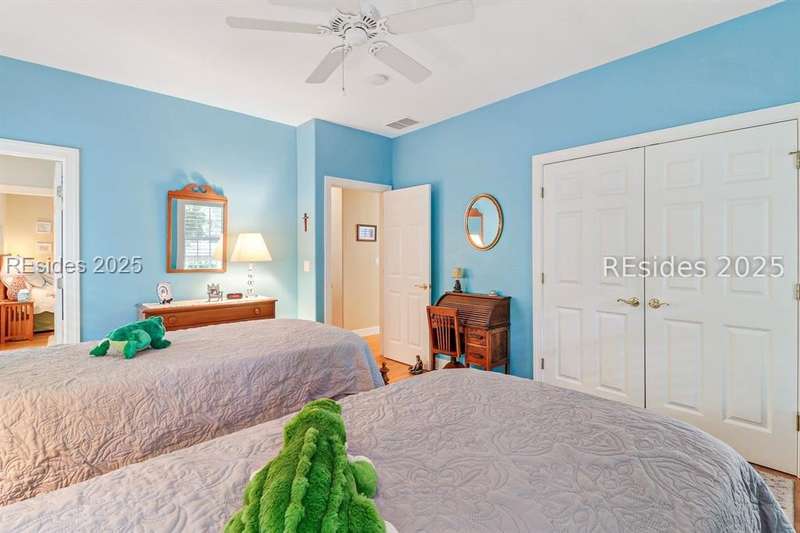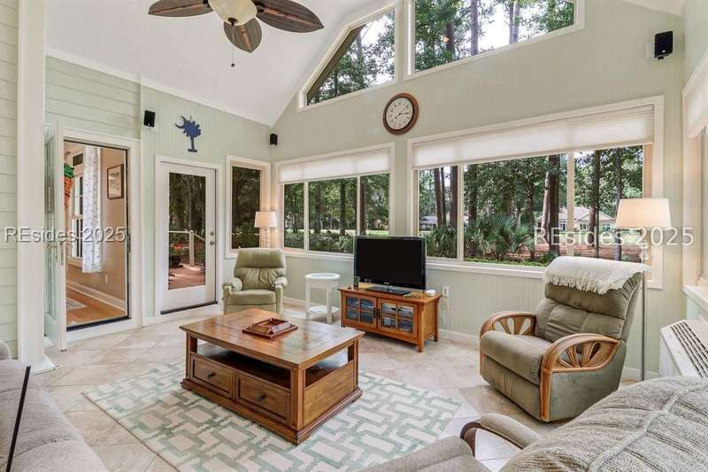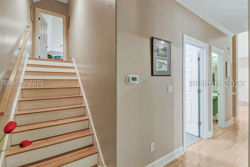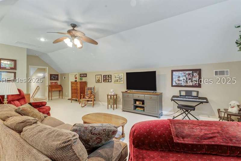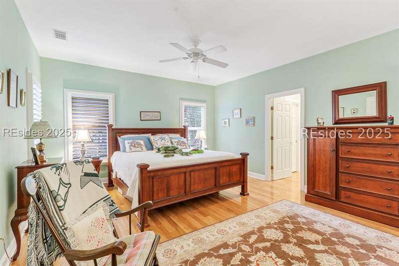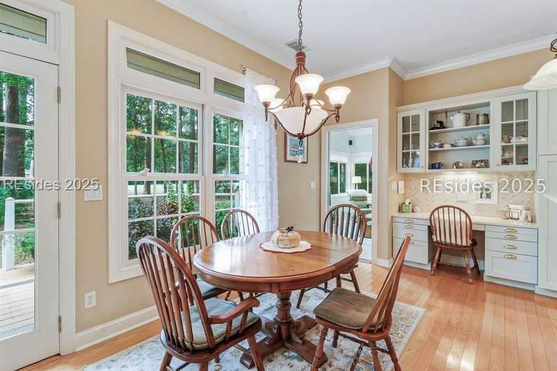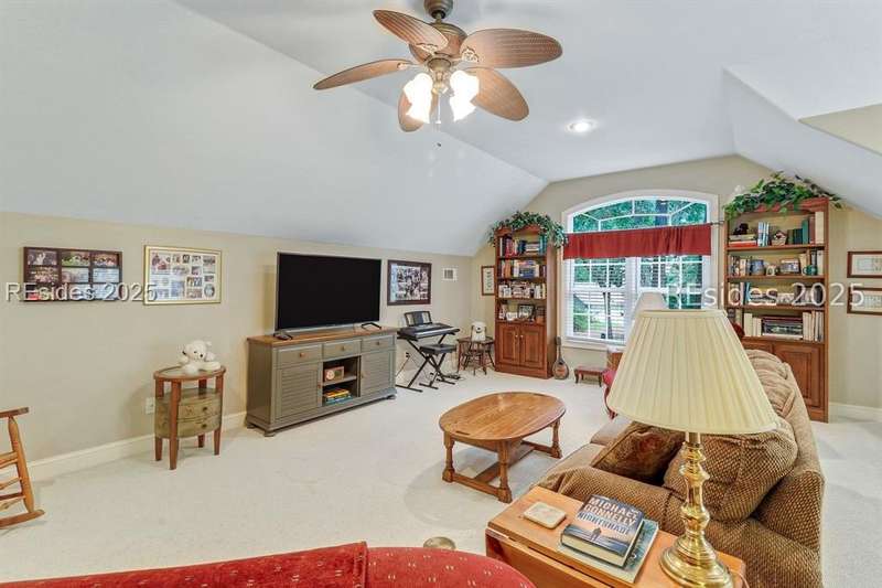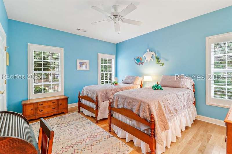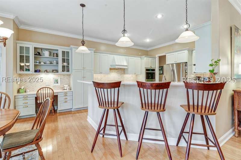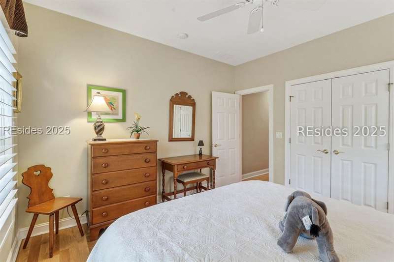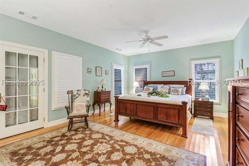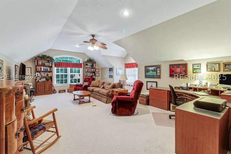Charming, spacious, superbly maintained/updated, custom built residence with sweeping golf views (#3 South Course) on quiet cul de sac street in private, amenity rich Moss Creek. Interior features include volume/vaulted/tray, smooth ceilings, wood flooring, built-ins/millwork/cabinetry by master craftsmen, bullnose corners, walls of windows (including transom windows) to view, quartz counters, high-end stainless-steel appliances, max cabinet/counter space, plantation shutters, marble hearth/surround gas fireplace, recessed/pendant/under cabinet lighting, raised vanities, etc. Very livable floor plan offers Kitchen (w/4 seat breakfast bar & built-in work station) open to Great room, large Carolina room, formal/casual Dining, oversize Bonus Room, Powder room, ample Laundry room, walk-in Pantry, excellent BR separation including well-appointed primary suite (dual walk-in closets), 2 guest BRs and Bath + must have 2.5+ car garage with workshop & storage areas. Exterior features include attractive/durable Hardie board siding, brick steps to covered front porch, dormer windows, expansive rear Trex deck with cabled railings, carriage lighting, energy savings spray foam insulation under 1st floor, specimen trees, mature plantings/lawn & irrigation system, etc. All with excellent curb appeal & preferred, central locale offering easy access to gated entry and all community amenities.