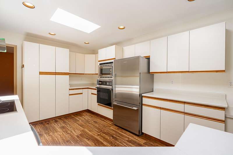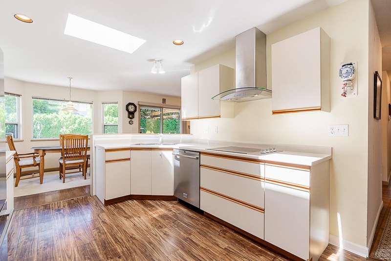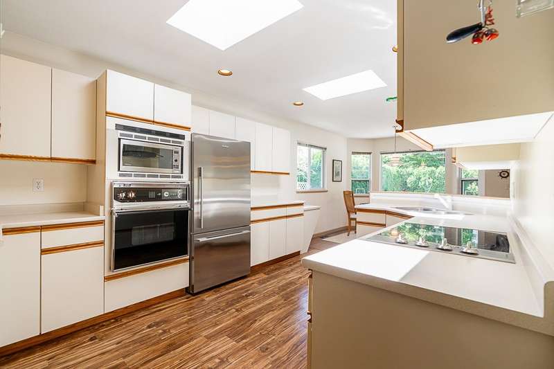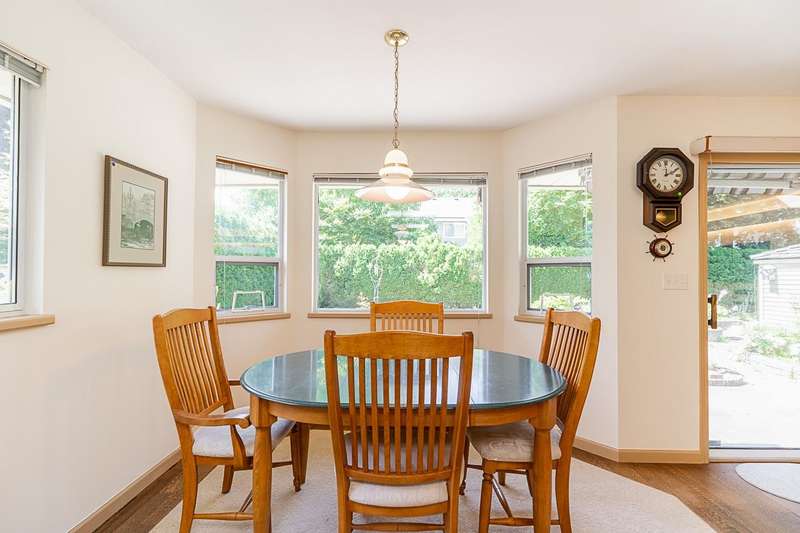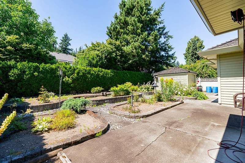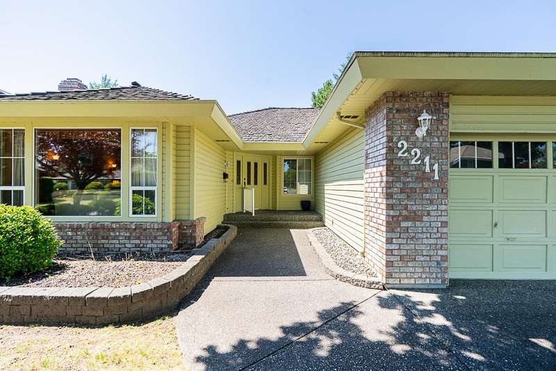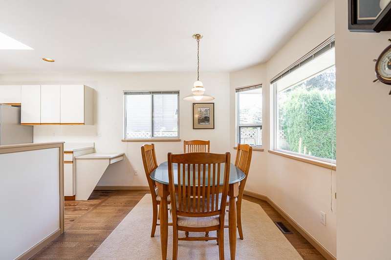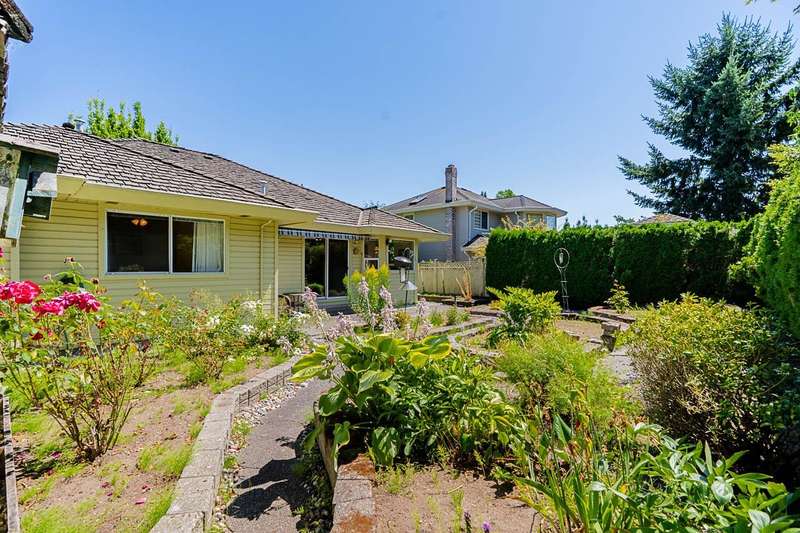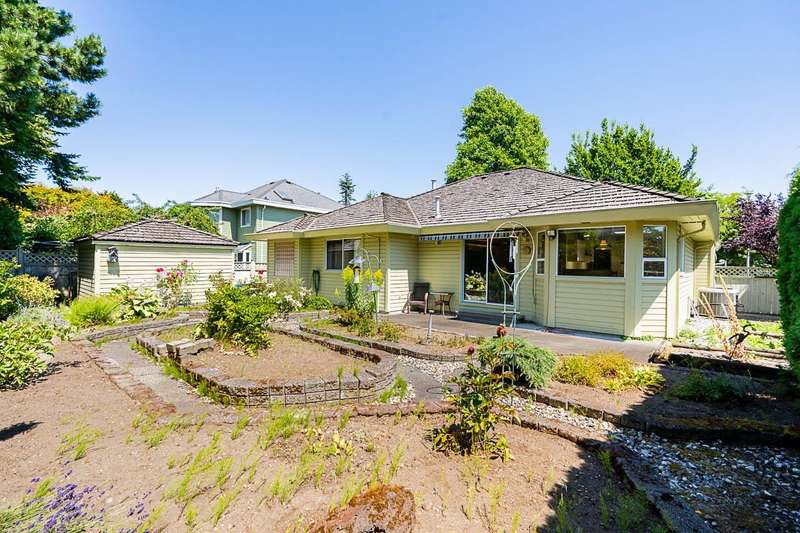 Meridian by the Sea. Spacious & well kept 2 bedroom and den rancher or convert the den to a 3rd bedroom. Large bright kitchen with skylights & eating area. Comfy family room with gas fireplace. Spacious primary bedroom with ensuite bathroom & walk-in closet. Private sunny west exposed back yard is a gardener’s delight! Double car garage. Walking distance to Surrey Athletic Park, bike and walking trails. School catchment area H.T. Thrift Elementary & Semiahmoo Secondary.