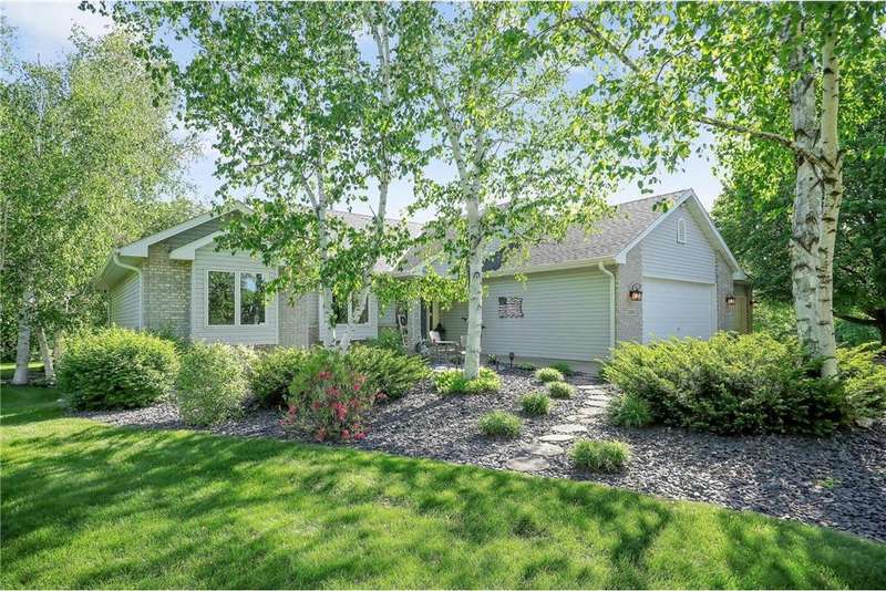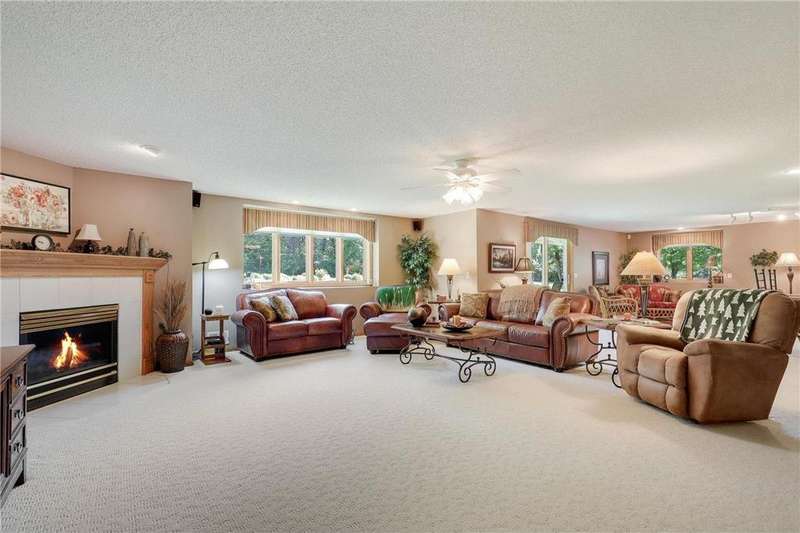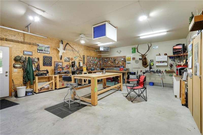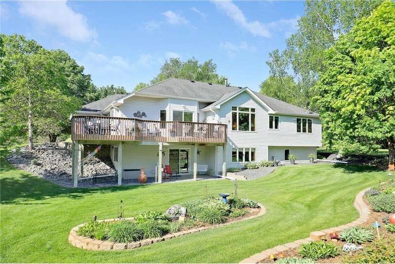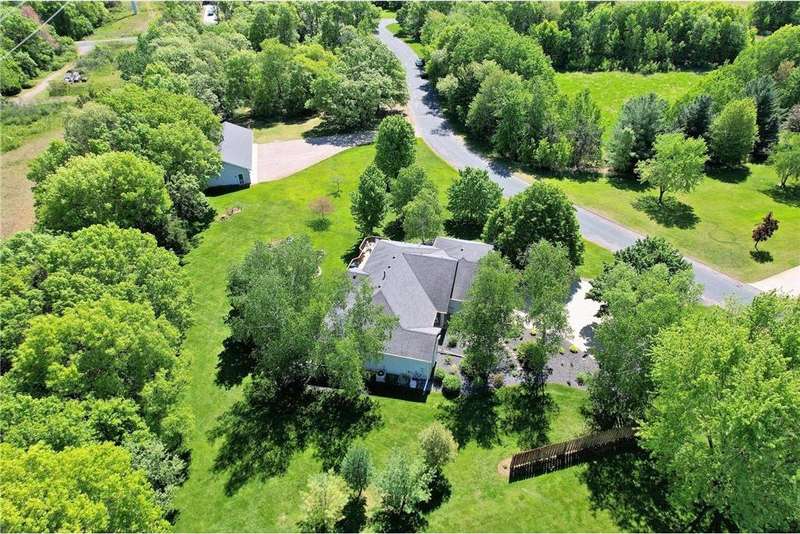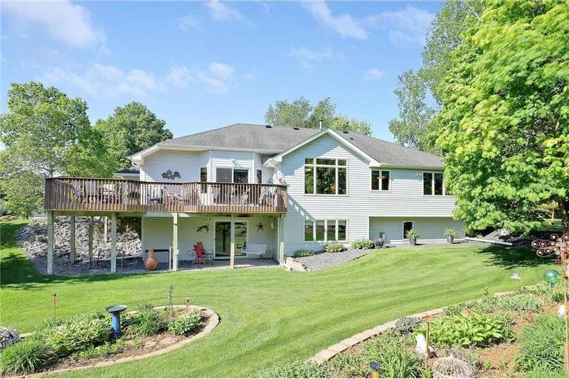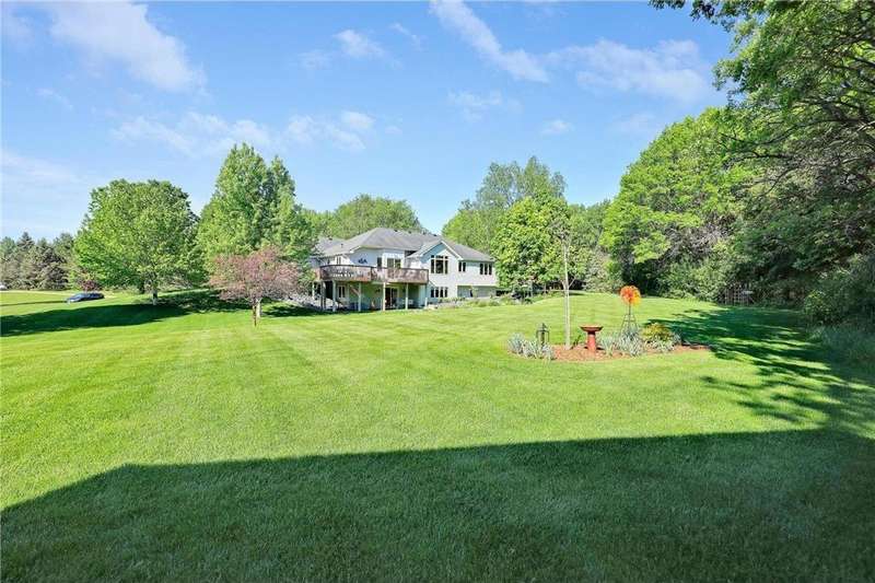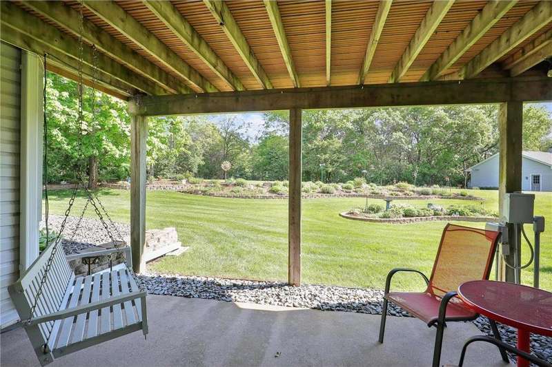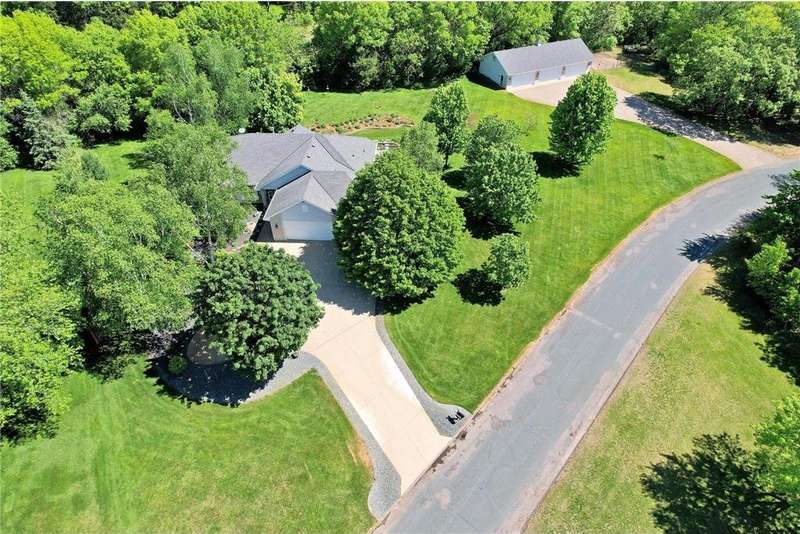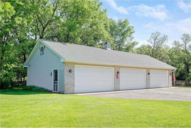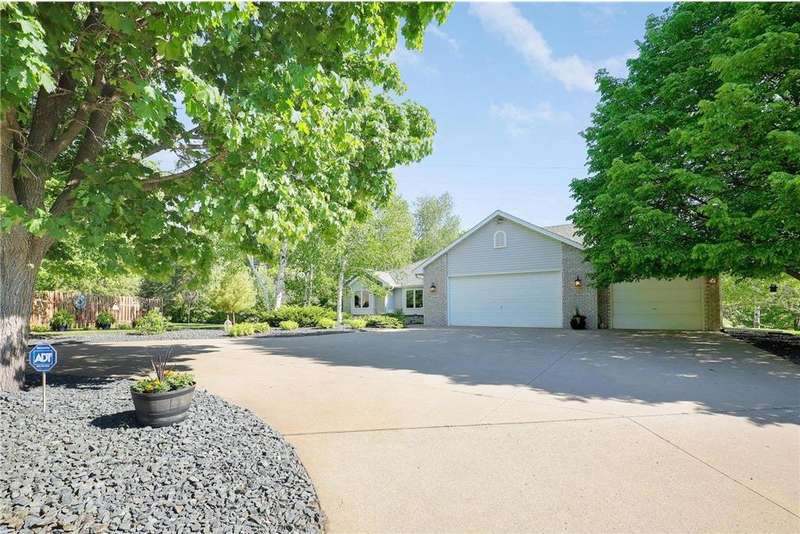 Immaculate and spacious 3+ bedroom, 3-bath walkout rambler nestled on 2.66 private acres surrounded by mature trees and beautifully landscaped grounds. If you're looking for garage space, this property delivers with an oversized 3-car attached garage and an incredible 6-car detached garage featuring a heated workshop. Step inside to a warm and inviting main level offering vaulted ceilings in the family room, a bayed and vaulted dining area, and an updated kitchen complete with stainless steel appliances, granite countertops, and a center island. The main floor also includes a large laundry/mudroom with built-in cabinetry, a generous primary suite with a walk-in closet, and an updated private bath featuring a jetted tub and separate shower. Enjoy the outdoors from the expansive wraparound deck with maintenance-free decking or relax on the covered patio. The finished walkout lower level features a spacious family/rec room with bar and gaming area, an office or additional bedroom, and an incredible spa room complete with sauna and hot tub. Additional highlights include newer mechanicals, a bright and open floor plan, in-ground sprinkler system, and meticulously maintained gardens. A truly must-see property!