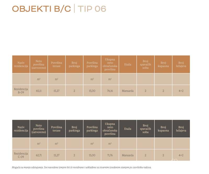 Apartment B/C-T06 - attic - living area 62.71 m2 (2 bedrooms + 2 bathrooms) + balcony (15.27 m2) + 2 x parking (2 x 15 m2); total net calculable area 71.76 m2 = 401,879 EUR
