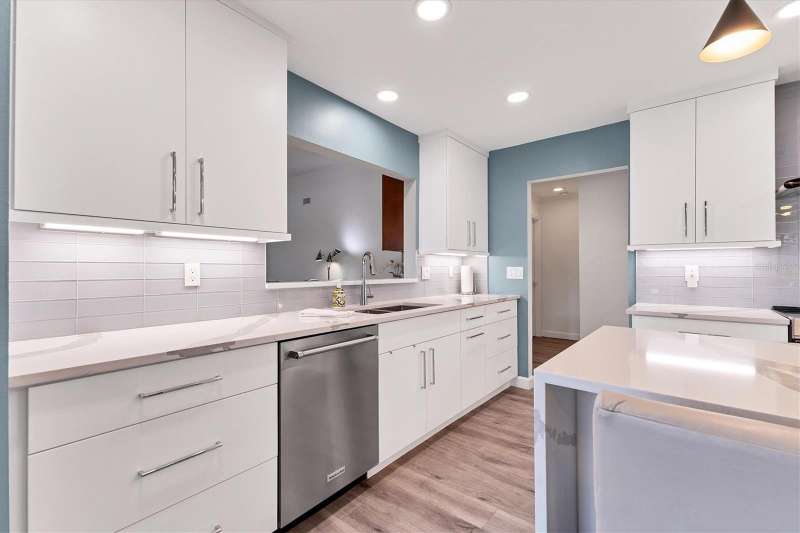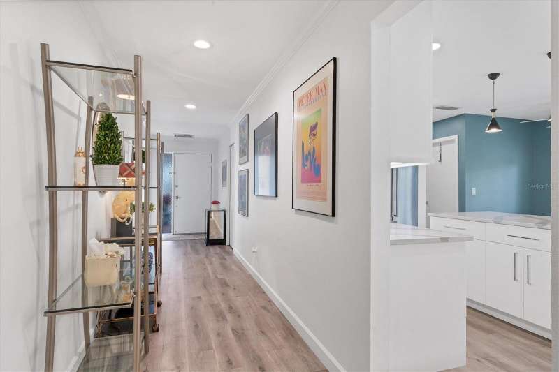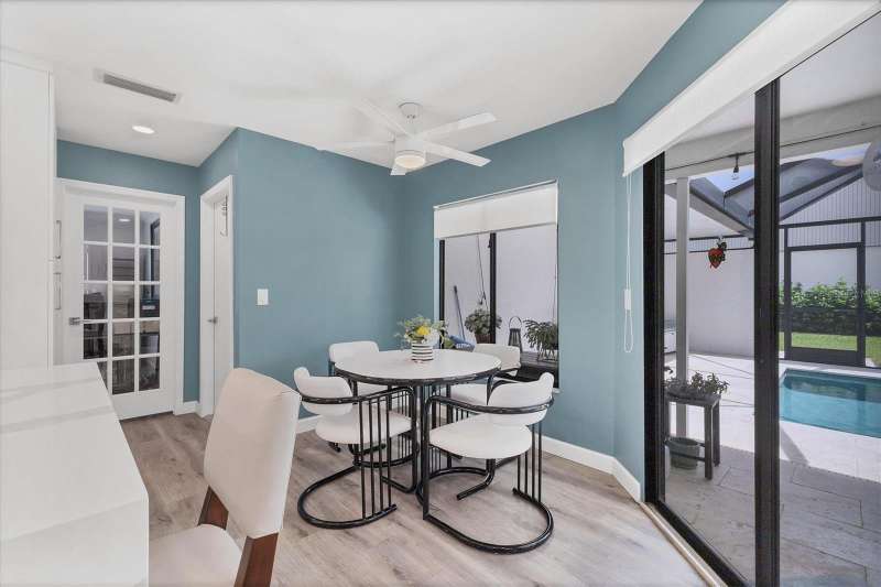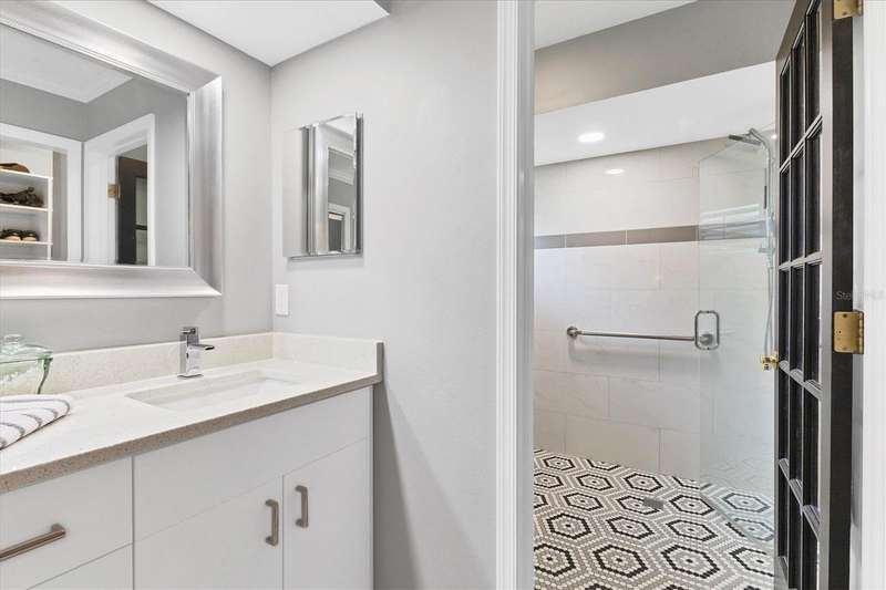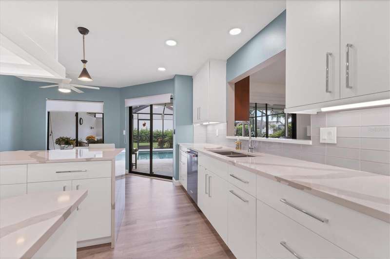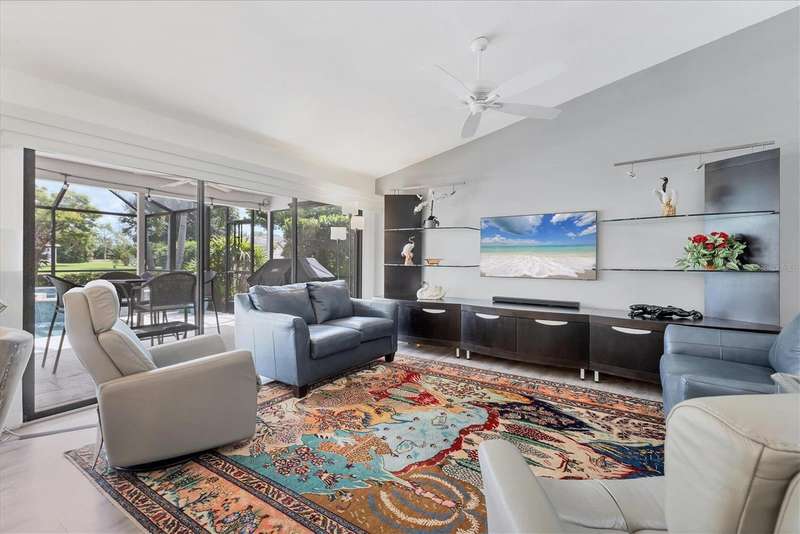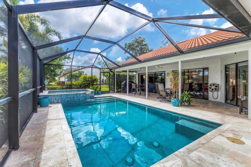 Designer owner totally renovated 3-bedroom, 2 bath, pool/spa home located in the prime location of The Meadows community. It is a great entertaining home for any lifestyle. This home is in the Muirfield Community on a beautifully landscaped large corner lot on a cul de sac street. A brick paver driveway welcomes you to this maintenance free home. The community offers a neighborhood pool that is a walkable distance, ideal for community get-togethers! The spacious, large eat in kitchen offers many extras! There is a 5’x3’ island with seating area as well as a spot for a table and chairs. Countertops are quartz and appliances are Kitchenaide. There is also a pantry. The great room offers vaulted ceilings and a wall of sliding glass doors to the newly added pool/lanai. The entertainment furniture as well as the TV and the sound system are included in the price. Custom shutters are on the windows and roller screen shades are on the sliding glass doors. The large lanai is screened and has exquisite travertine pavers. The backyard is private and provides an inviting space for outdoor relaxation and entertainment. The generously sized primary suite offers a sitting area. The primary bath offers 2 sinks and a vanity area along with comfort height toilet. The shower is easily accessible with no shower curb and professionally installed grab bar. The guest bath offers a “floating” vanity with glass countertop as well as a bathtub. There is a guest bedroom and another bedroom that the owner is using as an office. Additional features include a new well and irrigation system and an oversized, new air-conditioned garage – ideal for storage or a workshop. Residents of the Meadows can enjoy 14 miles of walking and biking trails, and a new Lifestyles Building with a gym and rooms for meetings. Also available is an Olympic junior size pool, tennis courts and golf courses that are currently being renovated, due to open in November. The Meadows is a short distance from the UTC Mall, many restaurants and shops and the new Mote Marine Aquarium. It is also a short drive to downtown Sarasota, St Armands Key, Lido Beach and top-rated Sarasota Hospitals. Low HOA Fees include exterior yard maintenance and internet service. This home blends comfort, convenience, and community living in one of Sarasota’s most established neighborhoods.