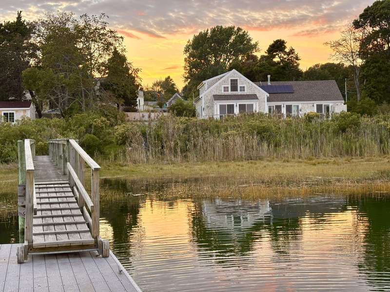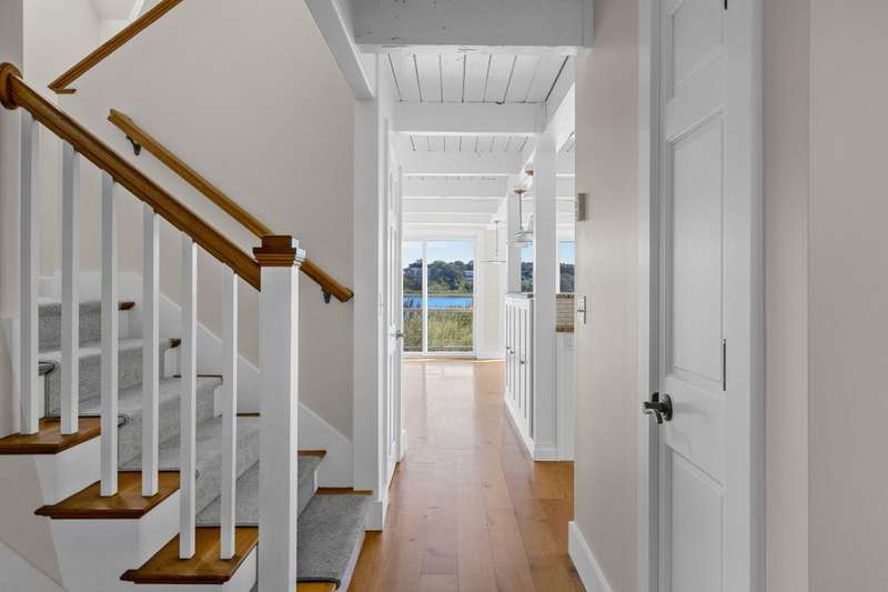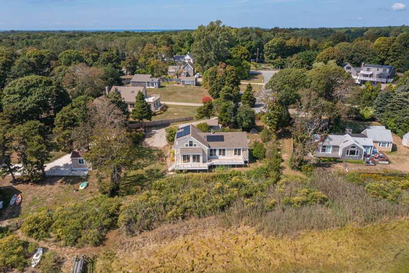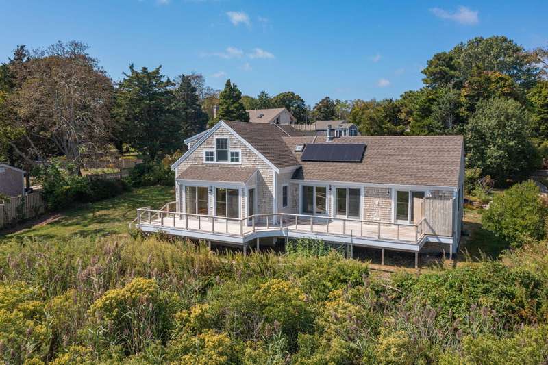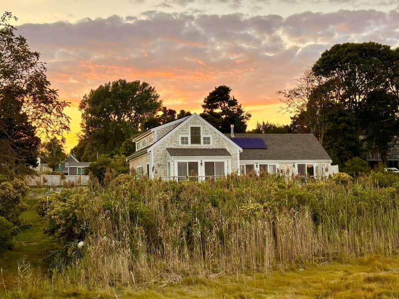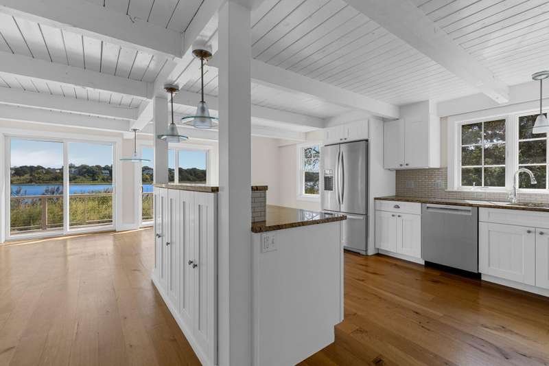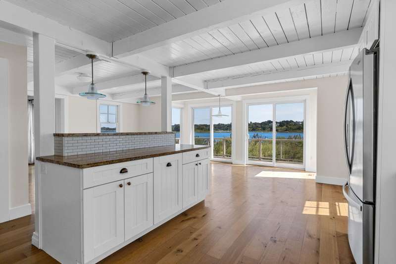 Embrace waterfront living, located on saltwater, this custom home offers a lifestyle defined by nature's beauty. Its relaxing, spacious and clean design features natural elements, an abundance of sunlight, and captivating water views from most every room. This home offers unrivaled access to a host of saltwater activities. Spend your days sailing, boating, kayaking, or paddleboarding right from your doorstep. Canoe over to Hopkins Island for various wildlife. 5 sliding glass doors span the back of the house, creating sun drenched natural light. Crisp white beamed ceilings, beautiful wood floors, a swanky kitchen is equipped with granite countertops, stainless appliances, a convenient pantry and space for your culinary pursuits. This is an eco-friendly yet efficient home with owned solar panels, heat pump hot water, and saltwater breezes all summer long. This exceptional property has natural gas heat and a gas fireplace, with central air providing effective climate control all year roun