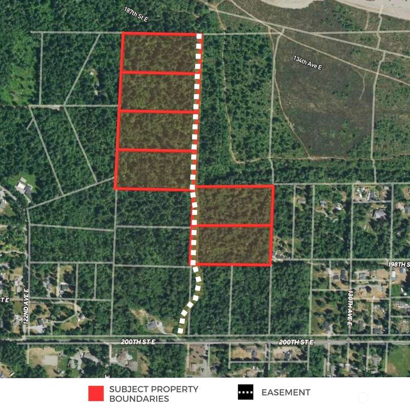 30 Acres of Development Land abutting Sunrise Master Planned Community. This offering is comprised of six (6) separate five (5) acre parcels w/ zoning of SF which allows four (4) single-family units per net buildable acre. Water, electricity, and sewer are available. The entire property contains level topography and it is heavily forested w/ mature Fir & Cedar trees which will defray development costs. Access comes off 200th St E/Howe Road via 60 ft wide easement. The location is excellent since it is just outside of South Hill with easy access to Meridian Avenue. A wide variety of eateries, grocery stores, medical providers, entertainment, and other commercial enterprises are only minutes away. Priced at $1.91/SF or $83.3K/Acre.