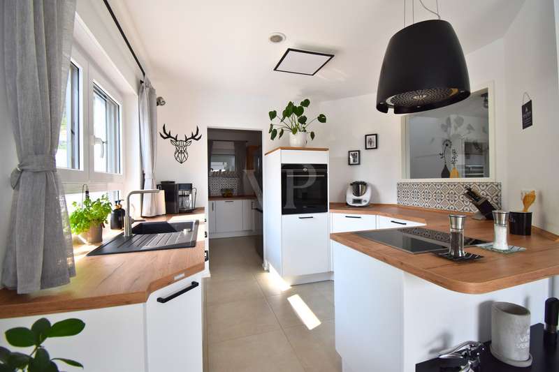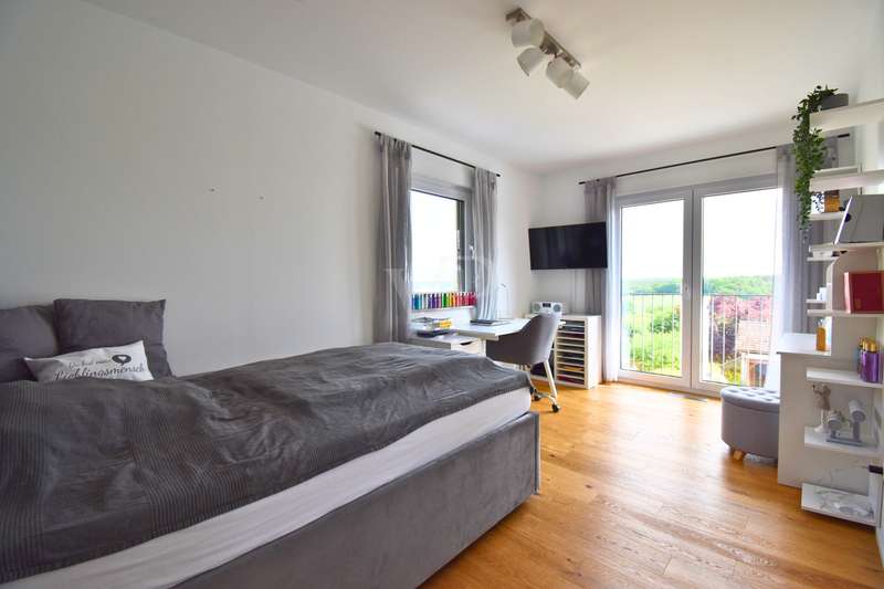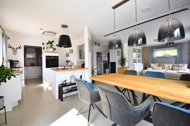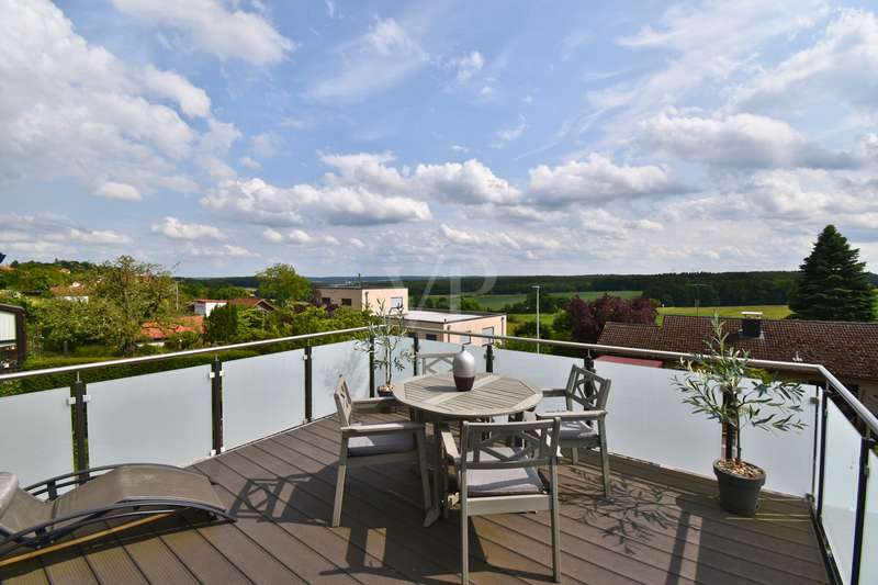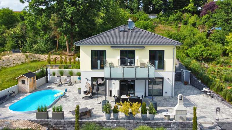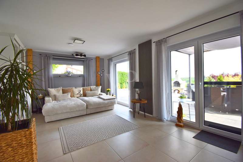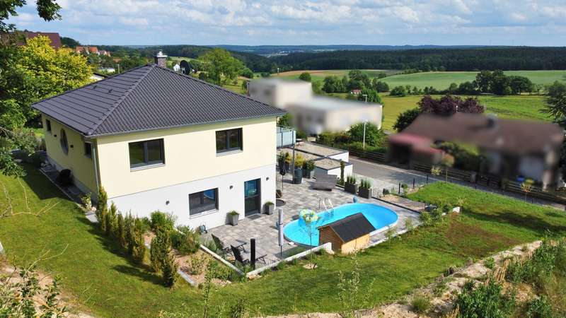 As soon as you enter this modern detached house, it becomes clear: Architectural clarity meets high-quality living comfort. Spacious rooms, well thought-out details and first-class fittings make this property a home for people with high standards. The handover includes an initial guarantee - a further expression of quality and security. The house is situated in a quiet, natural location with unobstructed views of the idyllic Aisch valley. Thanks to the intelligent spatial planning on two floors and the combination of modern building technology, energy-efficient construction and stylish design, this property offers the perfect setting for relaxed family life or sophisticated living and working under one roof. The living and dining area on the first floor impresses with its openness and brightness. Large windows create a flowing transition to the covered terrace, where a permanently installed barbecue invites you to enjoy sociable evenings outdoors. Directly adjacent, an oval pool measuring 7 x 3.5 x 1.5 meters - built in 2024/25 - offers a real vacation feeling in your own garden. The kitchen, a high-quality "wet & dry kitchen" from the renowned company Hartmann from Neustadt an der Aisch, meets the highest standards of functionality and aesthetics. The space is complemented by a utility and technical room, an extended kitchen area with additional work space, a guest WC and a practical storage room on the first floor. The well thought-out floor plan continues on the upper floor: a spacious bedroom, two bright children's rooms, a modern bathroom with rain shower, partner bathtub, stylish furniture and large-format tiles as well as a further room that can be used flexibly as an office or guest room offer space for all situations. All rooms are furnished with high-quality materials - including fine oak parquet flooring on the upper floor and easy-care large-format tiles on the first floor. The interior doors are from the Herrmann craftsmen's workshop in Baiersdorf and impress with their modern, timeless design. Special highlights are the spacious balcony with around 16 m² of usable space and electric awning, which offers a fantastic distant view of the Aisch valley, as well as the beamers in the living room - for a private home cinema experience. The windows are triple-glazed, burglar-resistant and fitted with lockable handles and integrated fly screens. Electric shutters on almost all windows and underfloor heating in all living areas underline the high level of living comfort. The property is also technically future-proof: A modern air heat pump in combination with a controlled ventilation system ensures a pleasant indoor climate - supplemented by a fireplace preparation system with integrated pressure monitor. The fiber optic connection and wallbox installation have already been prepared. The double garage also offers a practical side room and is complemented by an additional outdoor parking space. This house combines modern design, sustainable technology and maximum comfort in an ideal way. It is ideal for families, couples or the self-employed who want to live in style and function at the same time. Conclusion This property leaves nothing to be desired. It impresses with its high-quality fittings, its energy-efficient construction and its well thought-out room layout on two levels. The first floor offers community and communication, while the upper floor creates quiet retreats. Large, functional rooms and clever ancillary areas allow for comfortable everyday living. Arrange a viewing today and see this exceptional property in the heart of the Aisch Valley for yourself.