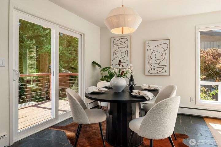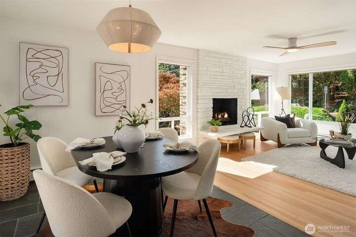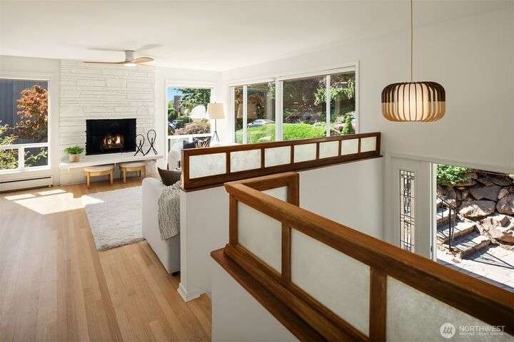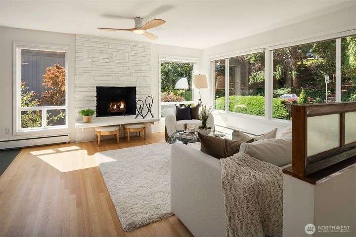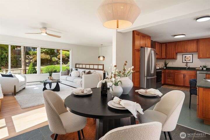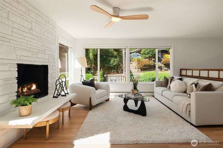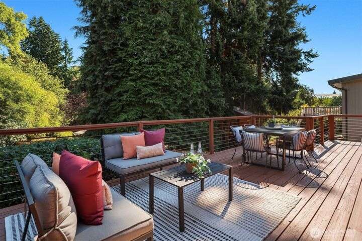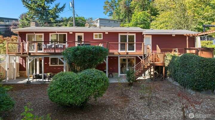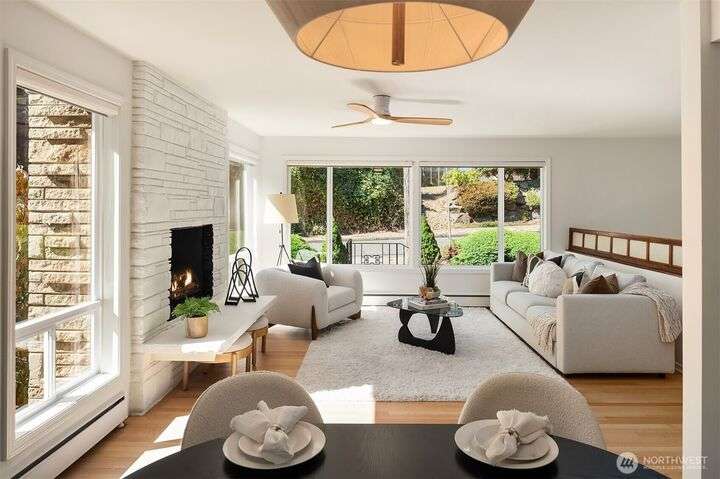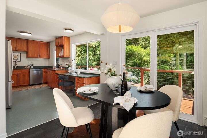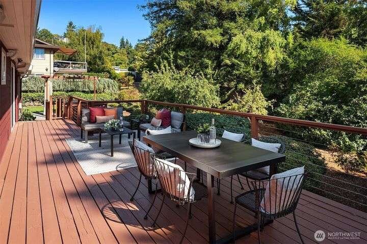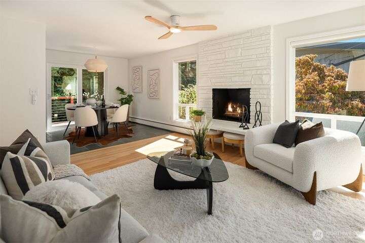 Just a block or so from the enchanting shoreline of Lowman Beach, discover this refreshed Mid-Century sited on a rare 1/4 acre city lot. This home really delivers with 2 bedrooms, living, dining, full kitchens + a wood burning fireplace on each level ~ offering effortless access to a deck or patio with serene and private backyard views. Fantastic indoor/outdoor synergy, perfect for entertaining. The inviting main level is bathed in natural light, showcasing modern updates and beautifully refinished hardwood floors; while maintaining the vintage 50's charm. Deck and patio span the entire east side of the home, with access to hot tub, 2 car garage and mature gardens. Nearby Lincoln Park, a West Seattle gem, offers 135 acres to explore!