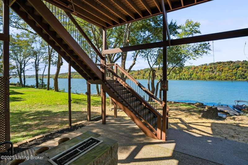 Enjoy sweeping river views and end each day with a sunset over the water. This stunning Ohio River home was designed for effortless living—whether you're entertaining on the full-width deck, relaxing by the fire-lit patio, or heading down to your private dock for a boat ride. Inside, an elevator carries you to the main living level with a vaulted great room, dining area perched for better views, and a bright kitchen with windows offering views of the ever-changing river and wildlife. The spacious primary suite feels like a private retreat, while the loft and lower-level offer plenty of flexible space. The lower level has enormous space to entertain guests with a projection TV, built-in Bourbon barrel wet bar, a full bath and flex space for a bedroom, office or hobbies. With low-maintenance materials, extra parking, and elevated construction above the floodplain, this home pairs riverfront beauty with peace of mind.