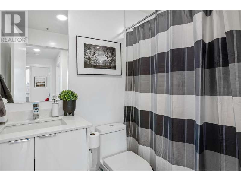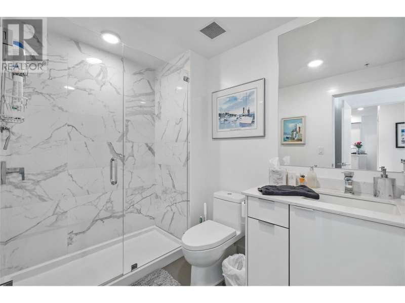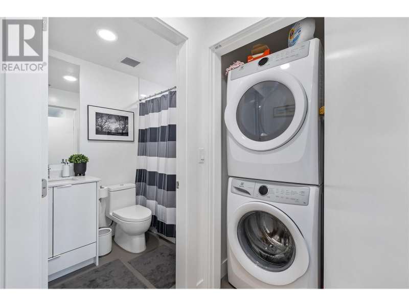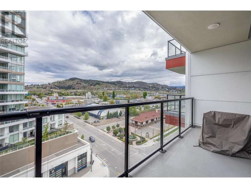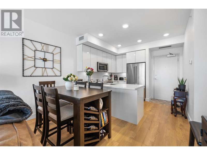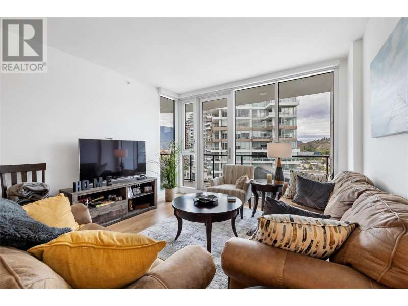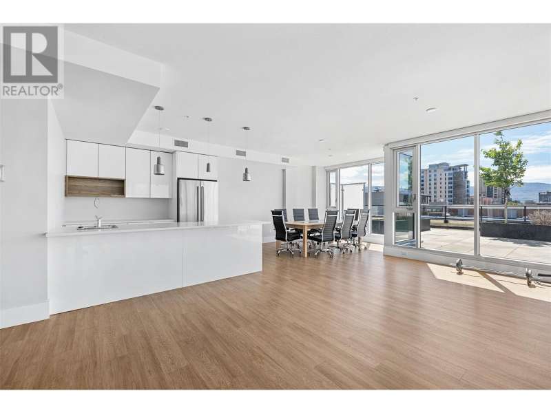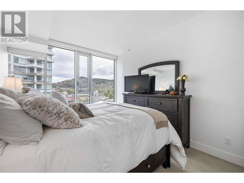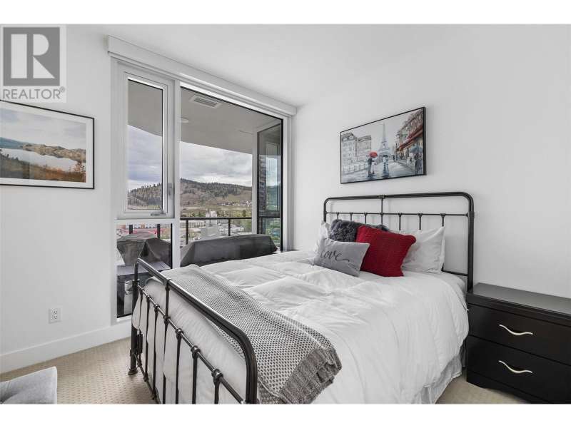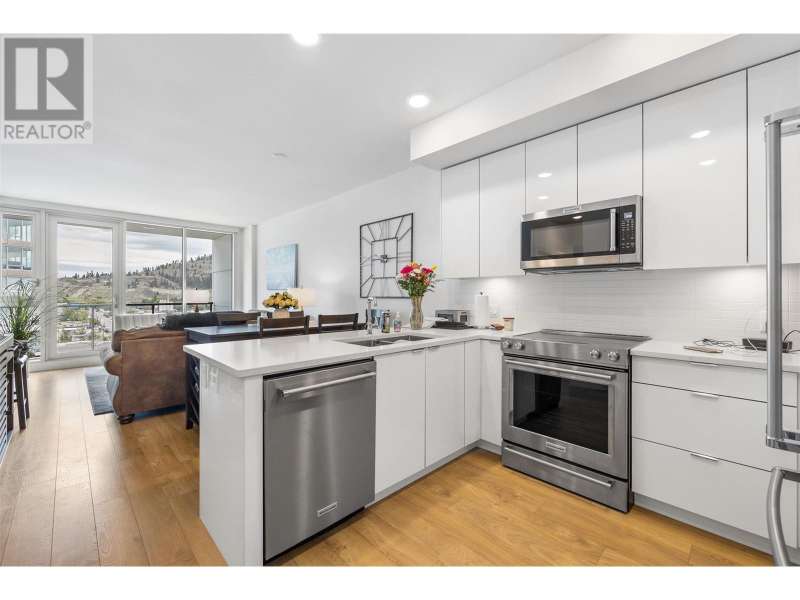 This spacious unit features 2 bedrooms plus den/bedroom, all surrounded by floor-to-ceiling windows that flood the apartment with natural light, creating a warm and inviting atmosphere. The entertainer's kitchen boasts KitchenAid stainless steel appliances, high gloss soft-close cabinets & sit-up island. The open-concept living and dining with natural light. The spacious master bedroom includes stunning ensuite with a large walk-in tile and glass shower. The second bedroom features ample closet space, while the den serves as a versatile work-from-home area or third bedroom. Ellis Parc offers an array of amenities, including fully-equipped gym, well-appointed boardroom, and outdoor terrace for relaxation and BBQ. Additional conveniences include in-suite laundry, covered secured parking stall, storage locker, luxury vinyl and tile flooring. Nestled in the heart of downtown Kelowna, Ellis Parc is just a short walk from restaurants, shopping, and Prospera Place, making it an ideal location for vibrant city living. (id:58403)