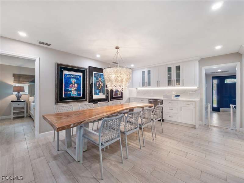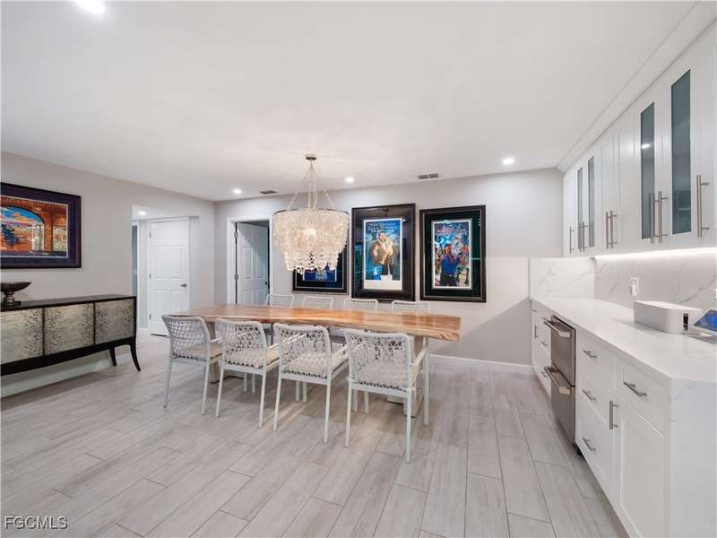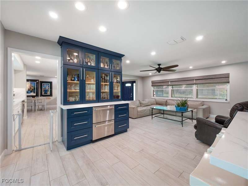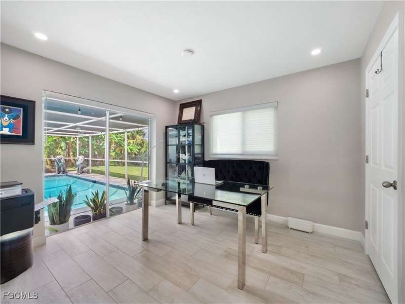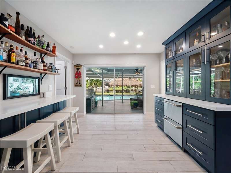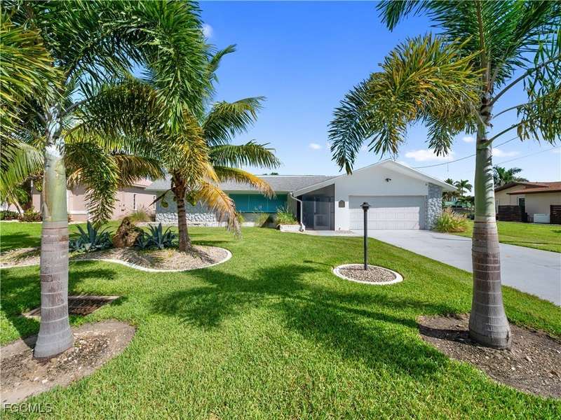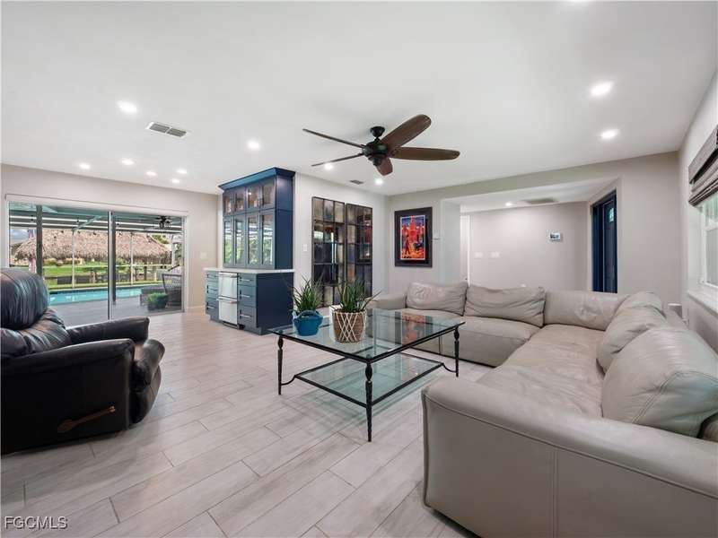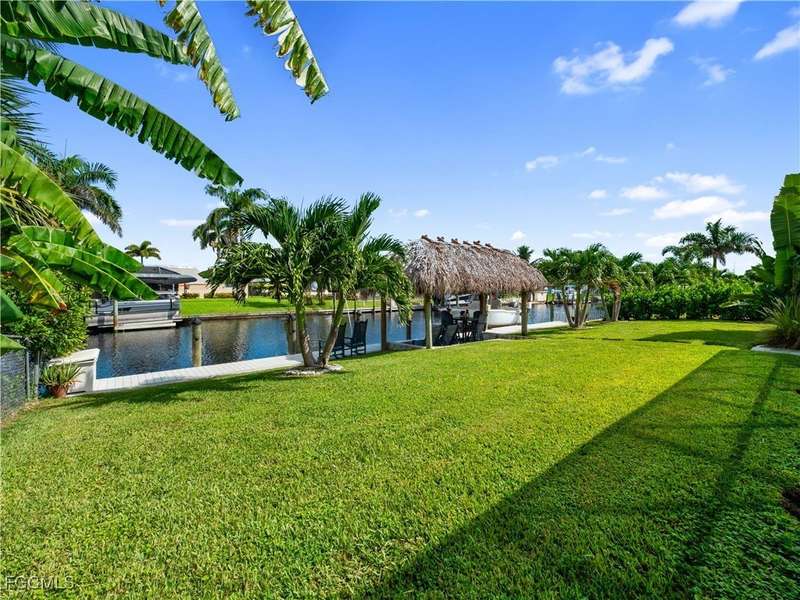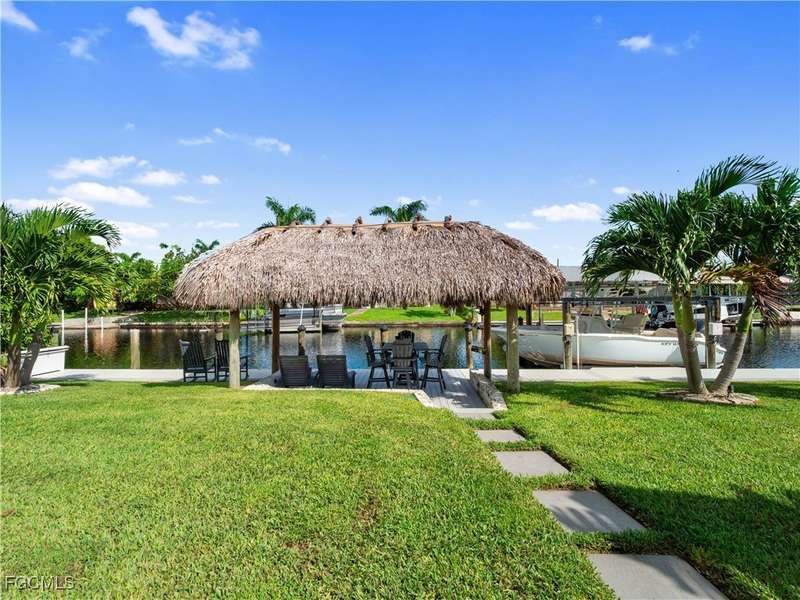 One of the very few 4-bedroom Direct Gulf Access homes available in this desirable section of Cape Coral, this property delivers the ultimate boating lifestyle and a fully reimagined interior. Offering just under 2,000 sq. ft. of living space, it is perfectly situated on a 1/4 acre lot with coveted Northwest exposure, giving you evening sunsets, shaded afternoons on the lanai, and effortless boating just minutes to the Caloosahatchee River...NO bridges, deep water access. Outdoor living shines here with a deep pool featuring a brand-new tile deck beneath a screened lanai, a fully fenced backyard with fruit trees and lush landscaping, and an inviting Chickee hut that's perfect for entertaining. The composite dock is equipped with a 10,000 lb. boat lift, canopy cover, and direct access to the Gulf, making it every boater's dream. Inside, the home has been tastefully and extensively renovated with brand-new hurricane impact windows, new plumbing throughout, a newer roof, newer AC, and a newer tankless water heater. The bright and open floor plan includes 4 bedrooms and 3 full bathrooms, with a Jack-and-Jill bath for guests, a pool bath with direct outdoor access, and a beautifully designed master suite complete with a custom closet and its own mini split for personalized cooling. Designer details stand out with top-of-the-line stainless steel appliances, motorized custom window treatments, three custom bar areas with freezer/mini fridges, and thoughtful shelving in all linen and storage closets. Even the garage is a highlight with epoxy flooring, built-in Husky cabinets, recessed lighting, an insulated door, mini-split for cooling, and wiring at the breaker box for a Generac system. Beyond the property itself, the location is unbeatable with Cape Coral rapidly expanding, including the exciting Bimini Basin project that will soon transform the area into a vibrant, walkable district of shops, dining, and entertainment just moments away. This thoughtfully redone home blends boating, lifestyle, and city growth into one incredible opportunity...four bedrooms, a pool, incredible boat dock, direct Gulf access, and every upgrade already done. Last step, Move in & Enjoy...