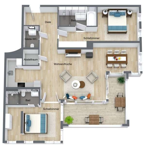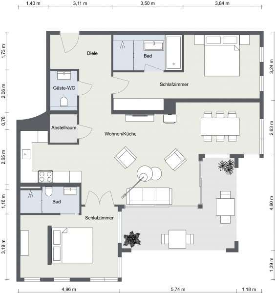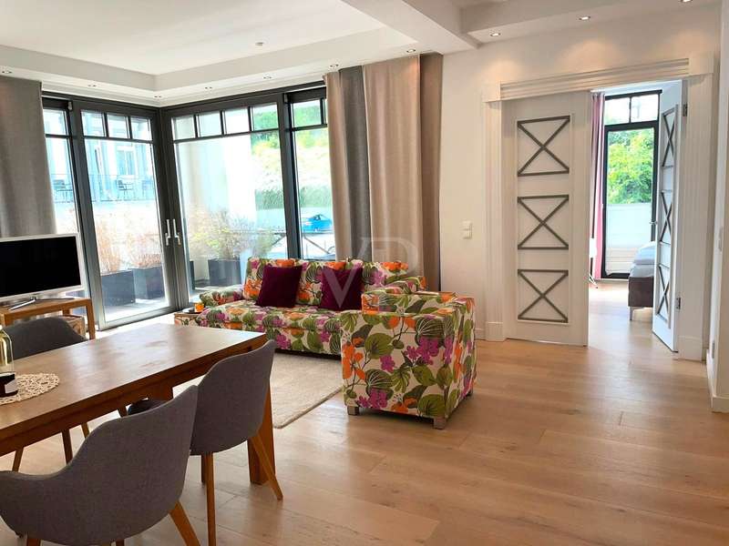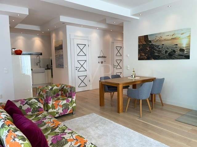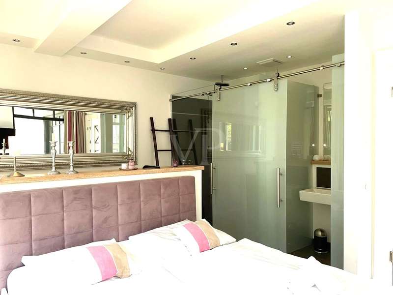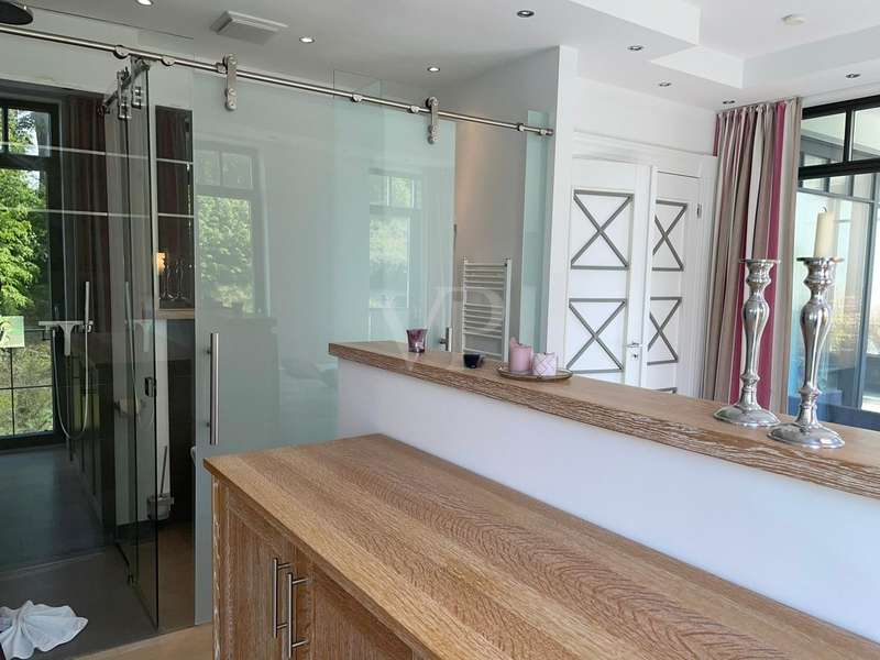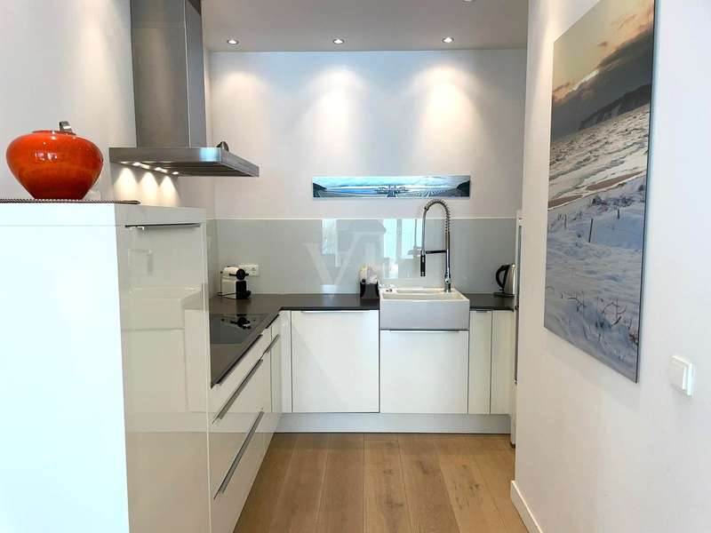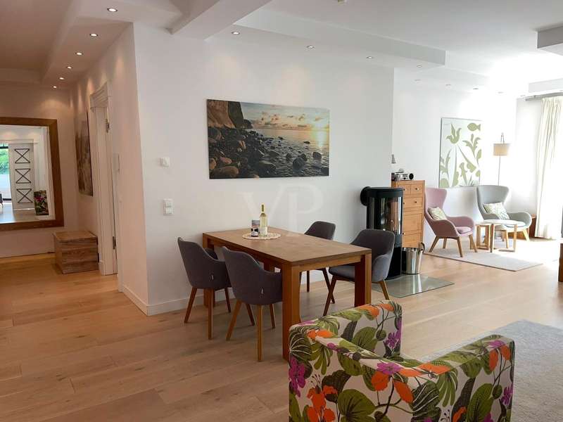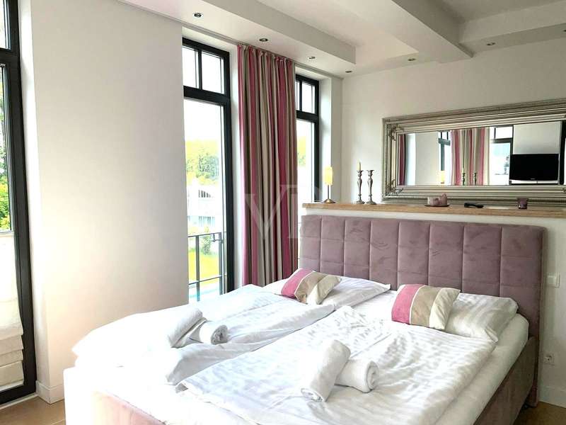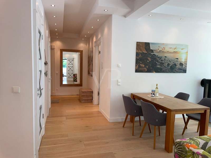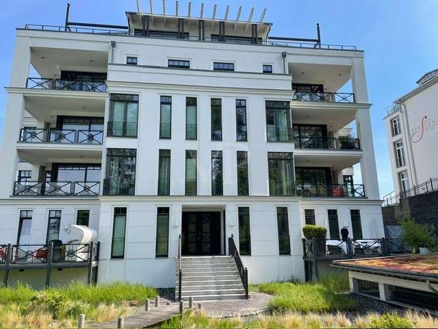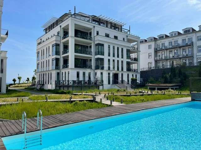 The exclusive Villa Claire in the Baltic seaside resort of Sellin is situated in a prominent location on Sellin's high shore, just a few steps from the main beach and right by the sea. The modern and functional architecture of the building impresses with its elegant design. High-quality materials such as natural stone, oak wood and manufactured tiles have been used in the furnishings to create an elegant and contemporary atmosphere. The outstanding materials of excellent quality come from German manufacturers. Underfloor heating throughout provides cozy warmth, while towel warmers in the bathrooms provide additional comfort. This modern apartment with a living space of approx. 114 m² is located in a new building from 2012, in as-new condition and impresses with its high-quality furnishings. The high-quality furnishings and modern architecture make this apartment an exclusive retreat. The apartment offers enough space for 3 rooms, including 2 bedrooms and 2 bathrooms. The underfloor heating ensures cozy warmth throughout the apartment and the high-quality furnishings leave nothing to be desired. A high-quality kitchen with an oven, ceramic hob and fridge awaits you and impresses with its functionality. Both bedrooms are equipped with their own flat-screen TV and en-suite bathroom. These bathrooms each have a floor-to-ceiling shower, WC and towel dryer. One en-suite bathroom also has a bathtub. The entire apartment is equipped with underfloor heating, which provides pleasant warmth. From the apartment's balcony, residents can enjoy a side view of the sea and enjoy the fresh sea air. Other amenities at Villa Claire include a Wi-Fi connection, elevator, washing machine and dryer in the villa and an underground parking space. A special highlight of Villa Claire is the chill-out area with a 15 x 5 meter outdoor pool, which invites you to relax and unwind. A stay at Villa Claire promises relaxation and luxury in a modern and stylish ambience. All in all, this exclusive apartment offers an ideal combination of modern comfort, high-quality furnishings and a first-class location for a relaxing and restful vacation.