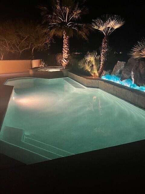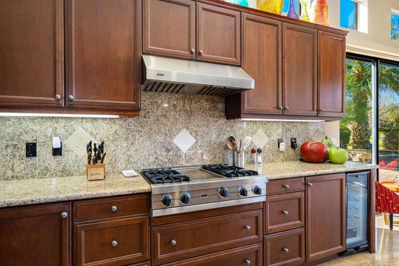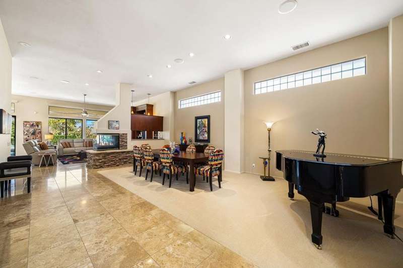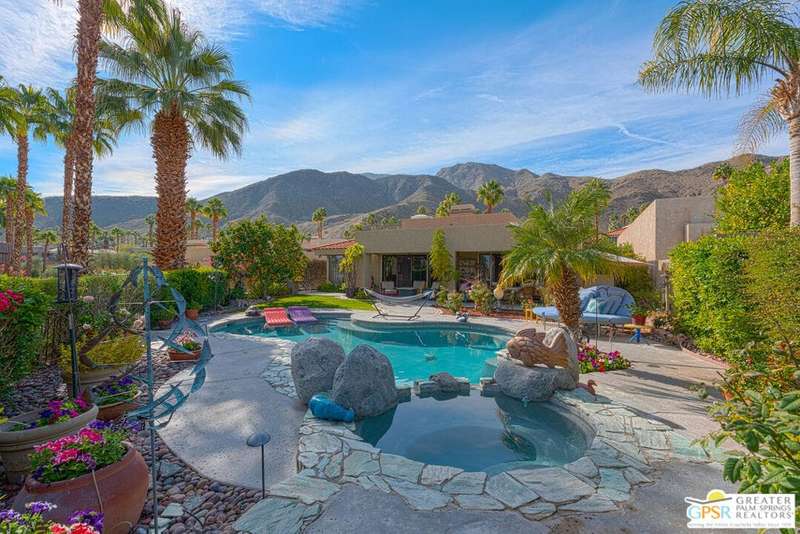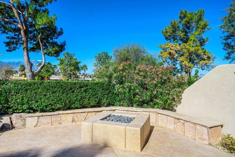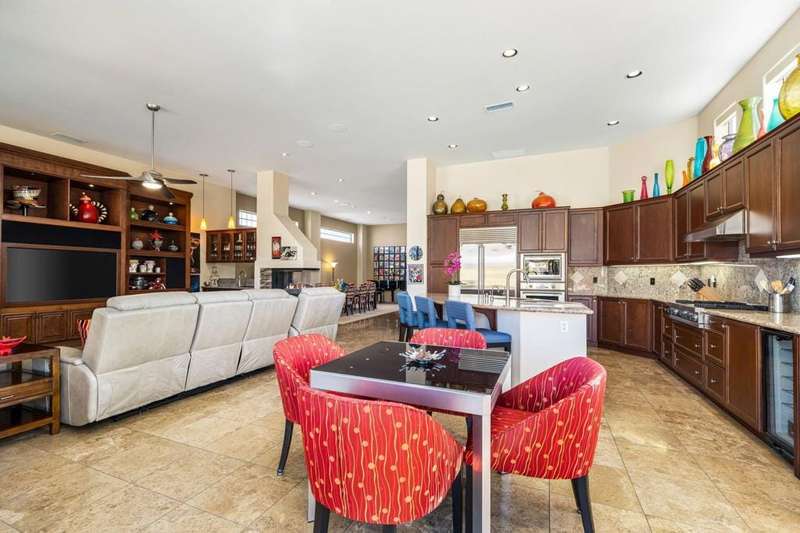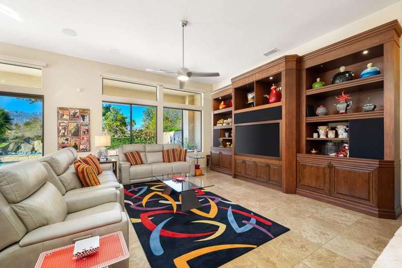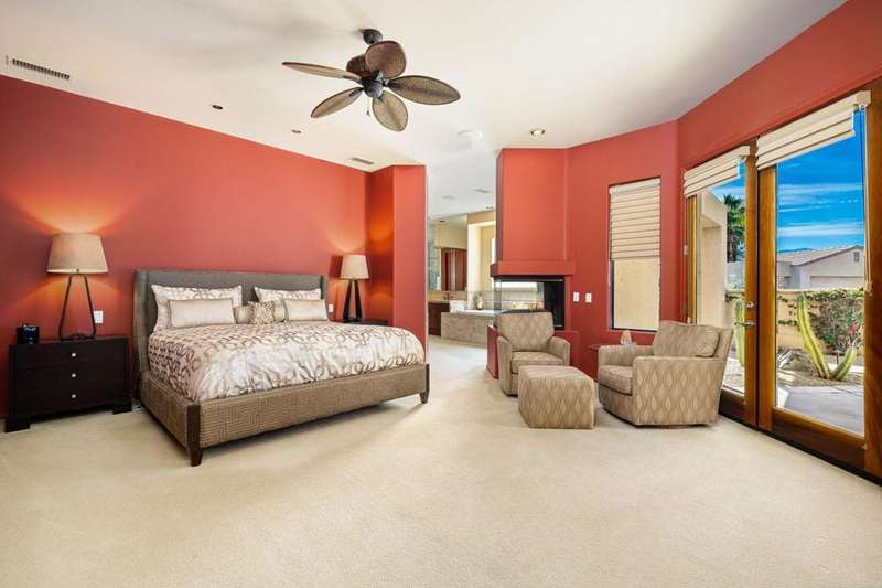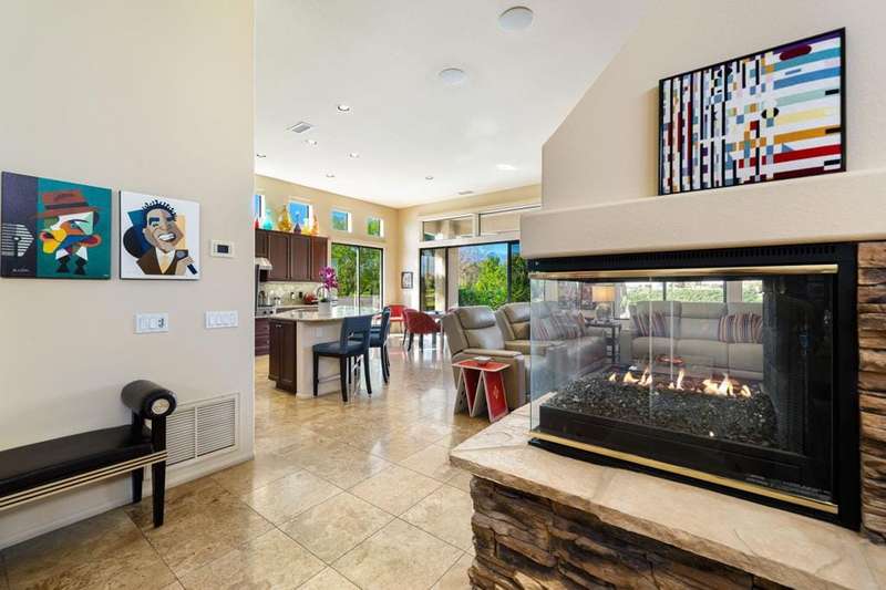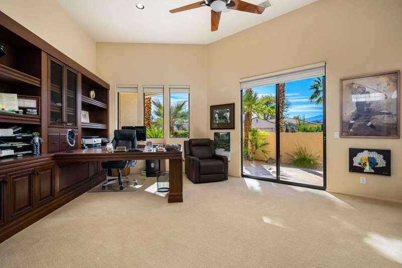 Nestled on a premium west-facing lot on the 13th tee of the Pete Dye Course, this beautifully upgraded and meticulously maintained home offers breathtaking mountain views and resort-style living. Enjoy outdoor living at its finest with a Pebble Tec saltwater pool featuring a stacked stone spillway, elevated spa, fire pit, crystal lighting stones, and a chef's outdoor kitchen--all adjacent to a covered patio, perfect for entertaining. Inside, the gourmet kitchen boasts a Viking cooktop, Sub-Zero refrigerator, wine cooler, center island, and rich dark cherry cabinetry. A dramatic triple-sided glass fireplace separates the living and great rooms, which also feature a built-in entertainment center and high-tech sound system. Electric shades in the kitchen and great room make managing sunlight effortless. The spacious primary suite includes a cozy fireplace, walk-in closet, and spa-like bath with jacuzzi tub. A private guest suite offers its own outdoor patio and ensuite bath, while a third ensuite bedroom functions as a stylish office with built-in desk and workspace. Additional highlights include: Leased Solar, Tankless water heater, Full home water filtration system, low HOA that includes a social and fitness membership to Mission Hills. Call for your private showing today!