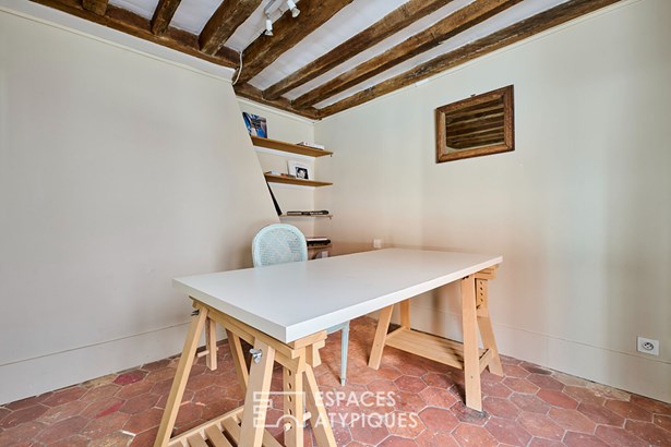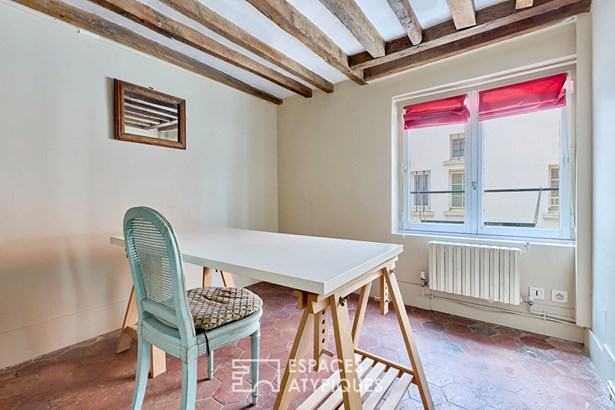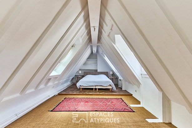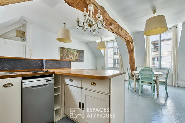 The triple exposure and various openings ensure beautiful light throughout the day. The apartment, nestled under the eaves, enjoys absolute tranquility while being located in the heart of a lively historic district.
