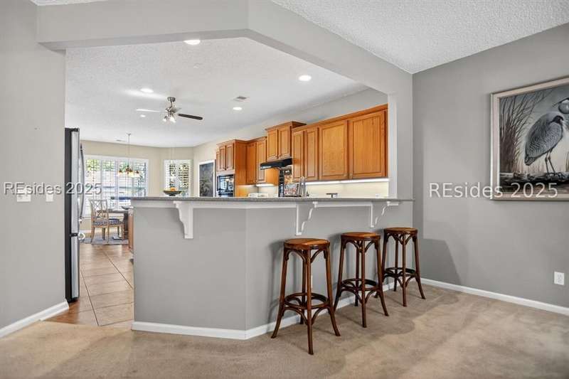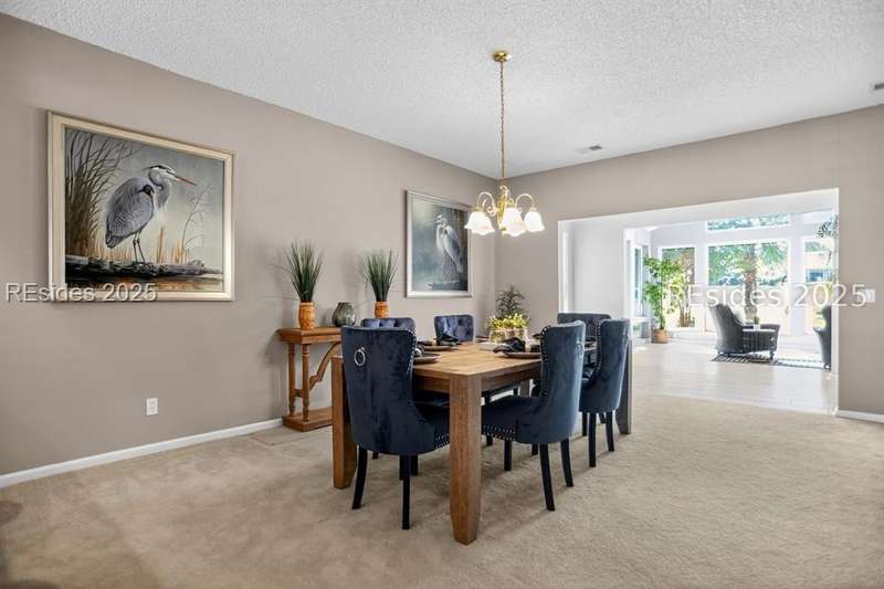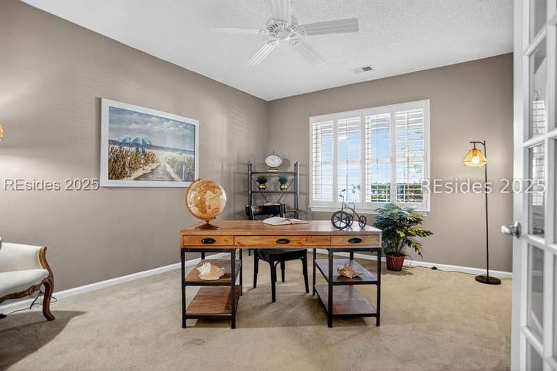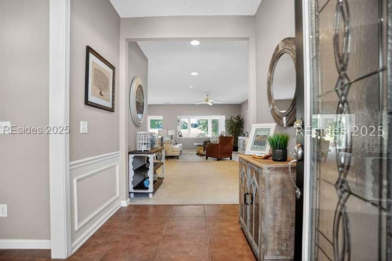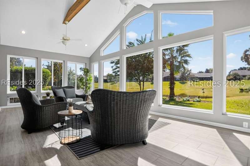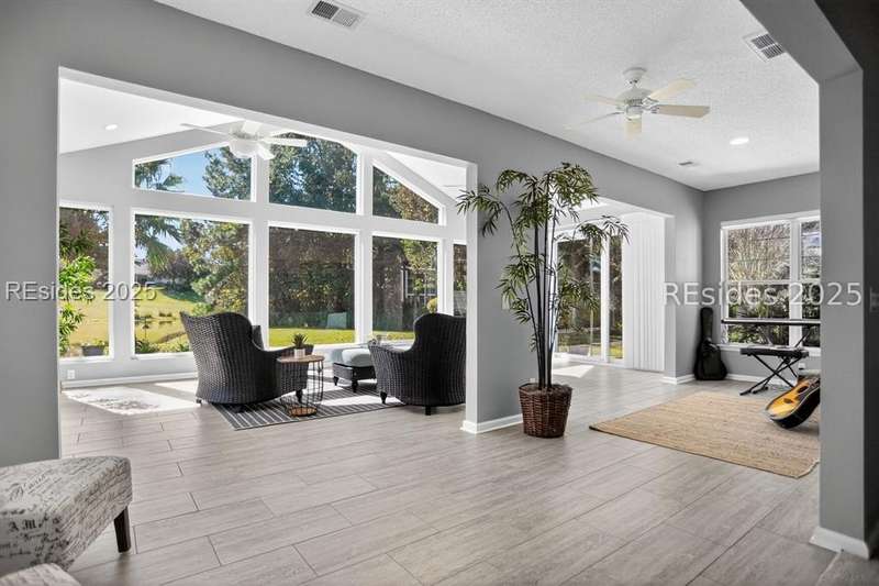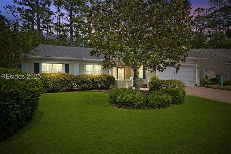 Beautiful Lilac model in Sun City Hilton Head with newer composite siding (no stucco!) installed in 2025, with a gorgeous $66,000 sunroom overlooking a lagoon. Cul-de-sc lot! Prepare to be impressed by this meticulously updated Lilac model home with 2,469 sq. ft. of spacious living space. Two bed, two bath, office. Set on a gorgeous lagoon and wooded lot, this property boasts serene, private views from the vaulted sunroom. Inviting foyer, large open floor plan, fabulous for entertaining. Charming front porch. The gourmet eat-in kitchen is features an island, breakfast bar, a gas stove, tile backsplash, built-in wine rack, and convenient pull-out shelves for easy storage. Some newer appliances. The primary suite offers two large walk-in closets, one with custom shelving, a stunning tile shower, and quartz countertops for a touch of luxury. The guest bedroom is also appointed with a walk-in closet. Recent upgrades ensure peace of mind for years to come: a new HVAC system in 2024, a tankless hot water heater, and a roof from 2017. The home's exterior was completely refreshed in May 2025 with durable Hardi board siding and a new irrigation system. Additional features include charming bay windows and a 4-foot garage extension with a full staircase leading to floored attic storage. This home combines comfort, modern style, and a prime location for the ultimate Lowcountry lifestyle.