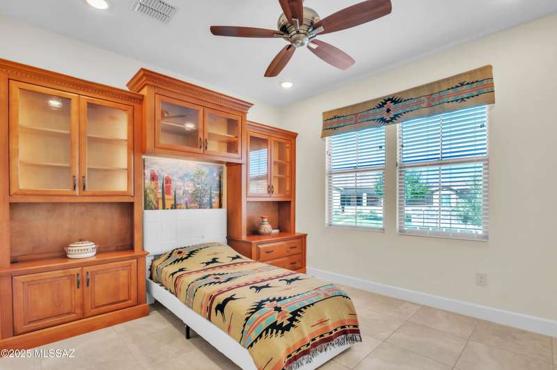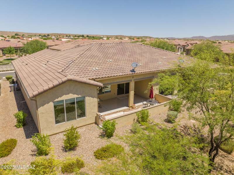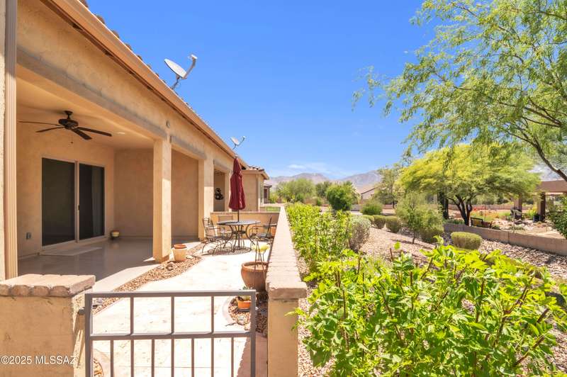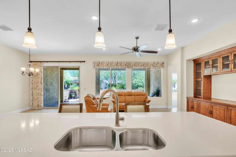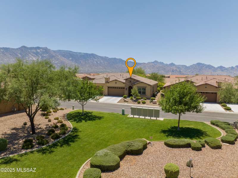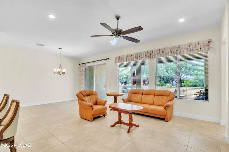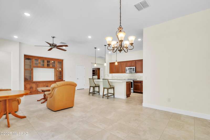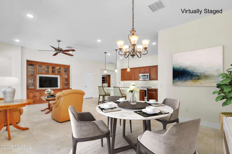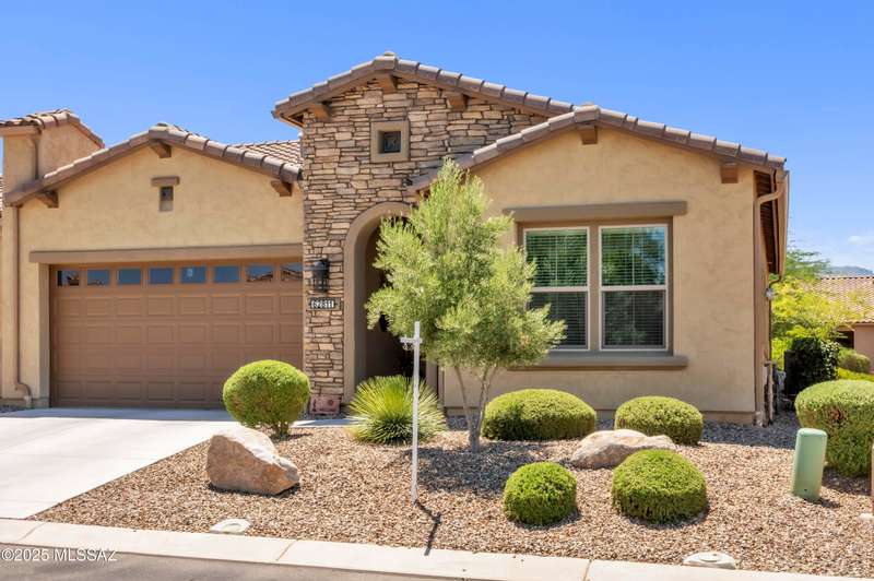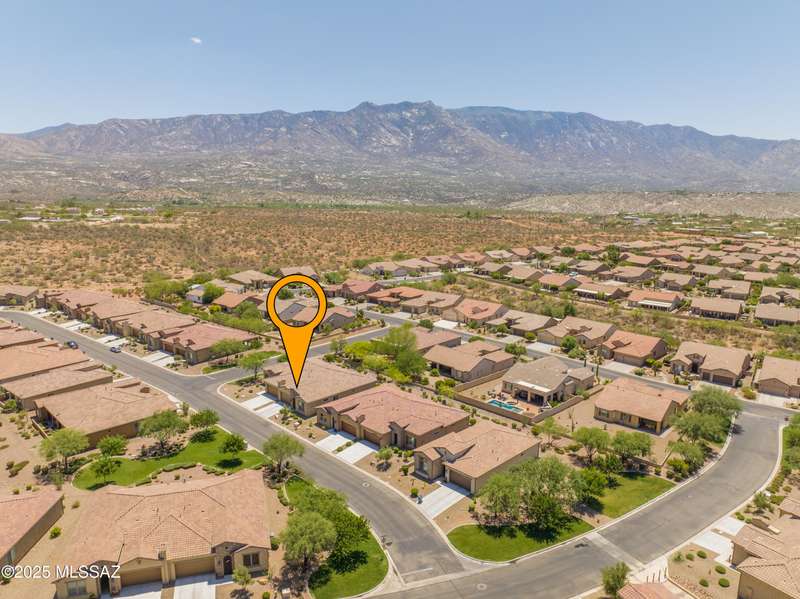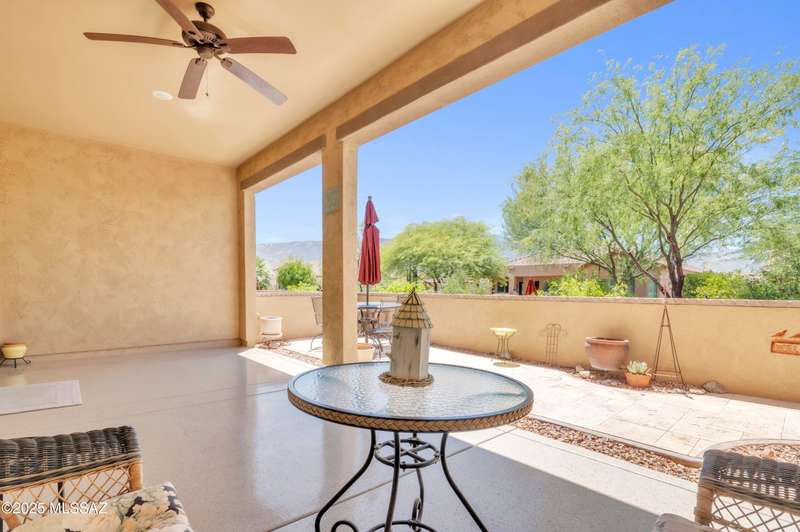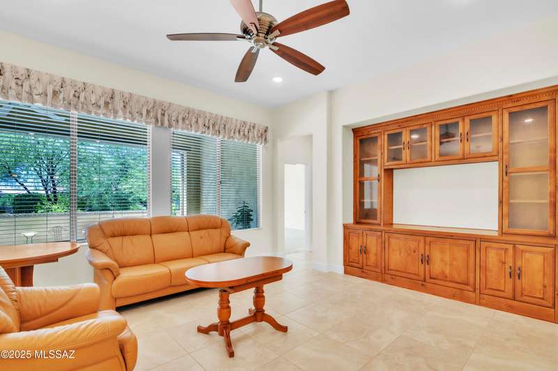 Enjoy stunning mountain views from beautifully upgraded 2019 VIVA model villa in SaddleBrooke. This 2-bedroom, 2-bath home with a den/office sits on a premium south-facing lot backing to a natural wash for added privacy. The stylish kitchen features quartz counters, stainless appliances, and upgraded cabinetry, seamlessly connected to the great room with custom built-ins. Both bathrooms include upgraded tile showers; the primary suite also offers a double vanity and walk-in closet with shelving. Outdoor living shines with an epoxy-coated covered patio extended with travertine pavers, pony wall, and water runoff design. Garage includes built-in cabinets and epoxy floor. Move-in ready villa living! Built-in living room & guest bedroom cabinets can be removed and walls repaired - only $500.