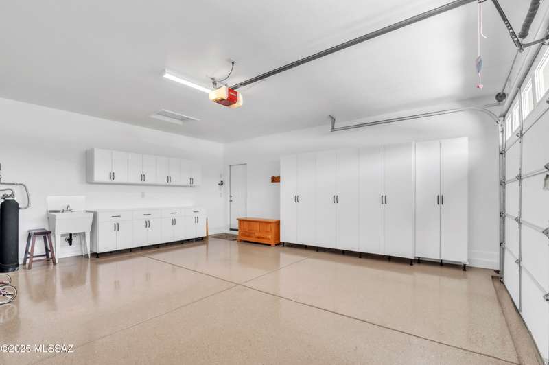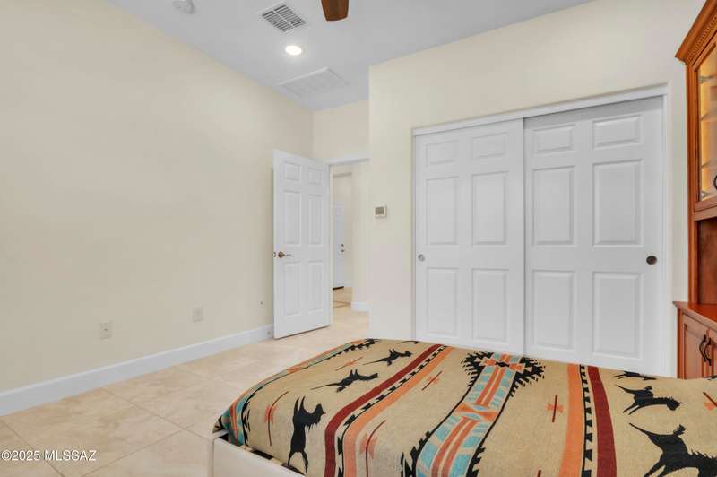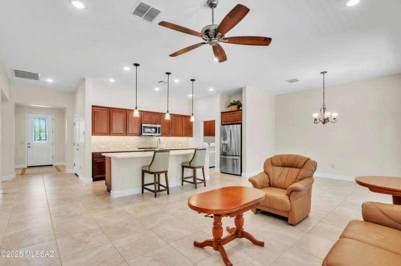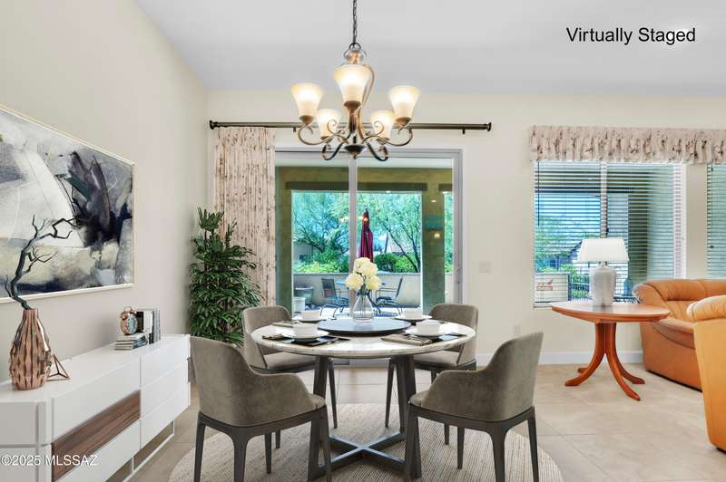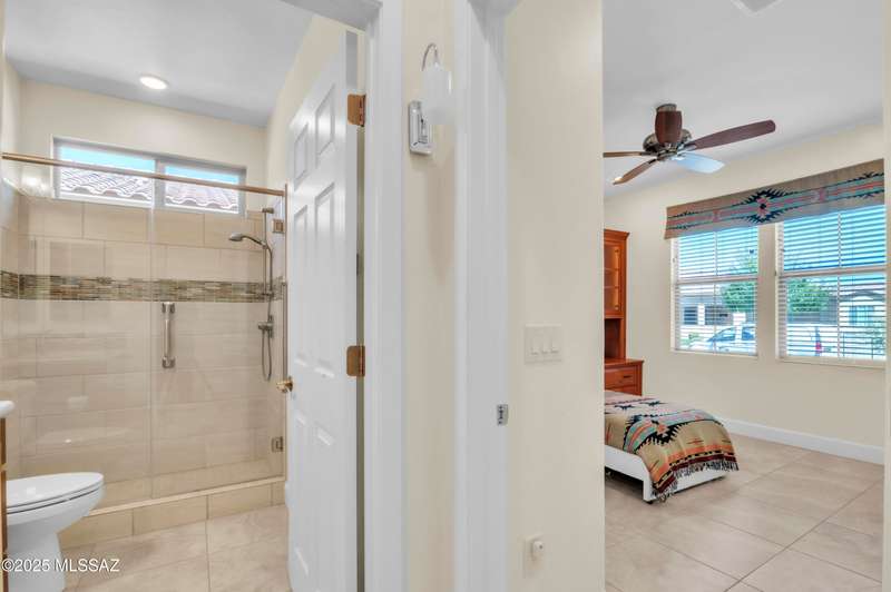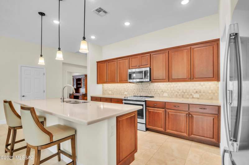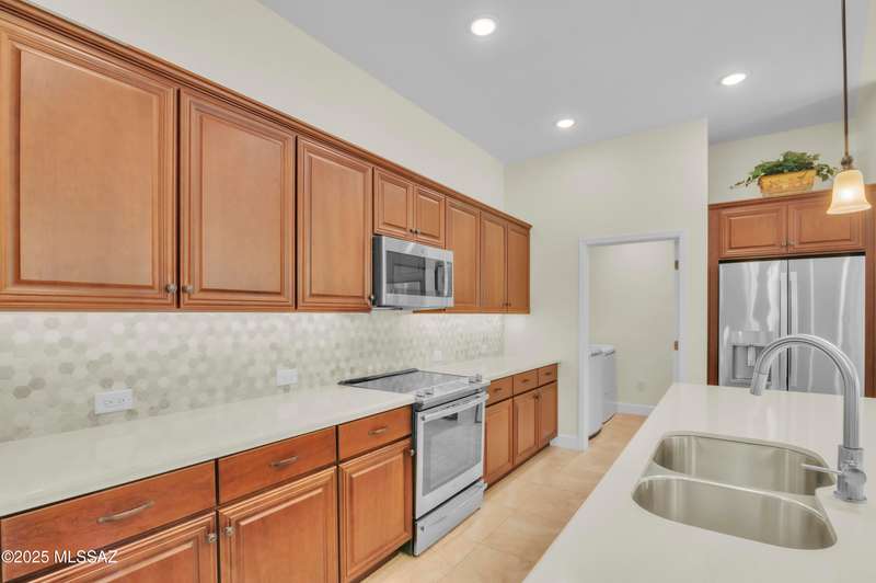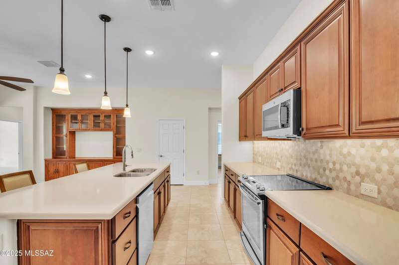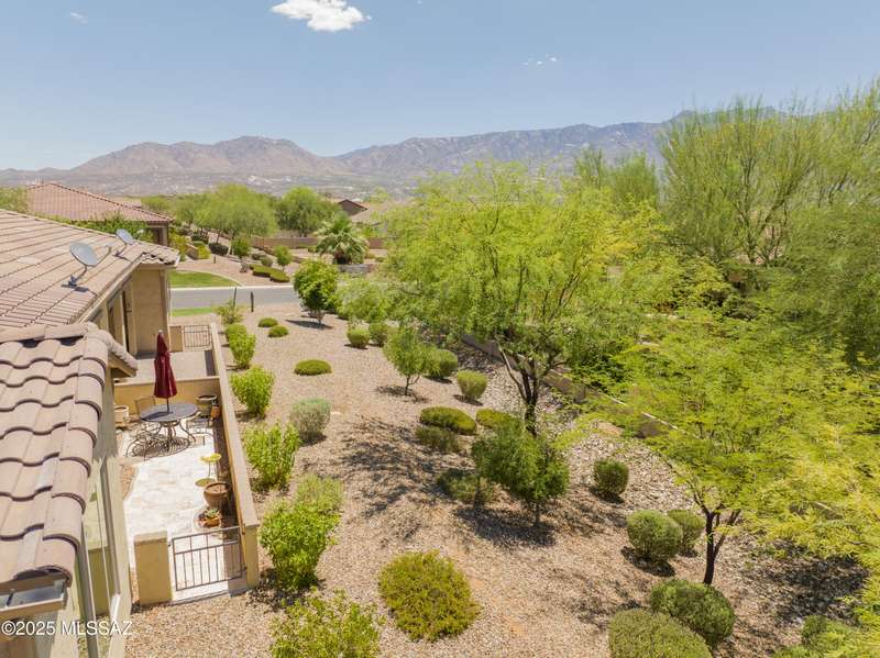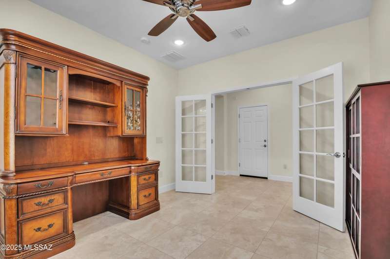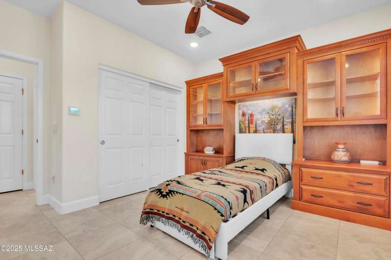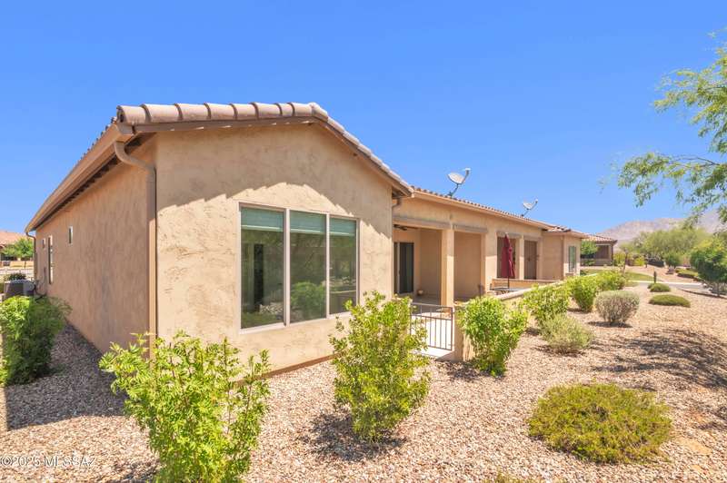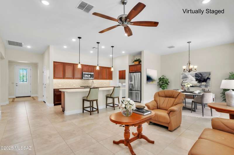 Enjoy stunning mountain views from beautifully upgraded 2019 VIVA model villa in SaddleBrooke. This 2-bedroom, 2-bath home with a den/office sits on a premium south-facing lot backing to a natural wash for added privacy. The stylish kitchen features quartz counters, stainless appliances, and upgraded cabinetry, seamlessly connected to the great room with custom built-ins. Both bathrooms include upgraded tile showers; the primary suite also offers a double vanity and walk-in closet with shelving. Outdoor living shines with an epoxy-coated covered patio extended with travertine pavers, pony wall, and water runoff design. Garage includes built-in cabinets and epoxy floor. Move-in ready villa living! Built-in living room & guest bedroom cabinets can be removed and walls repaired - only $500.