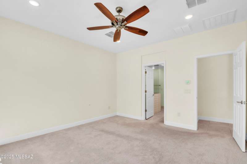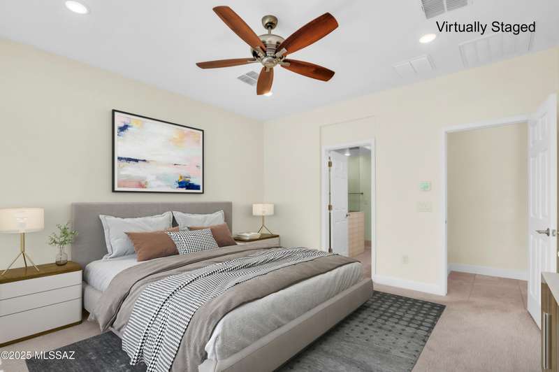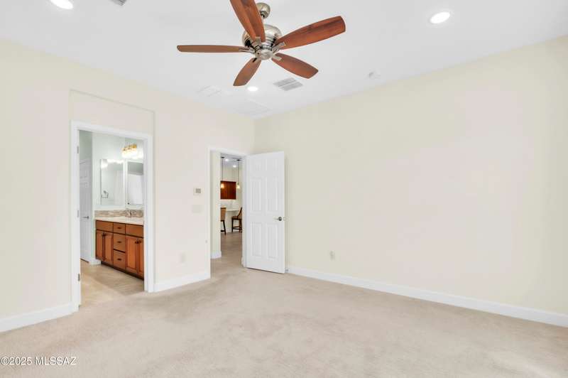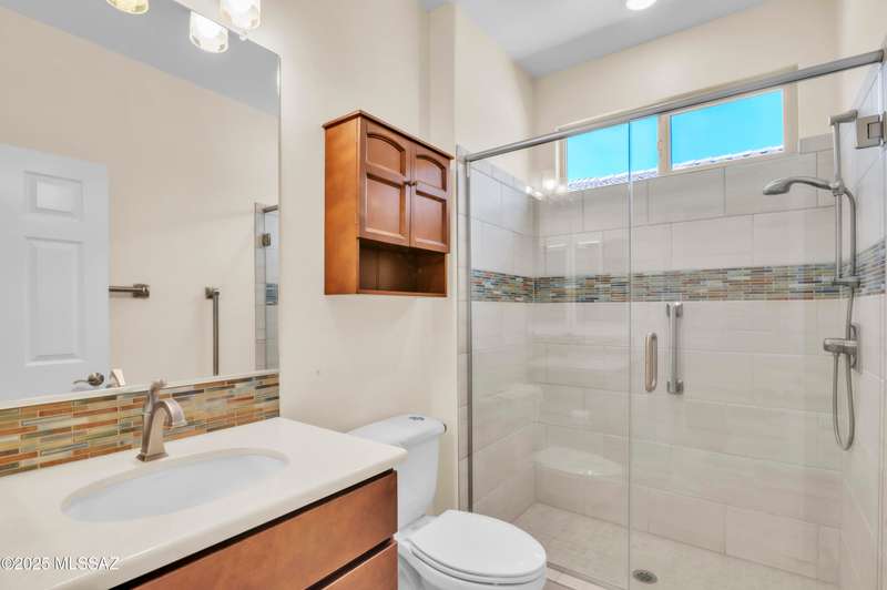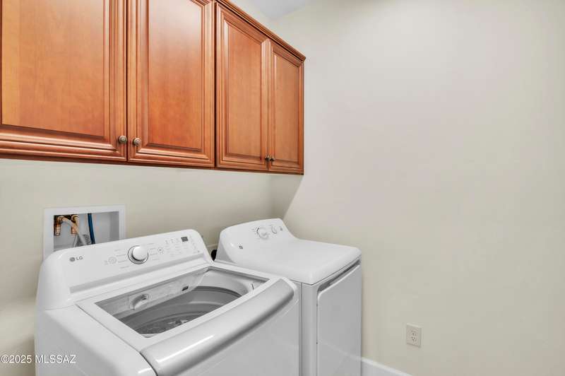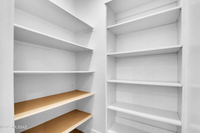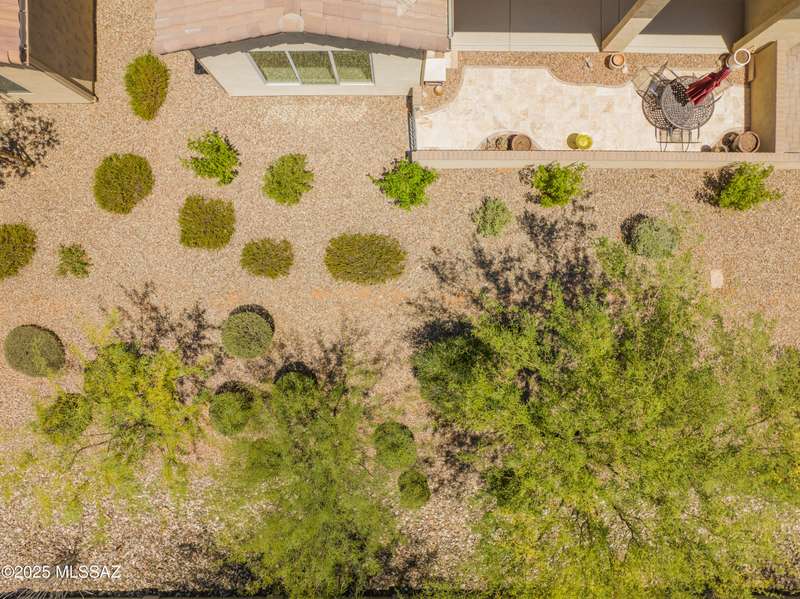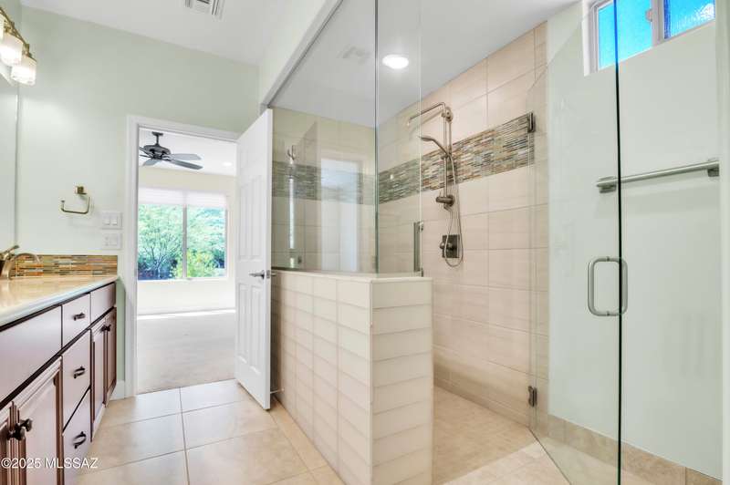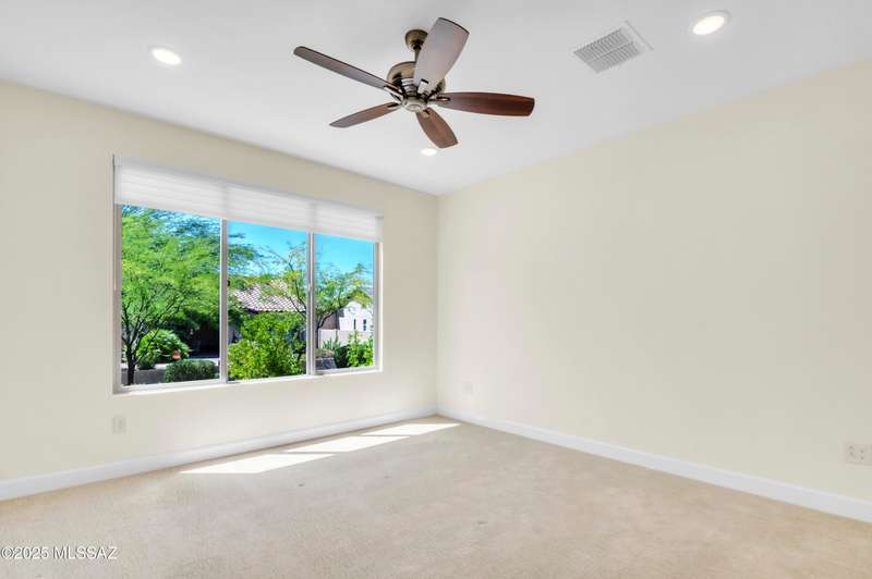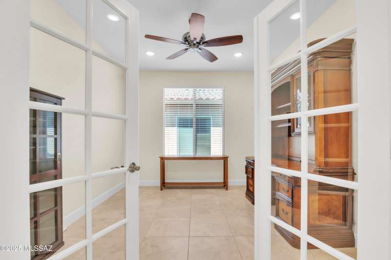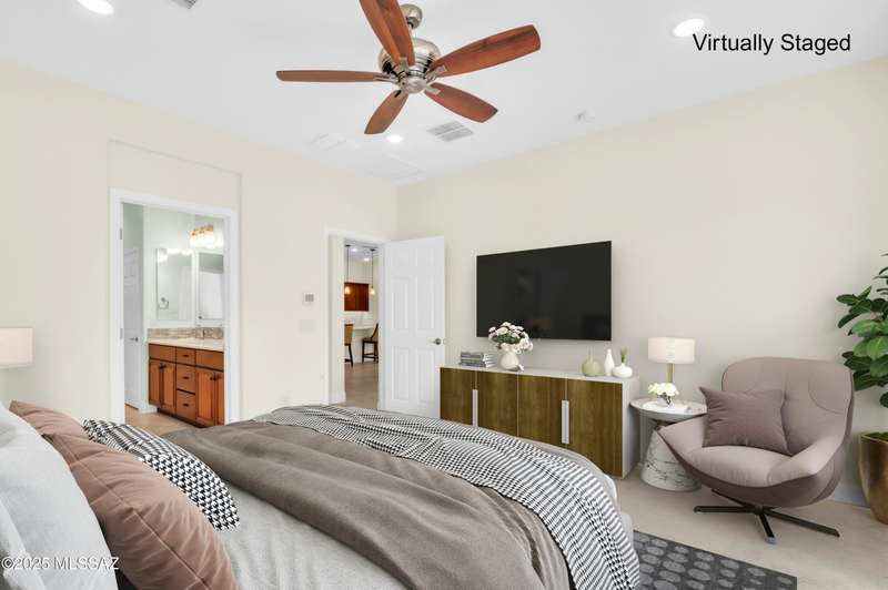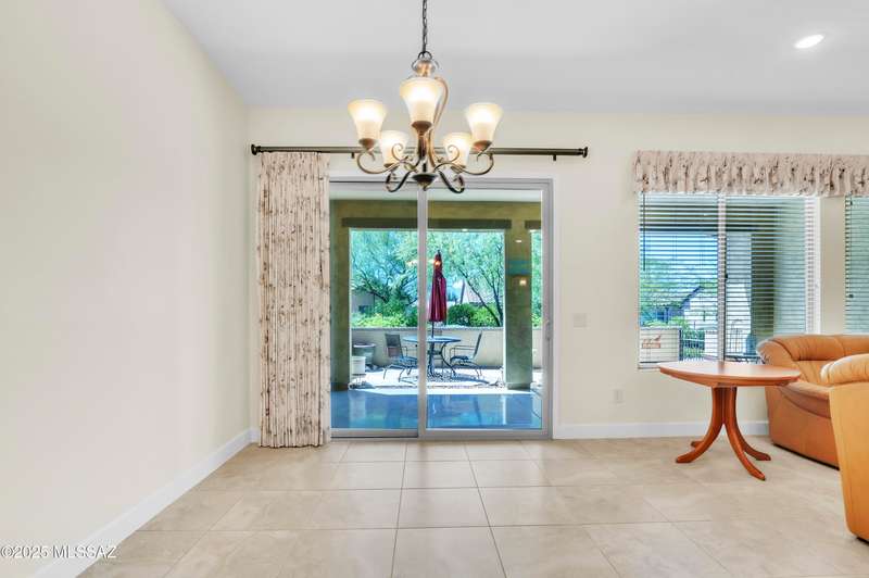Enjoy stunning mountain views from beautifully upgraded 2019 VIVA model villa in SaddleBrooke. This 2-bedroom, 2-bath home with a den/office sits on a premium south-facing lot backing to a natural wash for added privacy. The stylish kitchen features quartz counters, stainless appliances, and upgraded cabinetry, seamlessly connected to the great room with custom built-ins. Both bathrooms include upgraded tile showers; the primary suite also offers a double vanity and walk-in closet with shelving. Outdoor living shines with an epoxy-coated covered patio extended with travertine pavers, pony wall, and water runoff design. Garage includes built-in cabinets and epoxy floor. Move-in ready villa living! Built-in living room & guest bedroom cabinets can be removed and walls repaired - only $500.