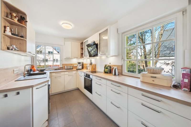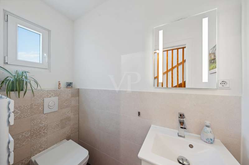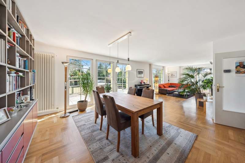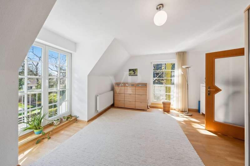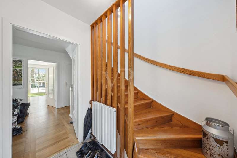 Rented since 05/ 2021 for an annual rent of € 33,600. For sale is a spacious detached house built in 1980 and located in one of the most sought-after locations in Kleinmachnow. The property offers a living space of approx. 215 m², spread over seven rooms, including six bedrooms, two bathrooms and an additional guest WC. This generous room layout provides ample space for living and working. The house was extensively modernized in 2005 and 2021. The extension of the house in 2005 resulted in a gain of approx. 62 m² of additional living space, with additional thermal insulation installed on the ground floor as well as on the upper floor and attic. A modern gas-solar hybrid heating system was installed in 2021, ensuring efficient heating. The plot covers 1,207 m² and offers a variety of possible uses. The outdoor pool was renovated in 2022 and provides refreshing hours on warm days. The spacious terrace invites you to spend relaxing hours outdoors, while the garden with its mature trees is a green oasis where you can experience nature to the full. The garden is also enclosed by a new garden fence. On the first floor, you can enjoy the view of the greenery through the many floor-to-ceiling windows, which are fitted with lockable olives and offer additional security. The rooms on the upper floor are also flooded with light and bright. The converted loft offers additional living space or room for creative uses. The house has a full basement, which creates further storage space or additional usable space. An underground garage and a parking space are also available. You can access the house directly from the underground garage, which is equipped with an electric roller shutter door. The property combines modern living comfort with generous open space. A tool shed in the garden completes the offer and provides space for garden tools and other utensils. Viewings are possible by appointment. Take the opportunity to get to know this detached house with its numerous amenities.