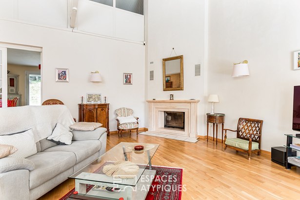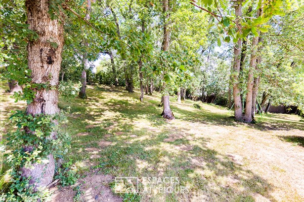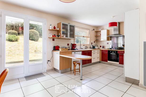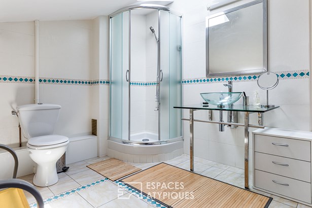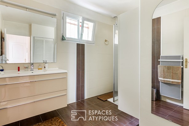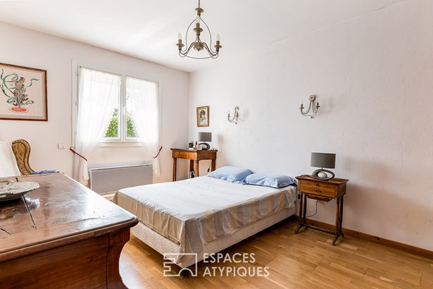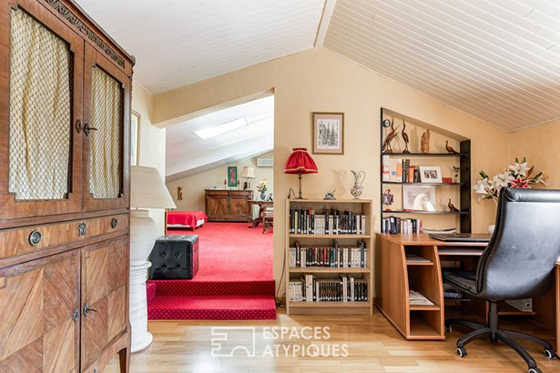 Upstairs, a large landing that can be used as an office leads to two attic bedrooms equipped with skylights, a bathroom, and a toilet. An adjoining attic offers the possibility of converting into an additional room. The house also benefits from fiber optics, air conditioning, and photovoltaic panels for greater comfort and energy efficiency.