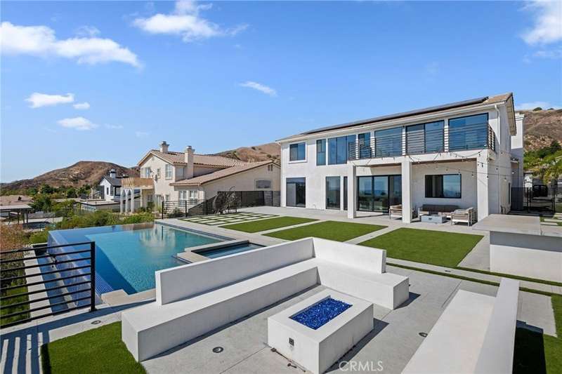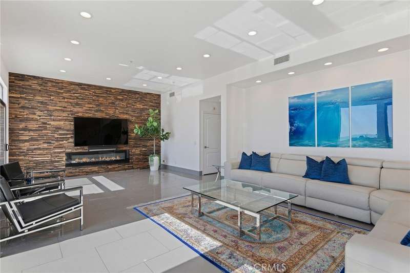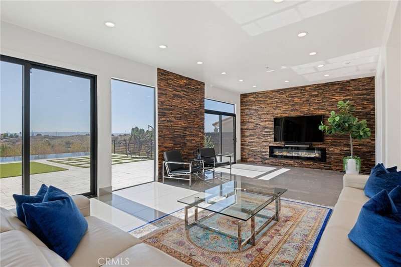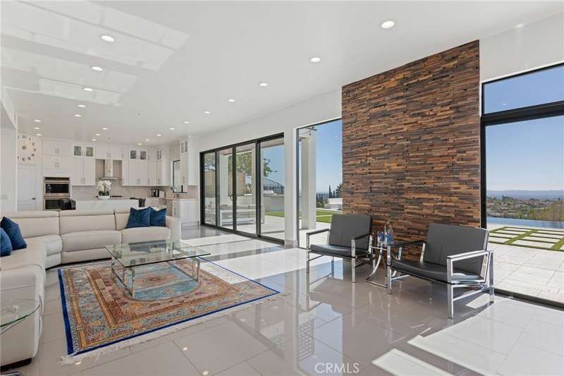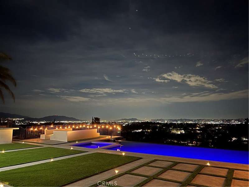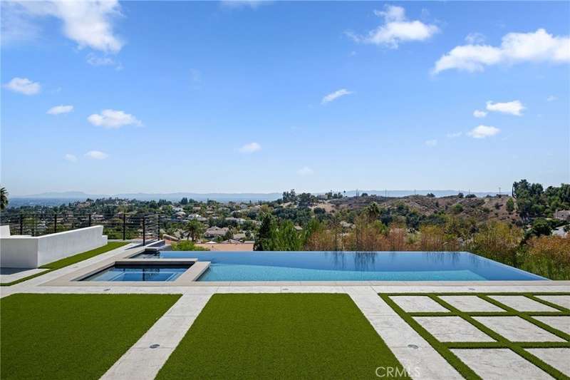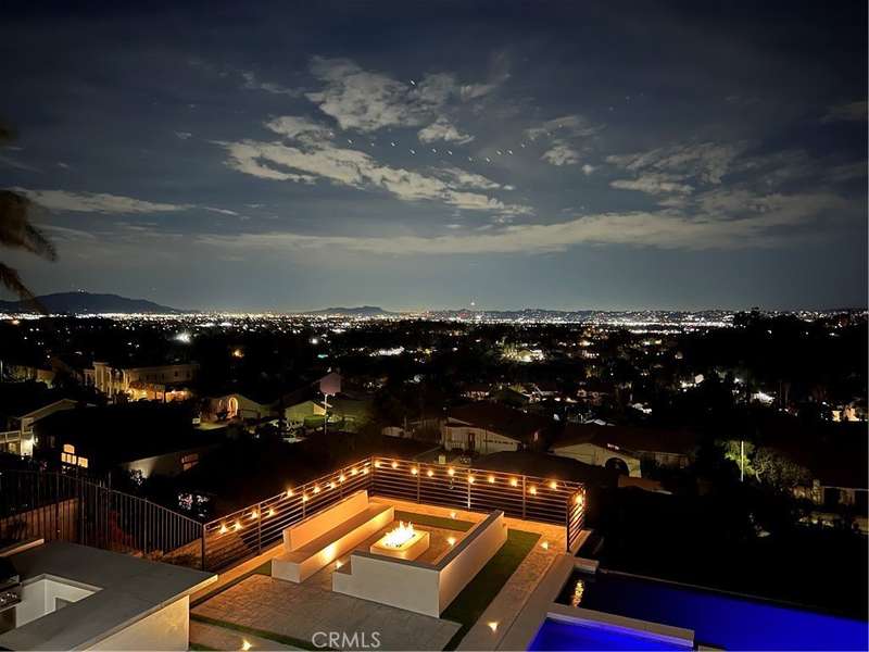 Masterpiece of Modern Luxury and Timeless Elegance! Step into a world of refined sophistication and breathtaking beauty at this exquisitely remodeled estate, perfectly situated to capture panoramic views of the San Fernando Valley and beyond. From the moment you enter through the custom front door, the grand entrance sets the tone for the luxury that awaits. The opulent living room greets you with custom stone flooring and a striking stone fireplace, offering a warm and elegant ambiance. Adjacent, the formal dining room seamlessly connects for effortless entertaining, making every gathering a special occasion. At the heart of the home lies a true chef’s kitchen – a culinary dream outfitted with top-of-the-line stainless steel appliances, double ovens, a built-in microwave, and quartz countertops with a waterfall edge. The oversized island is ideal for casual dining or hosting, while a walk-in pantry and window showcasing mountain and city light views complete the space. The spacious family room features soaring ceilings, recessed lighting, and a custom stone accent wall with a built-in fireplace. A sleek custom slider opens to your private backyard oasis, blurring the line between indoor and outdoor living. On the main level, a full bathroom with a custom shower adds both convenience and luxury. Ascend the custom wood staircase, accented by a stunning marble wall, to discover the primary suite – a true sanctuary. Enjoy your own private balcony with sweeping, floor-to-ceiling views of the valley and city below. The spa-inspired en-suite bathroom has been fully reimagined with a soaking tub, luxurious stone finishes, and a serene atmosphere perfect for unwinding. The upper level also offers an expansive loft with uninterrupted panoramic views, ideal for a media space, home office, or additional lounge. A downstairs indoor laundry room and energy-efficient solar panels add practical comfort to the home’s abundant style. Show-stopping backyard is an entertainer’s dream. Dive into the custom infinity pool and spa, gather around the fire pit, or prepare a meal in the custom outdoor kitchen. Multiple sitting areas, additional fire features, and lush landscaping complete this ultimate resort-style retreat. This home is a private escape where luxury, design, and natural beauty converge. Experience the pinnacle of Southern California living in this one-of-a-kind estate that delivers elegance, comfort, and unmatched views in every direction.