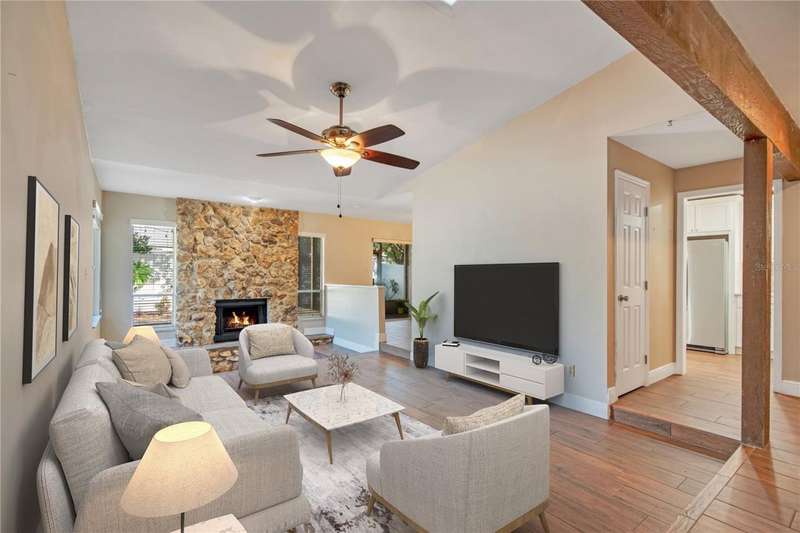 One or more photo(s) has been virtually staged. Are you searching for a move-in ready home in a prime Casselberry location? Whether you're looking to raise a family or downsize into something more manageable, this beautifully maintained three-bedroom, two-bath home with 1,547 square feet of living space is the perfect fit. Nestled on a desirable corner lot in Sausalito Shores, the property offers stunning curb appeal with its well-manicured lawn and the timeless charm of mature oak trees providing shade and character.Step inside and fall in love with the thoughtful updates throughout. The home greets you with wood-style ceramic tile flooring, adding warmth and rustic elegance. The spacious living room, complete with a cozy wood-burning fireplace, is the ideal gathering spot for holidays, game nights, or quiet evenings. Imagine sipping hot cocoa by the fire while making cherished memories with loved ones.The updated kitchen is a chef's delight, featuring modern cabinetry, quartz countertops, stainless steel appliances, and a gas oven-a rare find in Florida homes. Your private owner's suite is tucked away for peace and relaxation, complete with a spa-like bathroom boasting dual sinks and quartz counters. Two additional bedrooms and a guest bathroom down the hall provide plenty of room for family or guests.The backyard is a true oasis, offering a perfect place to soak up the Florida sunshine or host summer barbecues. Living in Sausalito Shores brings so much more than just a home-it offers a lifestyle. With an optional HOA, you gain access to fantastic amenities including a private boat ramp to Lake Howell, a clubhouse, pavilions, dog run, playground, and even boat or RV storage.The location is truly unbeatable. Conveniently situated near SR 436 and Red Bug Lake Road, you'll find everyday essentials within easy reach, while major destinations like Disney and the Kennedy Space Center are only about 45 minutes away. I-4 is just 15 minutes from your doorstep, and nearby parks like Wirz Park, Lake Concord Park, Secret Lake Park, and Wheels Park East and West ensure there is always something to enjoy just minutes from home.This Casselberry home for sale is ready for its next chapter-and its next owner. With everything you could want and more, it won't last long. Schedule your private showing today and experience 402 San Leandro Dr for yourself!