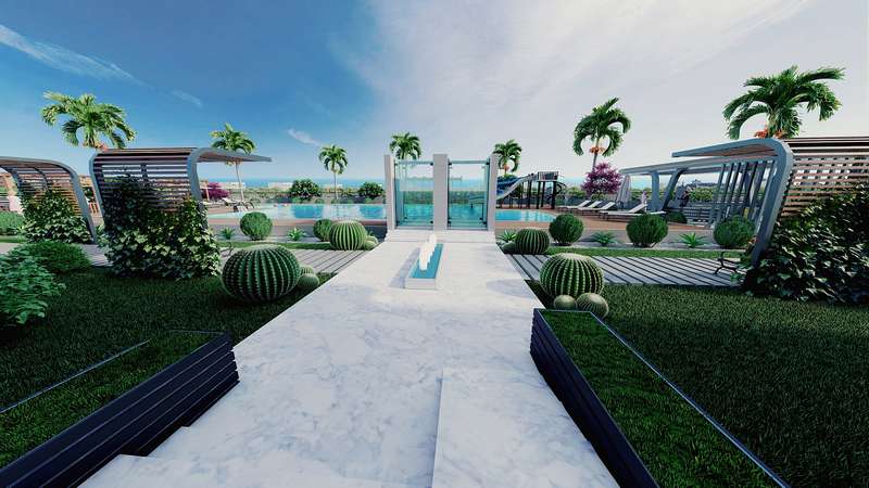 The project includes a total of 138 apartments and offers an aqua park, an outdoor parking lot, a children’s play area, a basketball court, and relaxation areas.