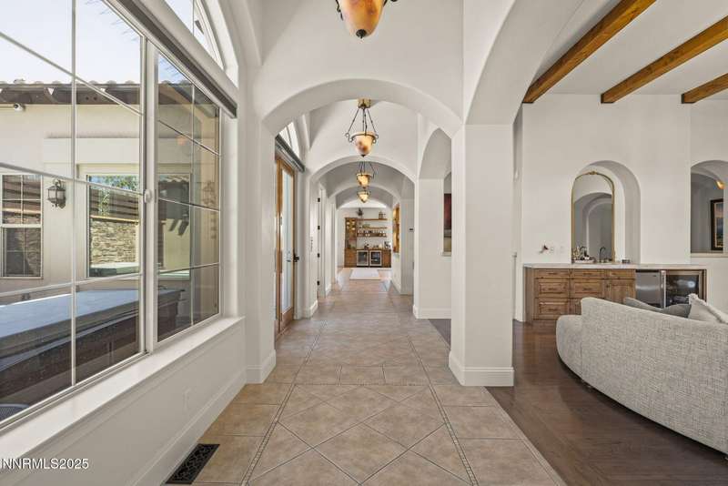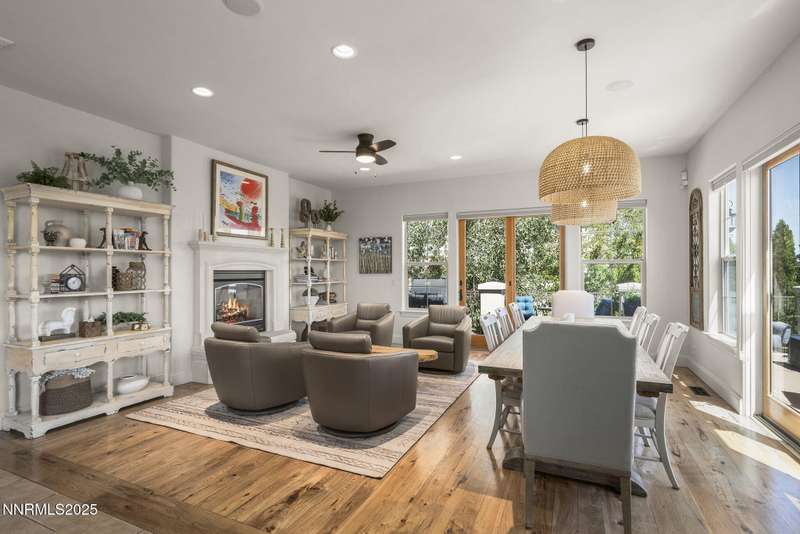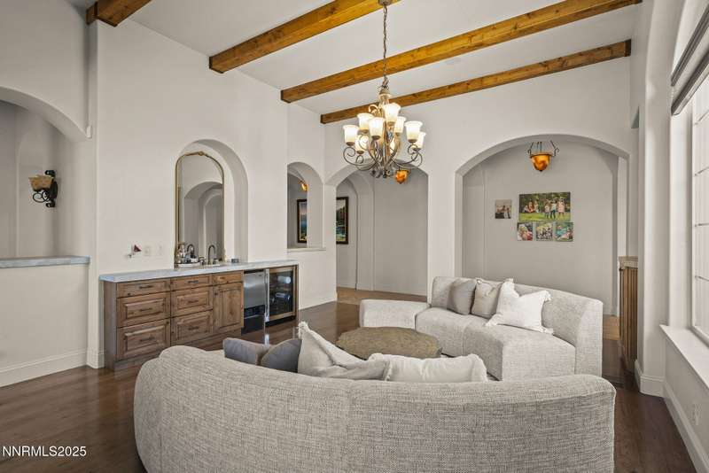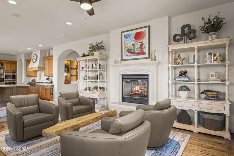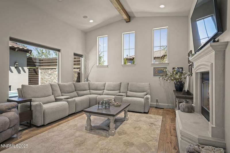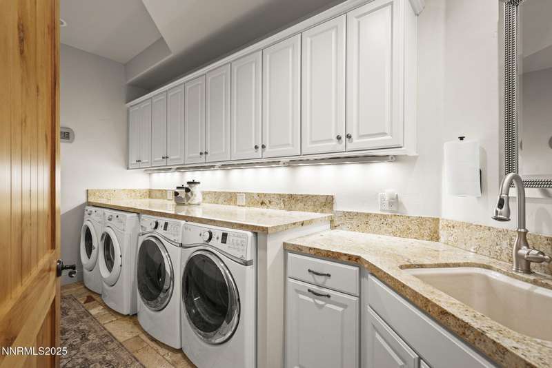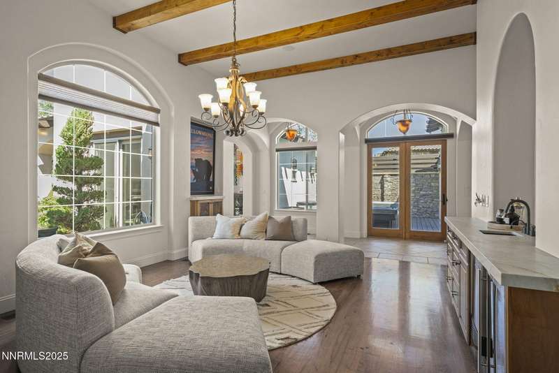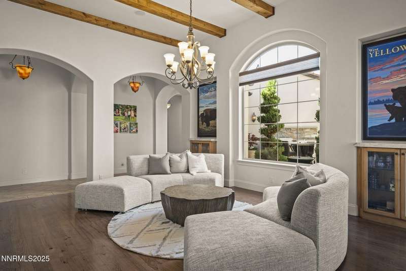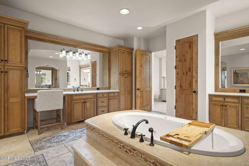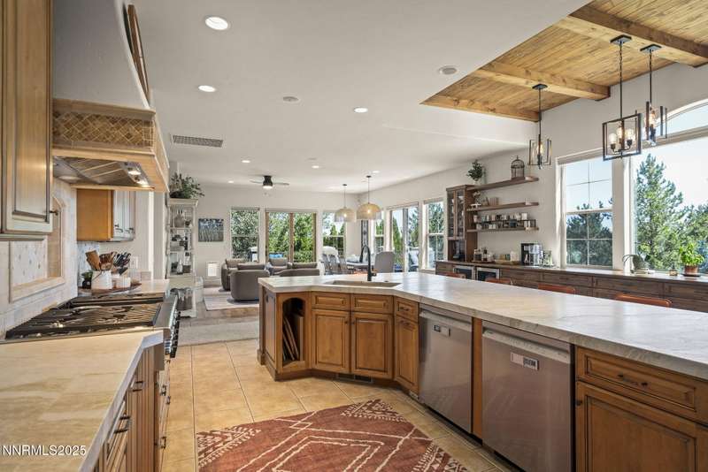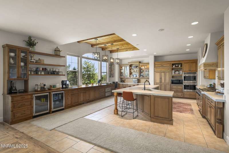 Welcome to this stunning luxury estate property, located in the prestigious Saddlehorn community. Nestled on a serene cul-de-sac, this exquisite 5 bedroom, 5 1/2 bath residence has undergone a multitude of designer renovations, offering the finest in upscale living. The chef's kitchen is a true showpiece—featuring leathered Taj Mahal quartzite countertops, two built-in refrigerators, dual Bosch dishwashers, warming drawers, added custom soft-close cabinetry, and three spacious pantries. Expanded custom built-ins elevate both functionality and elegance, making this kitchen a culinary dream. Relax and unwind in the spa-inspired primary suite on the main level which includes a steam shower, gas fireplace, custom lighting, and sophisticated tilework. Downstairs you will find a spacious in-law suite including its own kitchenette with l Leather Taj Mahal quartzite counter, new sink, dishwasher, and beverage fridge- plus a versatile bonus space perfect for a game room, home theater, or additional living quarters creating the ultimate entertaining space, and two additional private bedrooms with ensuites. Additional interior highlights include a double-sided gas fireplace between the living and great rooms, a custom bunk room with exposed beam detail, a private man cave, updated designer lighting, and extensive electrical upgrades throughout. Step outside to enjoy the resort-style grounds—complete with an expanded paver patio, grand fountain, raised vegetable gardens, privacy hedging, and a swim spa with new pump & cover, custom decking for easy maintenance access. A built-in outdoor BBQ with griddle enhances alfresco living. Premium appliances include two washers, two dryers, five beverage refrigerators, and so much more. This turnkey luxury retreat combines timeless elegance with modern comfort in one of Reno's most sought-after neighborhoods. See newly remodeled upgrade list in documents for additional information.