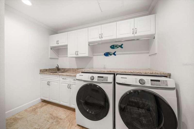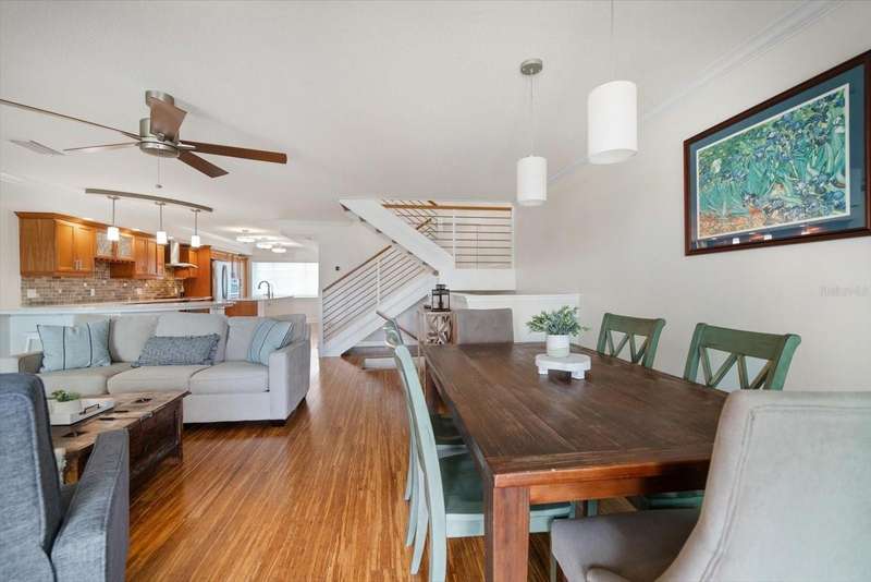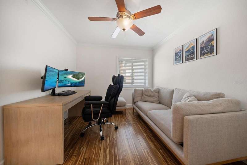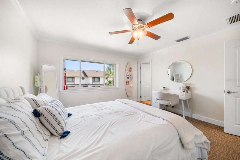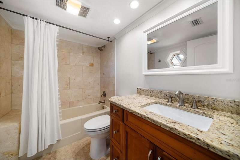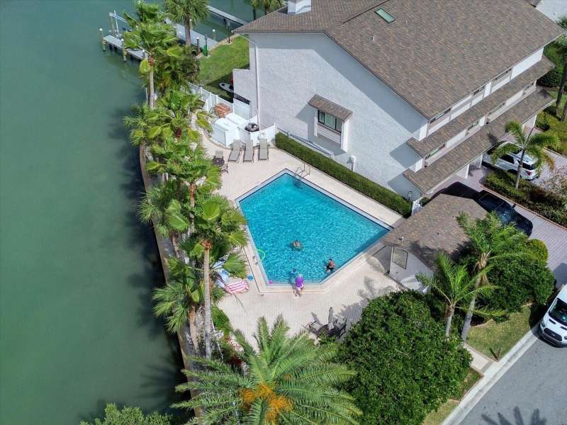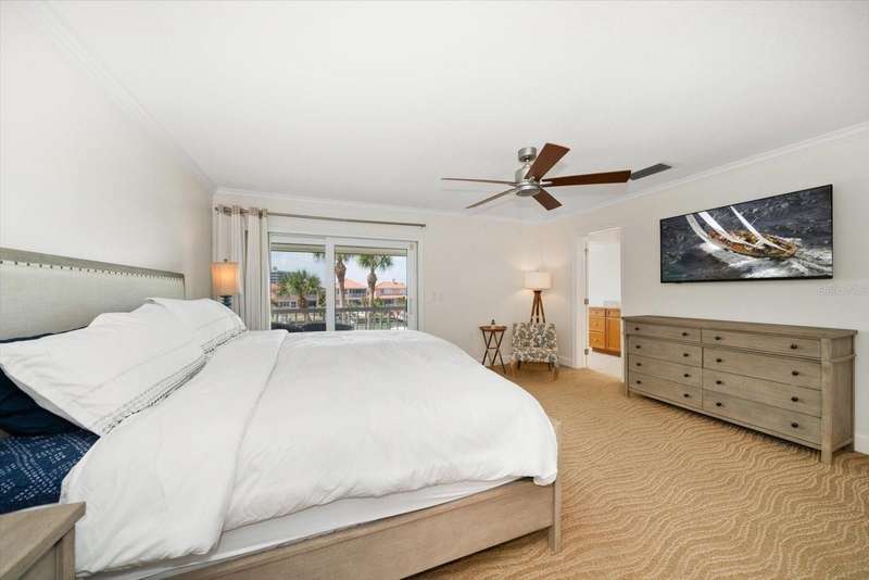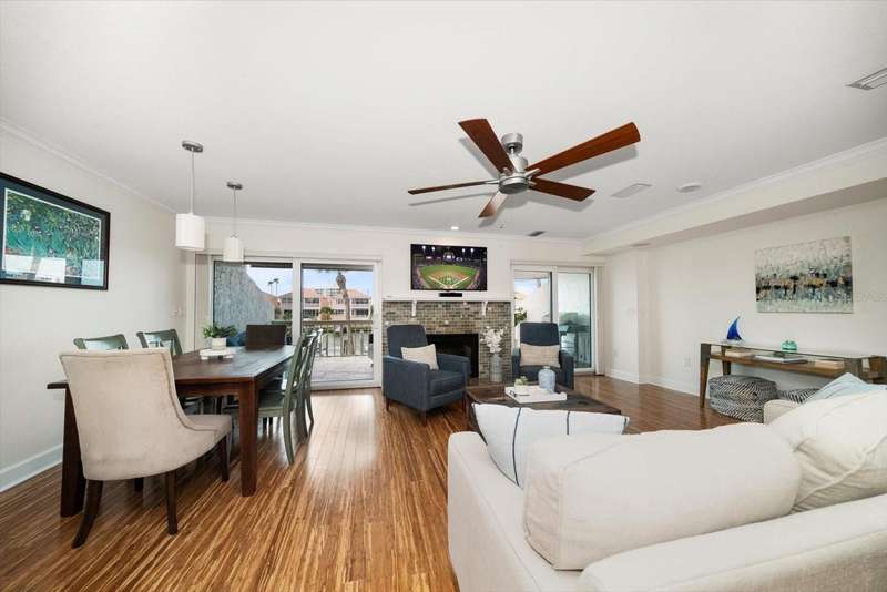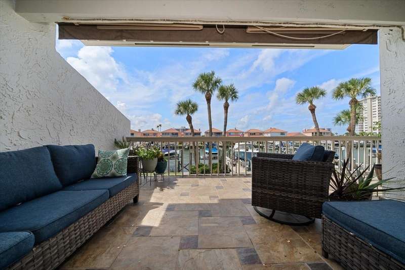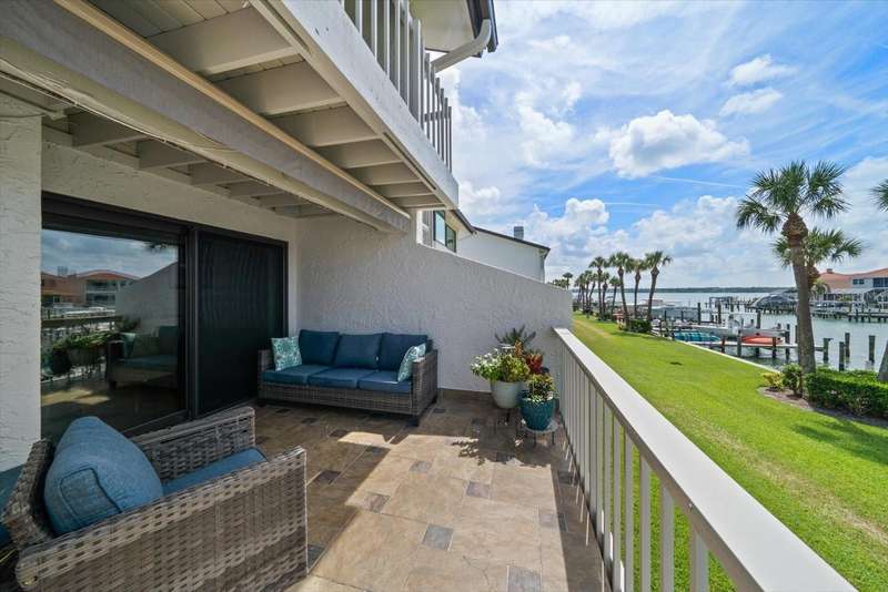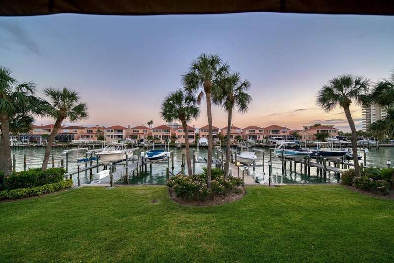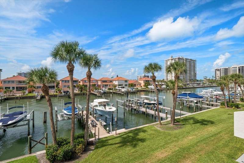 Located just south of Clearwater Beach on scenic Sand Key, this exquisite townhome in Marina del Rey blends coastal elegance with functional design and modern upgrades. Positioned along protected deep-water harborage, the property offers exceptional boating access and year-round sun exposure on its desirable south side. The main living floor features an expansive great room filled with natural light, an office or guest bedroom with a half bath, and an expertly customized kitchen designed for entertaining, featuring Cambria quartz countertops, a semi-circular breakfast bar, a separate island, detailed cabinetry, and a wine refrigerator, which contribute to a high-end culinary experience. From the main balcony—fitted with an electronically operated sunshade—residents can enjoy tranquil Intracoastal views. Upstairs, the spacious primary suite includes a private balcony, a large walk-in closet, and a luxurious en-suite bath complete with a jetted tub, walk-in shower, and dual vanities. An additional guest bedroom with an en-suite bath and a full laundry room completes this level. The ground floor offers a flexible bonus space with its own private entry, ideal for use as an office, fitness studio, or a fourth bedroom. This level also includes an en-suite full bath with a steam shower, offering both comfort and versatility. Other attractive finishes include crown molding, a fresh palette of modern, brighter paint colors throughout the interior, and bamboo flooring that flows seamlessly throughout several areas of the home. A private dock—just steps from the ground-level bonus room—features a 20,000 lb boat lift, composite decking, water, and electric service.. This pet-friendly townhome community offers a stellar location—steps from the heated pool and private beach access, and minutes from shopping, dining, and all the amenities of Clearwater Beach. Perfect as a primary residence or a low-maintenance second home, this Marina del Rey property delivers the best of boating, beach, and upscale coastal living in one beautifully updated package.