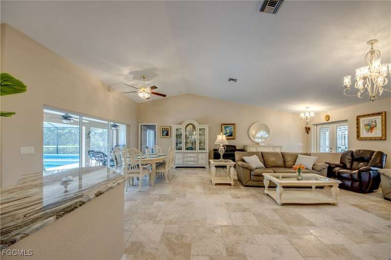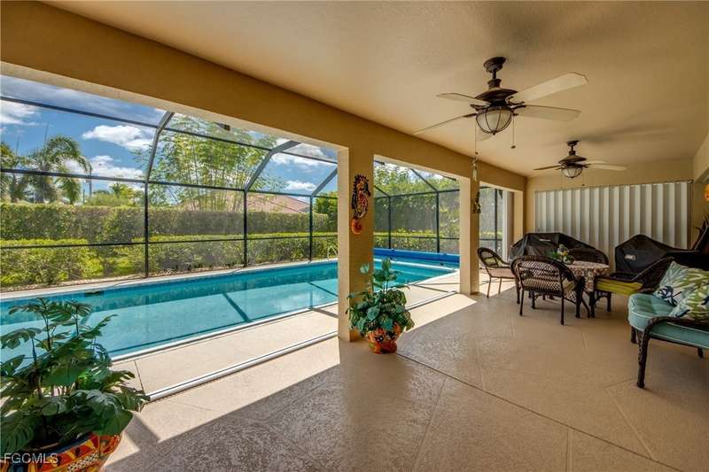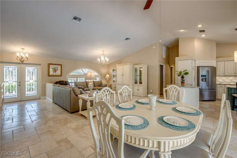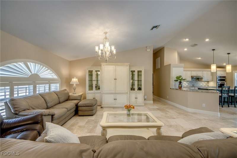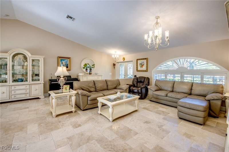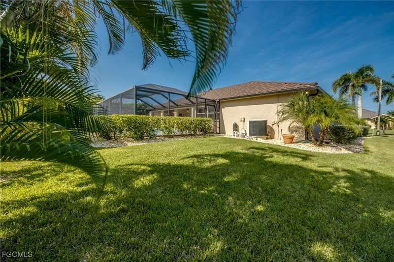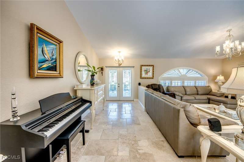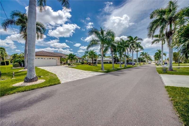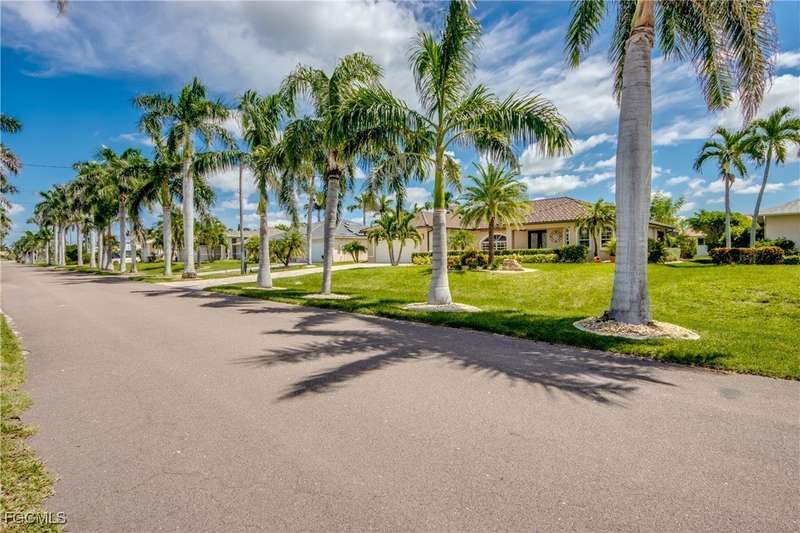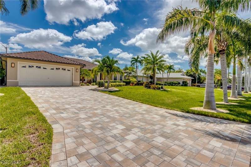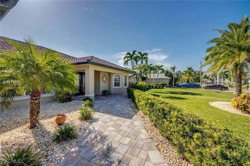Prepare to be whisked away...this stunning Mediterranean inspired 3/2/2 pool home oozes luxury in every square inch. Royal Palm Tree lined street located in one of Cape Coral's premiere zip codes...amazing hand laid paver drive, entry walk way and lush tropical landscaping featuring Royal Palms invite a peek of what's inside. Huge double door entry opens to grand open air concept home with 13' ceiling plus large windows and sliders that blur the lines between interior and exterior Florida living showcasing an amazing 40 x 20 lanai and massive 30 x 14 heated pool. Rich Tuscany Travertine tile and Custom Wood Bahama Shutters add just the right touch. Chef Inspired Kitchen features elegant granite counters, massive island for entertaining, carefully coordinated crafted wood cabinetry and top of the line KitchenAid stainless steel appliance package with highly desirable induction cooktop. Private Master suite with pool access, his/hers master closets and an en suite that rivals most 5 star spas. 2 addition private rooms, one acts acts as an office with convenient double Murphy beds, share addition full bath. Well thought out oversized garage with epoxy flooring and independent mini split AC to store your "toys"! New 140 MPH rated 40 year barrel style roof and seamless gutters in 2023. PEX Manifold Plumbing System. Freshly painted inside and out. All Assesssments PAID IN FULL.