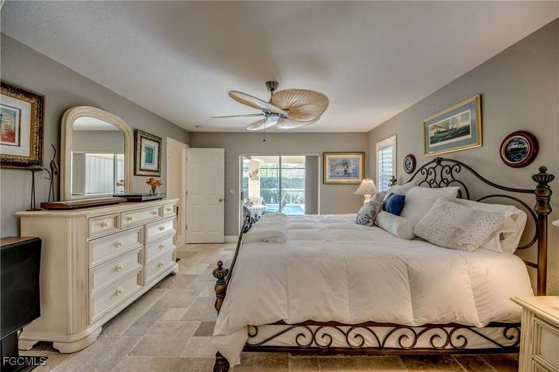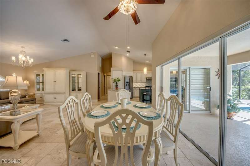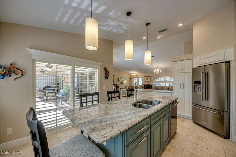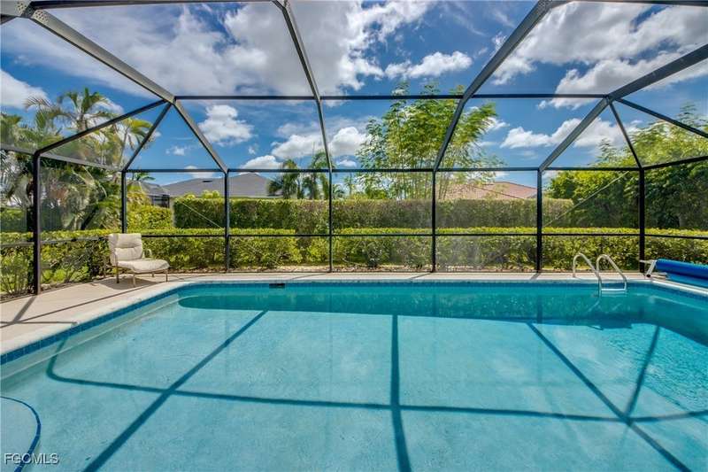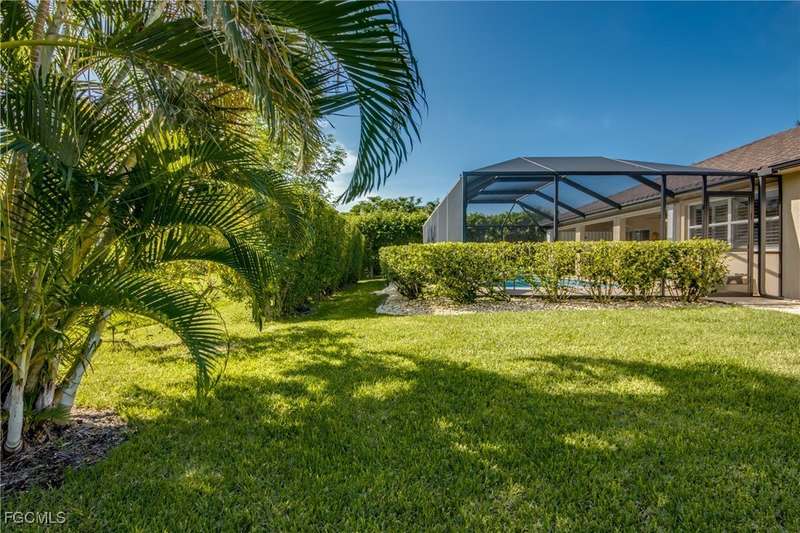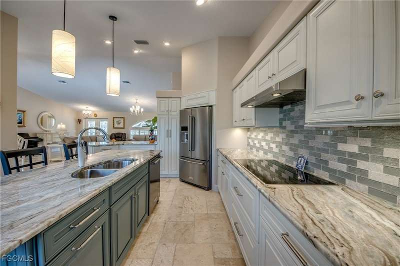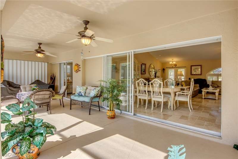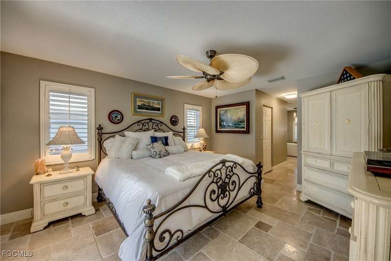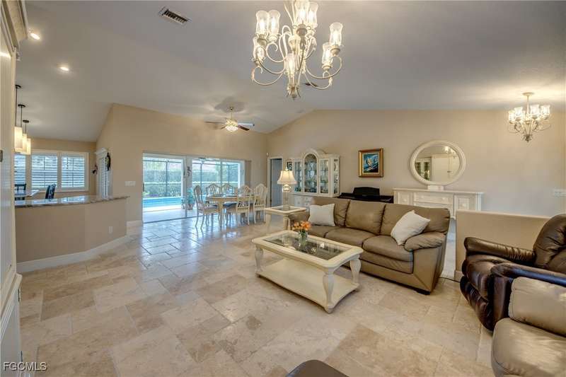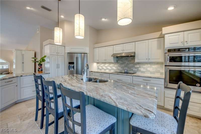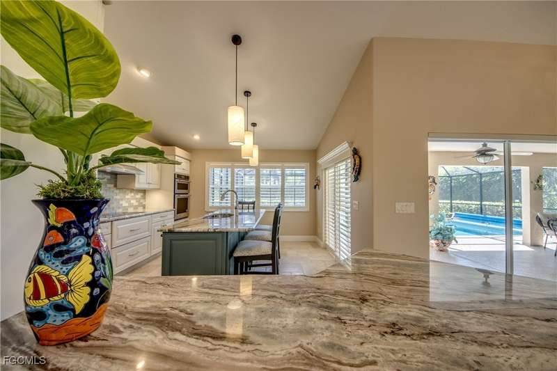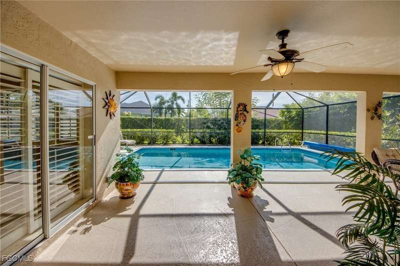 Prepare to be whisked away...this stunning Mediterranean inspired 3/2/2 pool home oozes luxury in every square inch. Royal Palm Tree lined street located in one of Cape Coral's premiere zip codes...amazing hand laid paver drive, entry walk way and lush tropical landscaping featuring Royal Palms invite a peek of what's inside. Huge double door entry opens to grand open air concept home with 13' ceiling plus large windows and sliders that blur the lines between interior and exterior Florida living showcasing an amazing 40 x 20 lanai and massive 30 x 14 heated pool. Rich Tuscany Travertine tile and Custom Wood Bahama Shutters add just the right touch. Chef Inspired Kitchen features elegant granite counters, massive island for entertaining, carefully coordinated crafted wood cabinetry and top of the line KitchenAid stainless steel appliance package with highly desirable induction cooktop. Private Master suite with pool access, his/hers master closets and an en suite that rivals most 5 star spas. 2 addition private rooms, one acts acts as an office with convenient double Murphy beds, share addition full bath. Well thought out oversized garage with epoxy flooring and independent mini split AC to store your "toys"! New 140 MPH rated 40 year barrel style roof and seamless gutters in 2023. PEX Manifold Plumbing System. Freshly painted inside and out. All Assesssments PAID IN FULL.