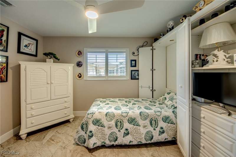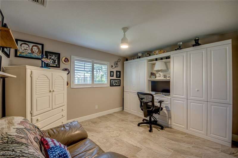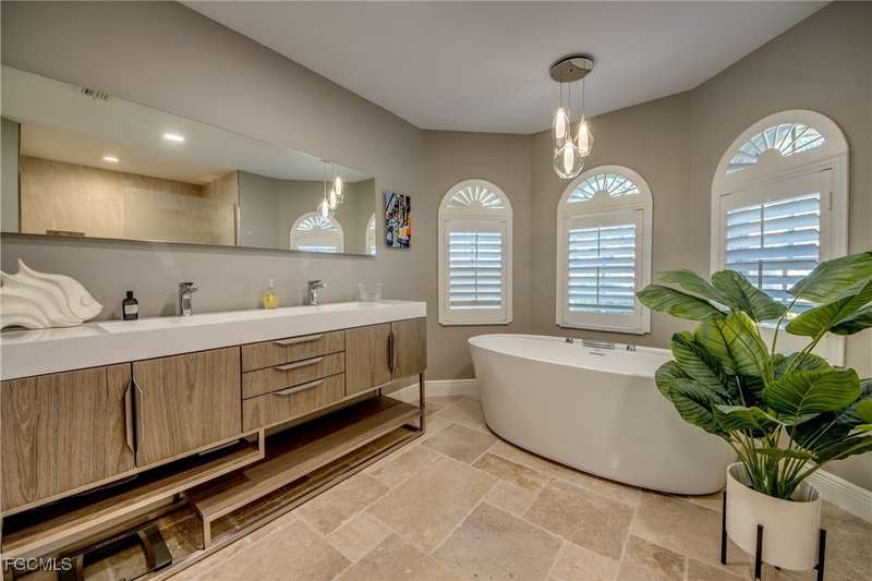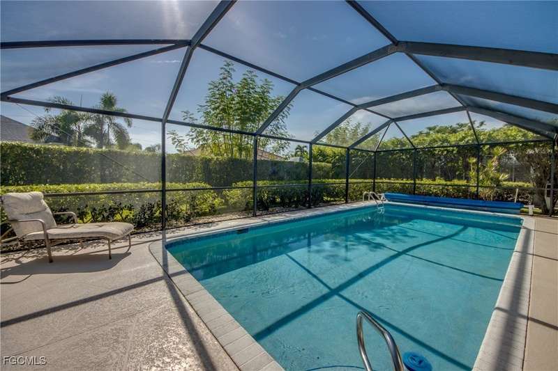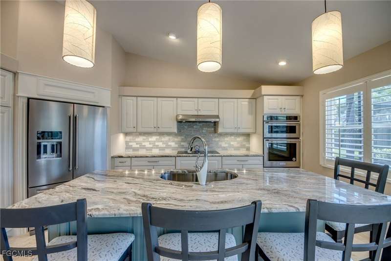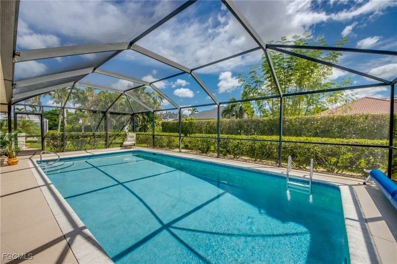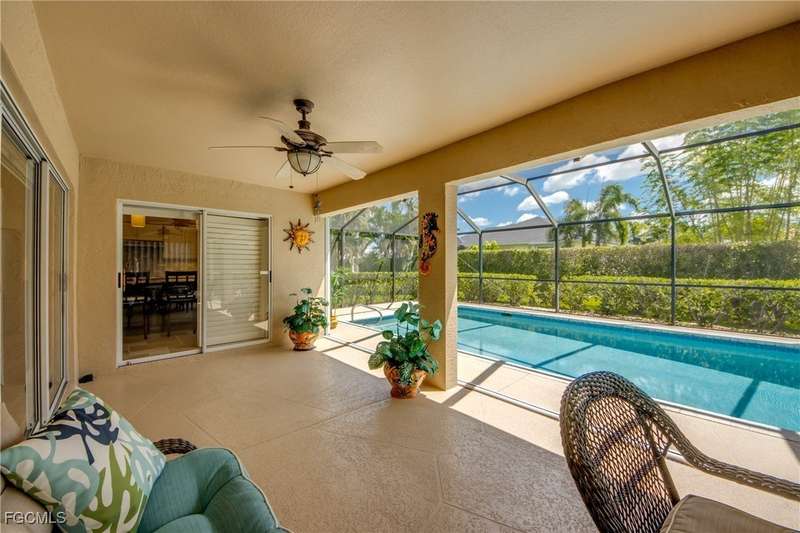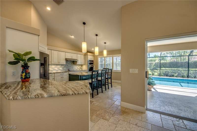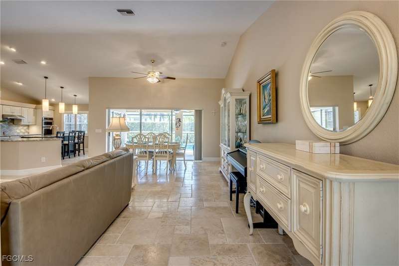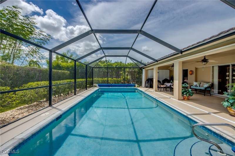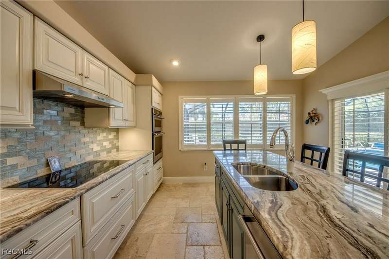 Prepare to be whisked away...this stunning Mediterranean inspired 3/2/2 pool home oozes luxury in every square inch. Royal Palm Tree lined street located in one of Cape Coral's premiere zip codes...amazing hand laid paver drive, entry walk way and lush tropical landscaping featuring Royal Palms invite a peek of what's inside. Huge double door entry opens to grand open air concept home with 13' ceiling plus large windows and sliders that blur the lines between interior and exterior Florida living showcasing an amazing 40 x 20 lanai and massive 30 x 14 heated pool. Rich Tuscany Travertine tile and Custom Wood Bahama Shutters add just the right touch. Chef Inspired Kitchen features elegant granite counters, massive island for entertaining, carefully coordinated crafted wood cabinetry and top of the line KitchenAid stainless steel appliance package with highly desirable induction cooktop. Private Master suite with pool access, his/hers master closets and an en suite that rivals most 5 star spas. 2 addition private rooms, one acts acts as an office with convenient double Murphy beds, share addition full bath. Well thought out oversized garage with epoxy flooring and independent mini split AC to store your "toys"! New 140 MPH rated 40 year barrel style roof and seamless gutters in 2023. PEX Manifold Plumbing System. Freshly painted inside and out. All Assesssments PAID IN FULL.
