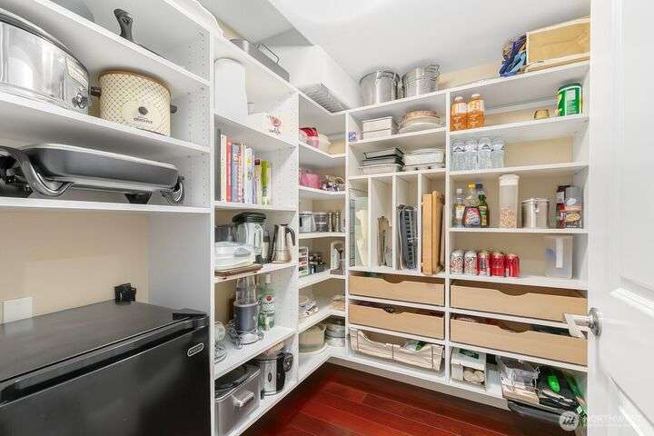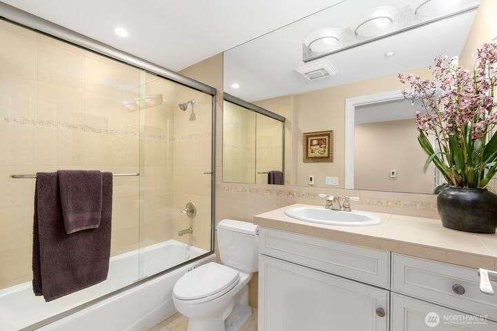 Tastefully updated two-bedroom two-bath home offers a desirable open floor plan, wood flooring, gas fireplace & enjoys the solitude of being the only home on this floor. Gourmet kit is designed w/ entertaining in mind & features quartz counters w/ tile back splash, painted cabs, stainless appliances w/gas cooktop & opens to the liv & din rooms & the covered southeast facing deck w/ city views. Primary suite w/lux bath & walk-in closet w/ built ins. The second bedroom is serviced by a full bath w/ tile accents. Pantry & laundry rooms are spacious & offer built-ins. 2 car gar parking & w/ storage locker. This exceptional residence is conveniently located to Magnolia Village, Amazon, Expedia, South Lake Union, Discovery Park & Downtown!