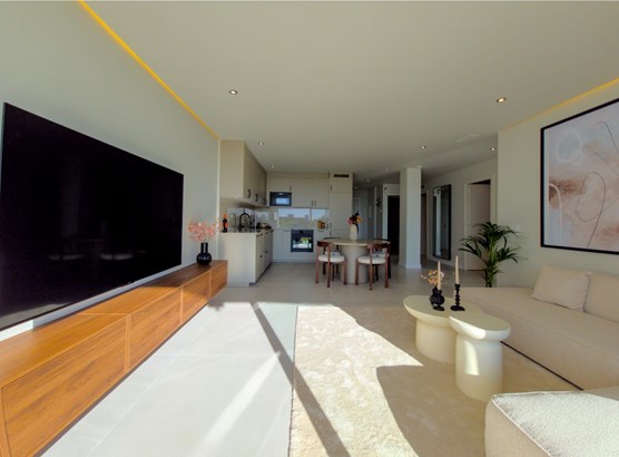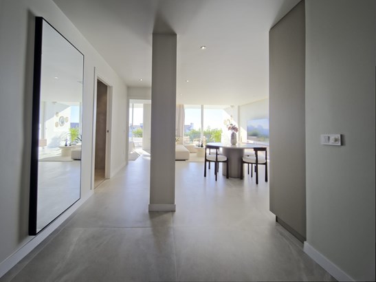 Discover this brand-new feeling home, fully renovated to the highest standards and never lived in since the renovation. With 3 bedrooms and 2 bathrooms, this residence combines elegance, comfort, and modern design. Every detail has been renewed—plumbing, electricity, flooring, and finishes—so it feels like a new-build property with the finest quality materials throughout.The spacious living room flows seamlessly onto a large south-facing terrace, offering panoramic views of the Mediterranean Sea and the surrounding mountains. Expansive windows flood the home with natural light, creating an airy, open atmosphere. The sleek kitchen is fully fitted with brand new appliances, while the stylish bathrooms feature underfloor heating. Built in wardrobes with LED lighting and modern indirect ceiling lights enhance both comfort and sophistication.Sold with new designer furniture, this home is completely move-in ready. Located within a secure gated community with beautifully landscaped garden