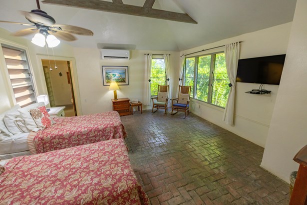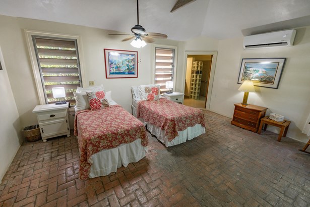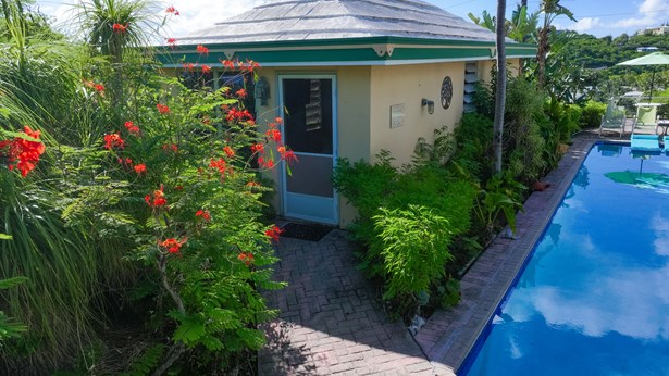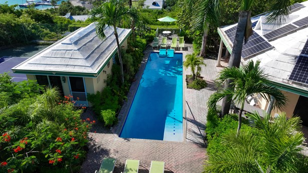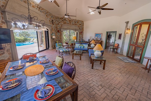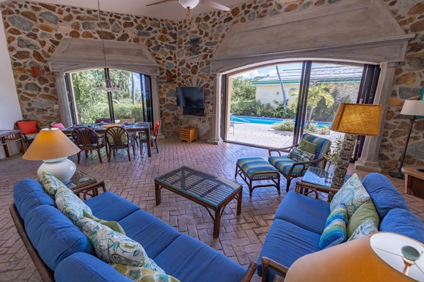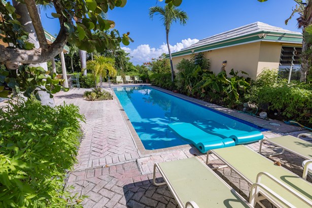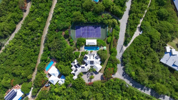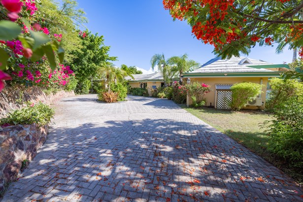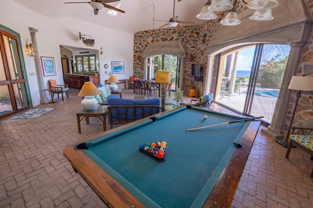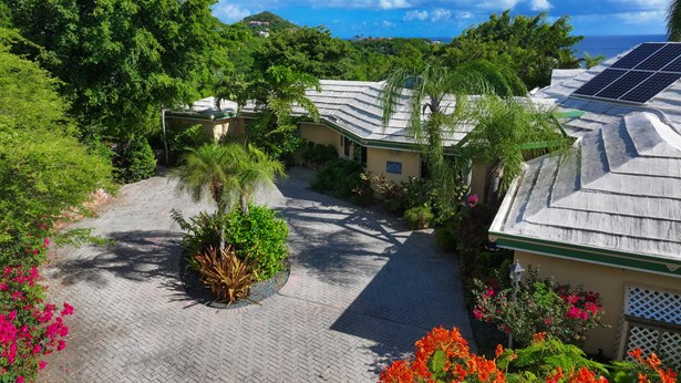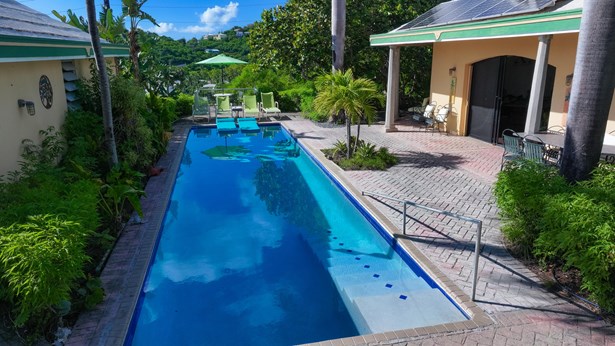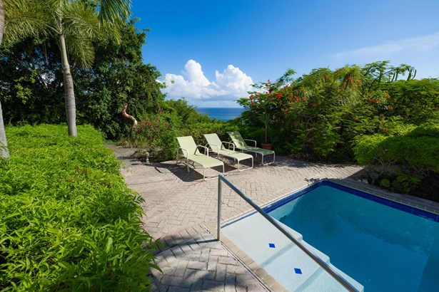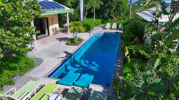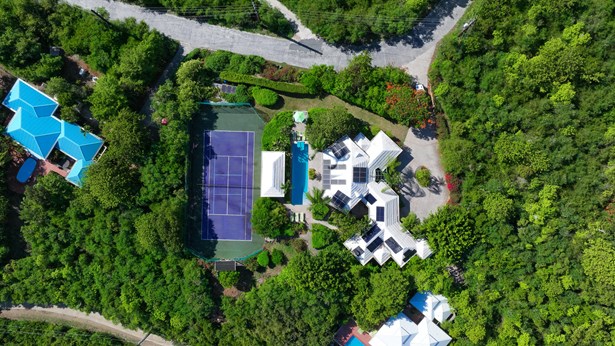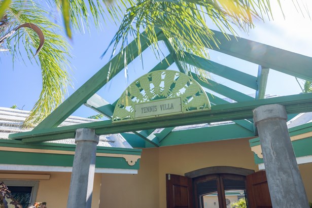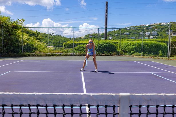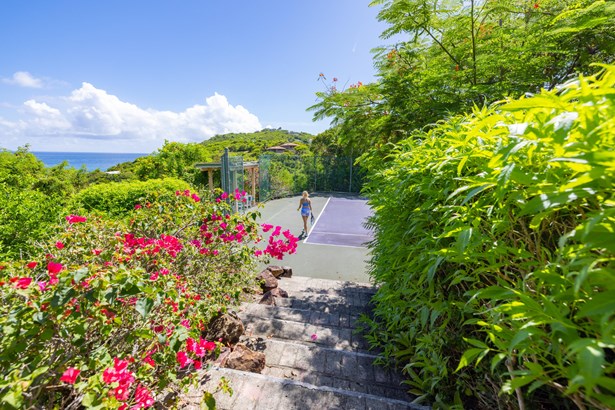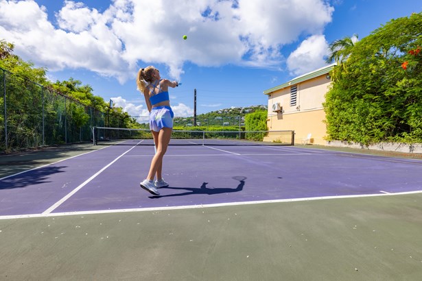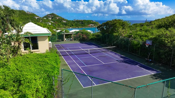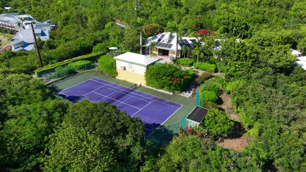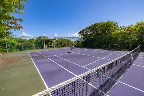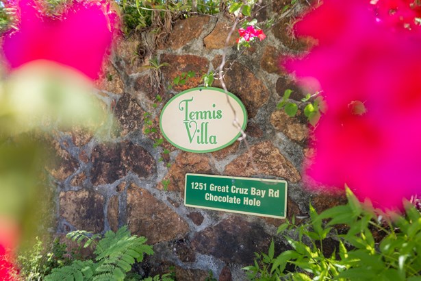 Tennis Villa is a classic Chocolate Hole estate offering an exceptional blend of space, privacy, and recreation. This single-level home features a gourmet kitchen, vaulted-ceiling living areas, and a sunny south-facing courtyard with a 43-foot pool. A detached pool house provides the 4th bedroom and bath. The regulation-sized tennis court was resurfaced in 2023 and includes pickleball markings. Solar panels with Tesla battery backup ensure year-round comfort and safety with a concrete roof. Enjoy lush landscaping setting, harbor views, and a prime location just minutes from Cruz Bay and walking distance to boating access in Great Cruz Bay.