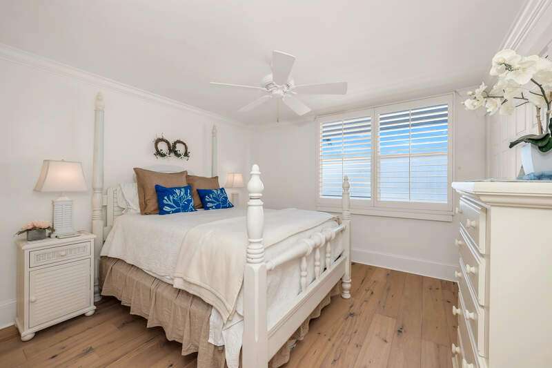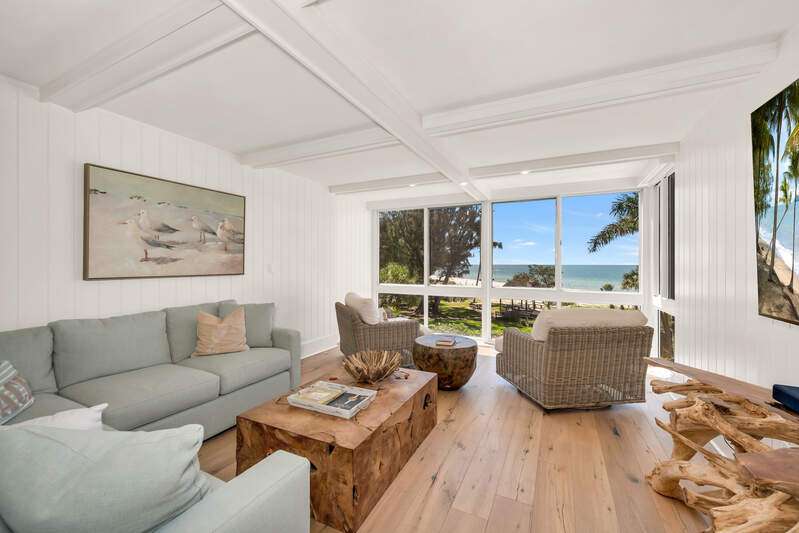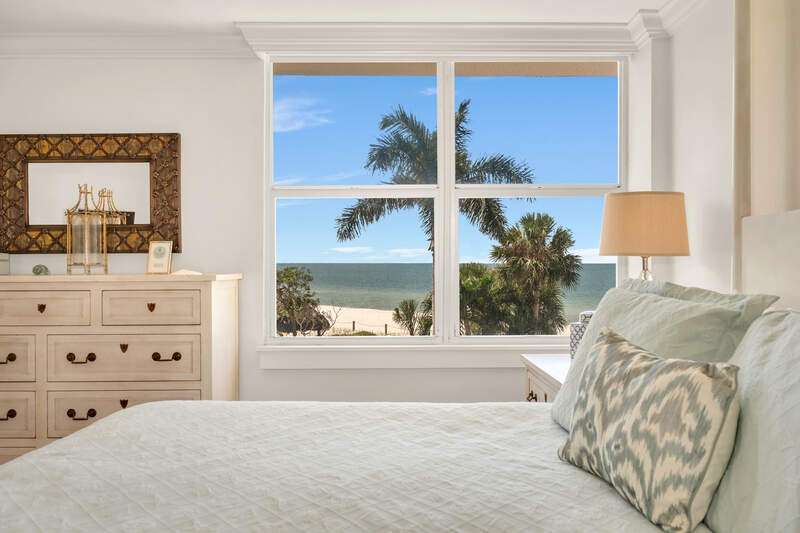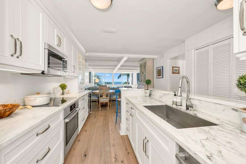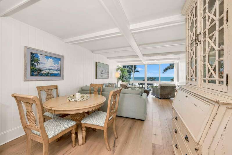 Step into this impeccably renovated 2-bedroom, 2-bath residence in the coveted Royal Palm Club. Spanning 1,143 sq ft, the home has been thoughtfully transformed to blend luxury with coastal ease. A. Vernon Allen Builders led the restoration, installing European white oak wide-plank flooring and custom whitewashed beams that articulate a vaulted ceiling, diffuse natural light, and feature integrated LED uplighting. Shiplap-accented walls and a designer kitchen clad in marble countertops set the stage for Sub-Zero and Bosch appliances, complemented by a wine captain for effortless entertaining. Each bathroom has been reimagined as a private spa retreat, featuring granite-topped vanities, rich wood cabinetry, and stone-tiled showers that resonate with relaxed seaside sophistication. Residents enjoy direct access to private Moorings Beach Park, alongside community amenities including a beachfront pool, bike storage, and a library. Within minutes, discover the boutiques of 3rd St and 5th Ave S, the cafes of Venetian Village, and the dining and retail at Waterside Shops.