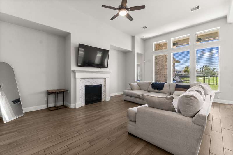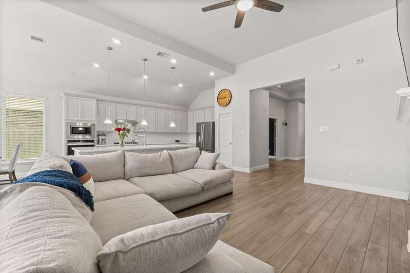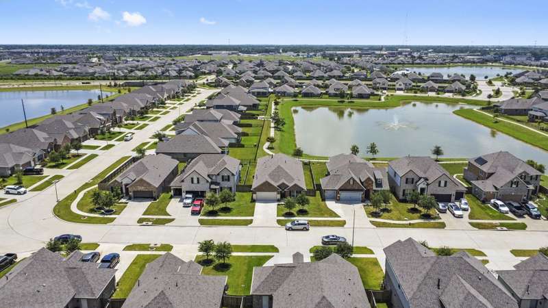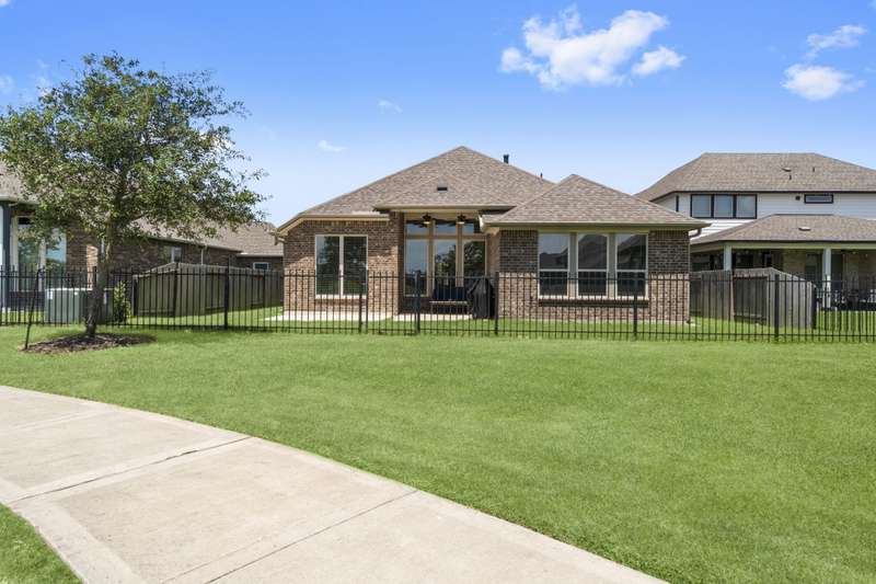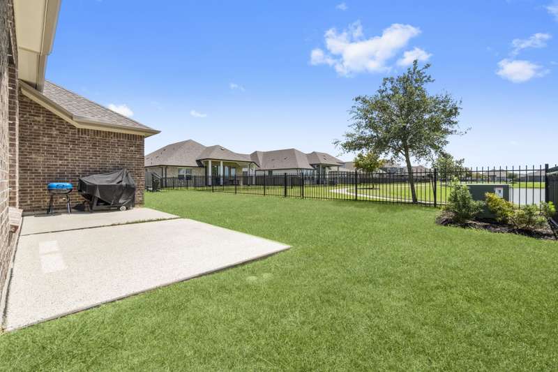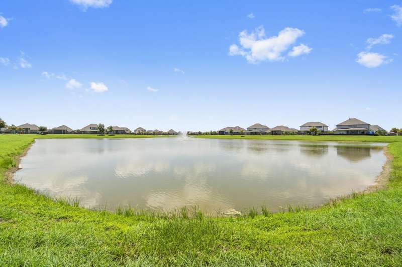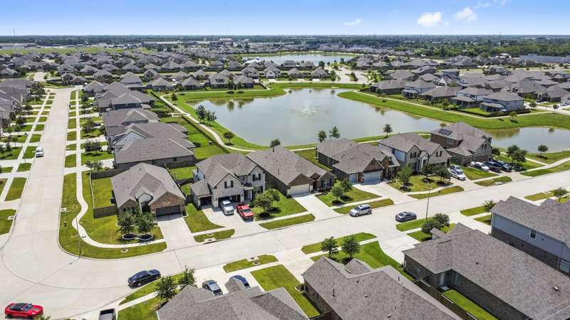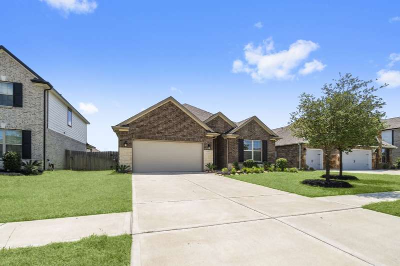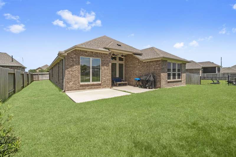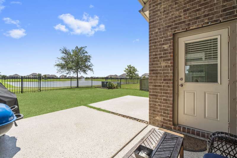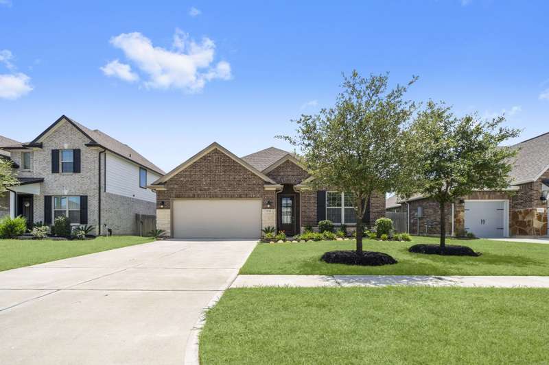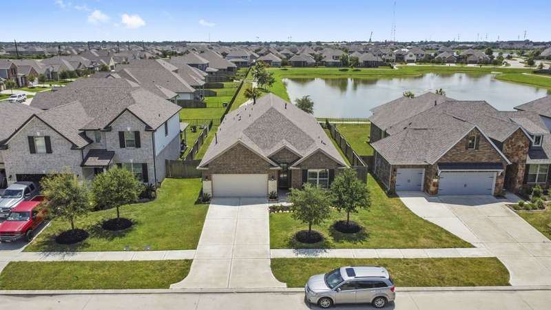 One-of-a-kind floor plan in Bluewater Lakes! This 4-bed, 3.5-bath single-story stunner backs to a serene lake and blends comfort with custom detail. Built in 2021, it features soaring vaulted ceilings, an open layout with a fireplace, and a flexible bonus room ideal for media, play, or work. The chef's kitchen impresses with a large island, breakfast bar, and a full appliance package--fridge, washer, and dryer included! The lakeside primary suite offers a spa-like bath and oversized walk-in closet. A secondary bedroom with a private bath is perfect for guests or multigenerational living. Storm shutters installed and builder warranties still active for peace of mind. Community pools, trails, and top-rated Alvin ISD schools. Minutes to Pearland Town Center, H-E-B, and Hwy 288.