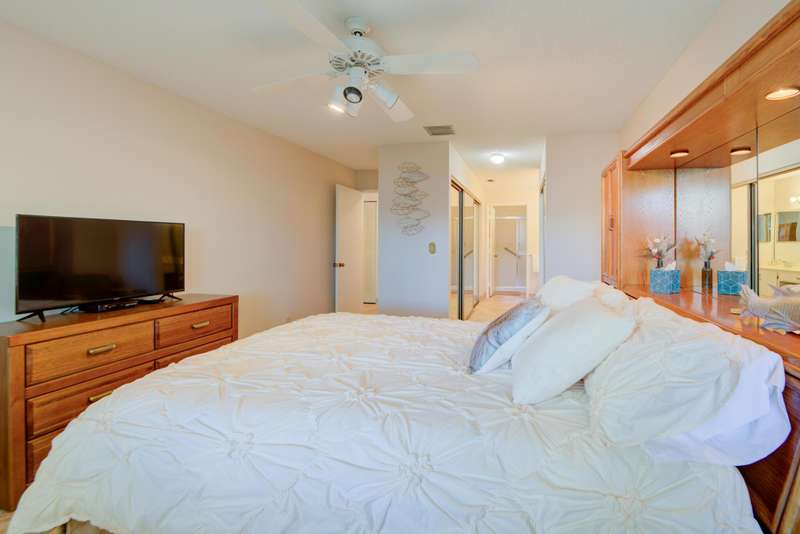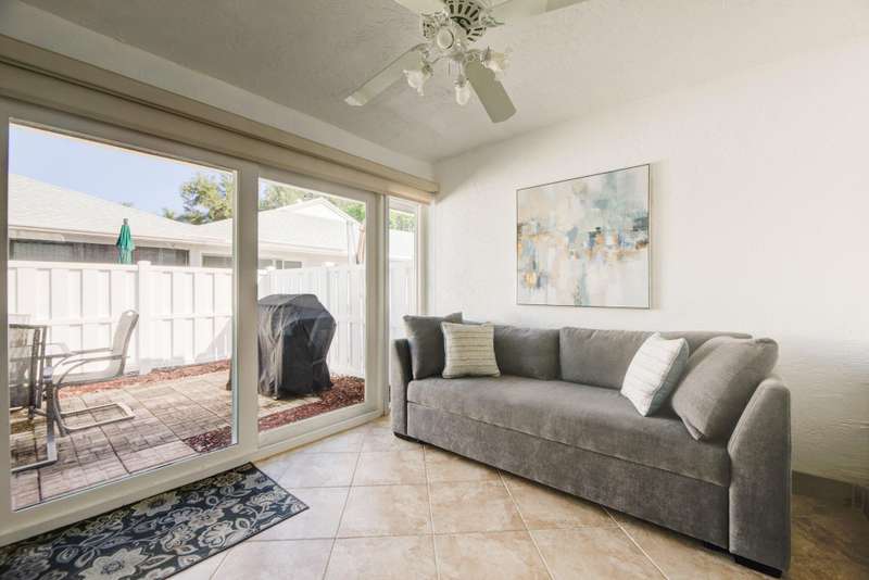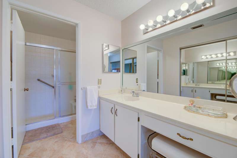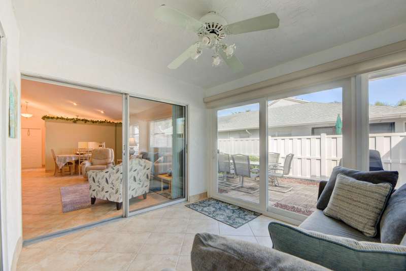 Beautifully maintained 2/2 Corner Villa in desireable Whisper Walk W/GARAGE. Impeccably maintained - only used seasonaly. Nice laundry utility closet in hallway. The property is offered with contents, providing a truly turnkey opportunity for the discerning buyer! Greenhouse window for the garden enthusiest. Private fenced patio with pavers, table and grill. Home warrantee through Dec. Assoc. includes Water, cable/HBO, HS Interner. Clubhouse, Community Room, Gym, Billiards, Library; Pool, Tennis. Racquetball. Assoc. iincludes water, lawn maintenance, landscaping and sprinklers + exterior painting!!!! New roof/gutters with small balance. Great location close to shopping, restaurants. Also near Burt Aaronson Park. This villa will not last, book a showing today!!Car in garage, NOT incl